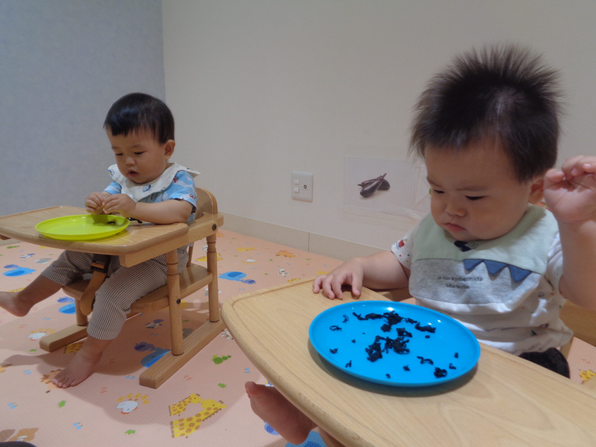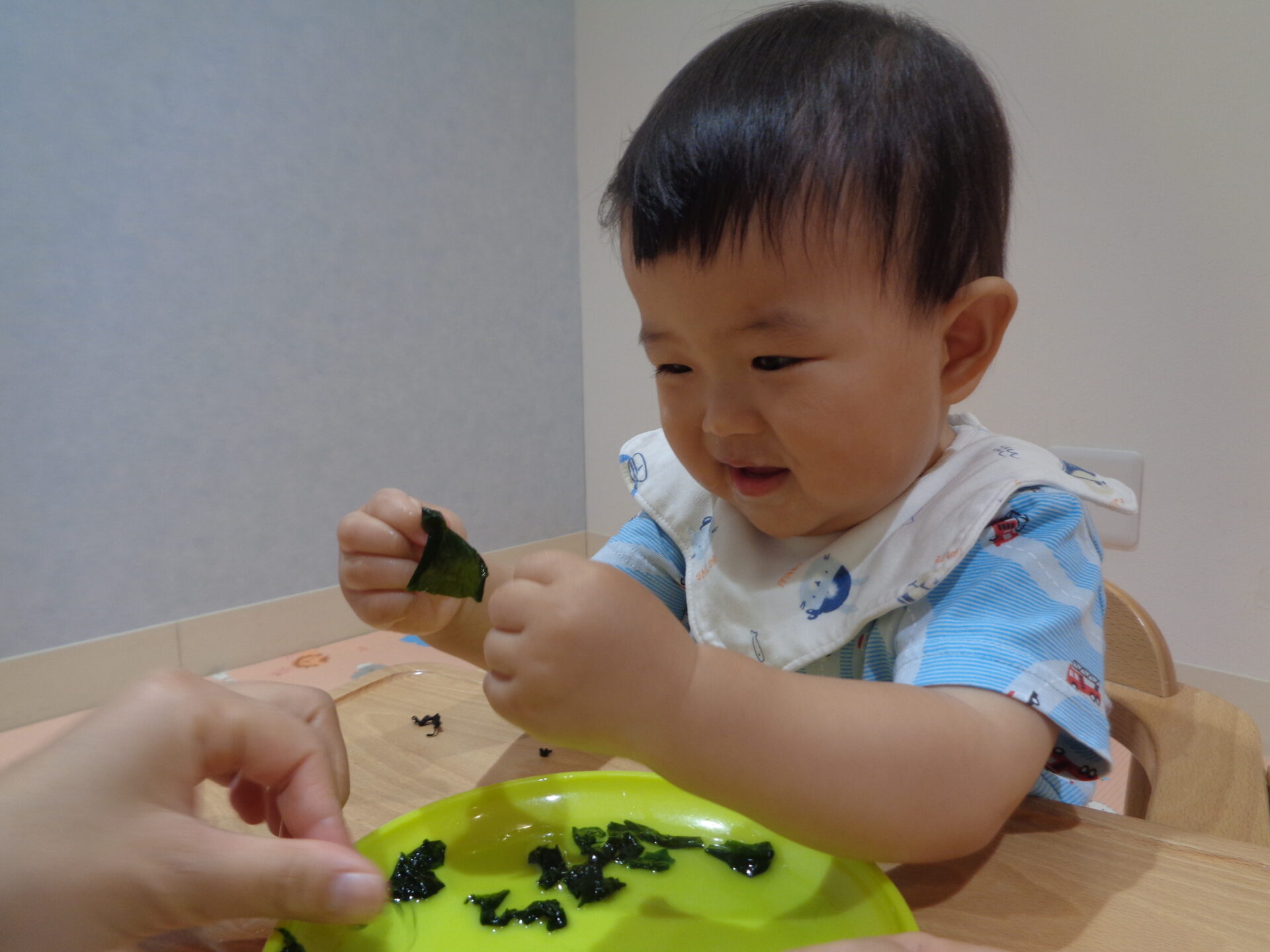 乾燥わかめをお皿の上に置き、渡すと、不思議そうな表情で触ったり…