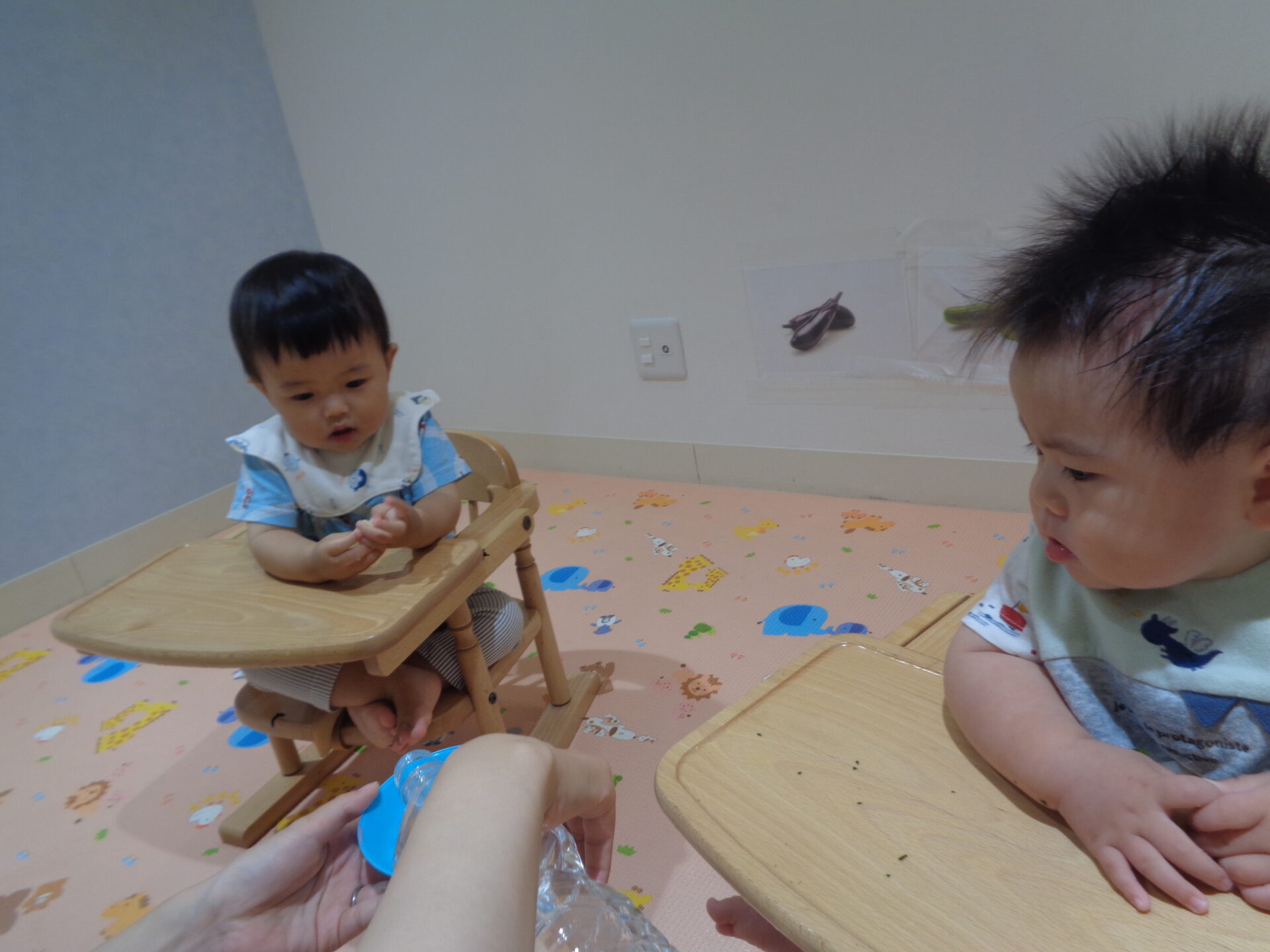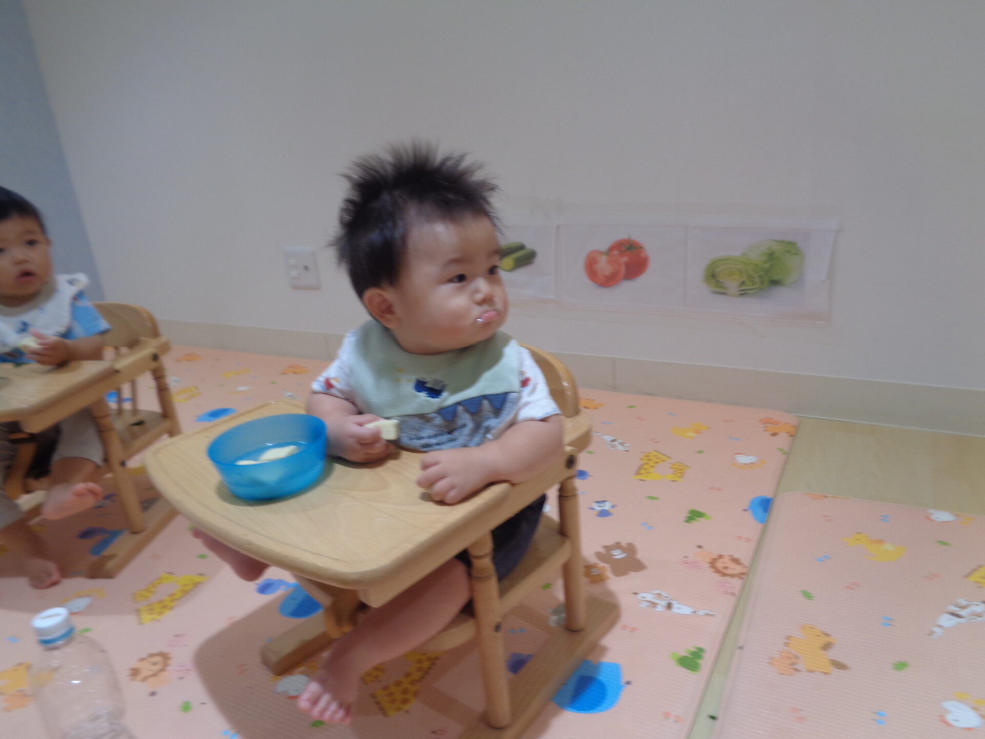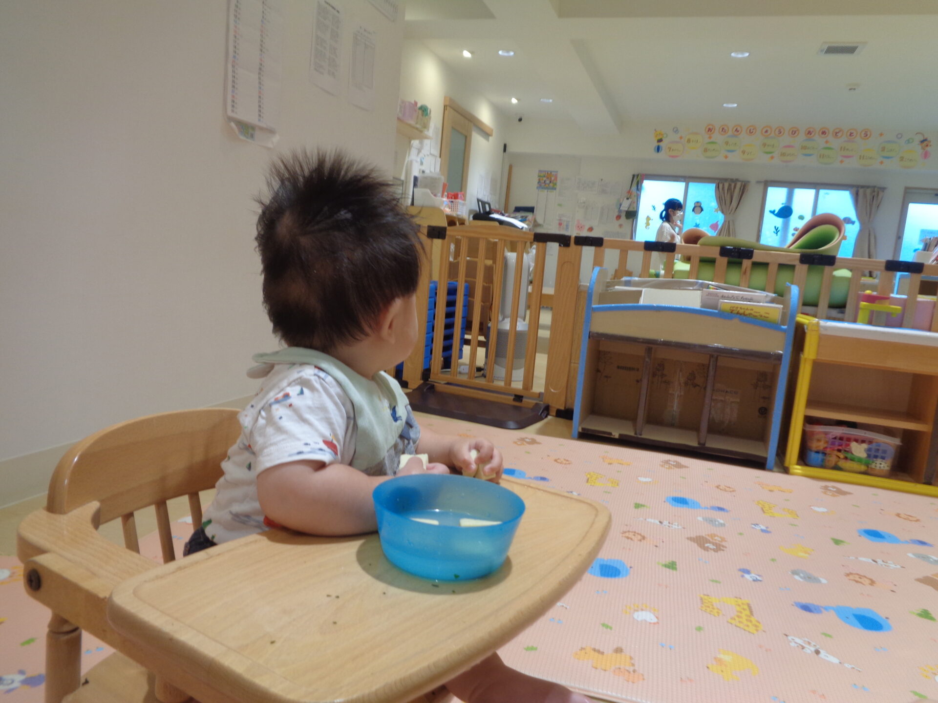 食育をしている時に、隣の部屋から楽しい音楽が聞こえ、横を振り向き、じっと見ていました!