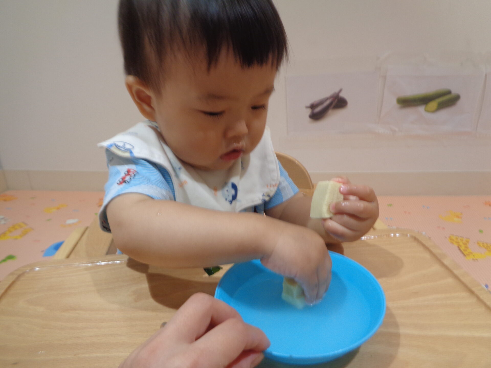 水分を含んだ高野豆腐の感触は気持ち良かったようで、何度も握っていました。