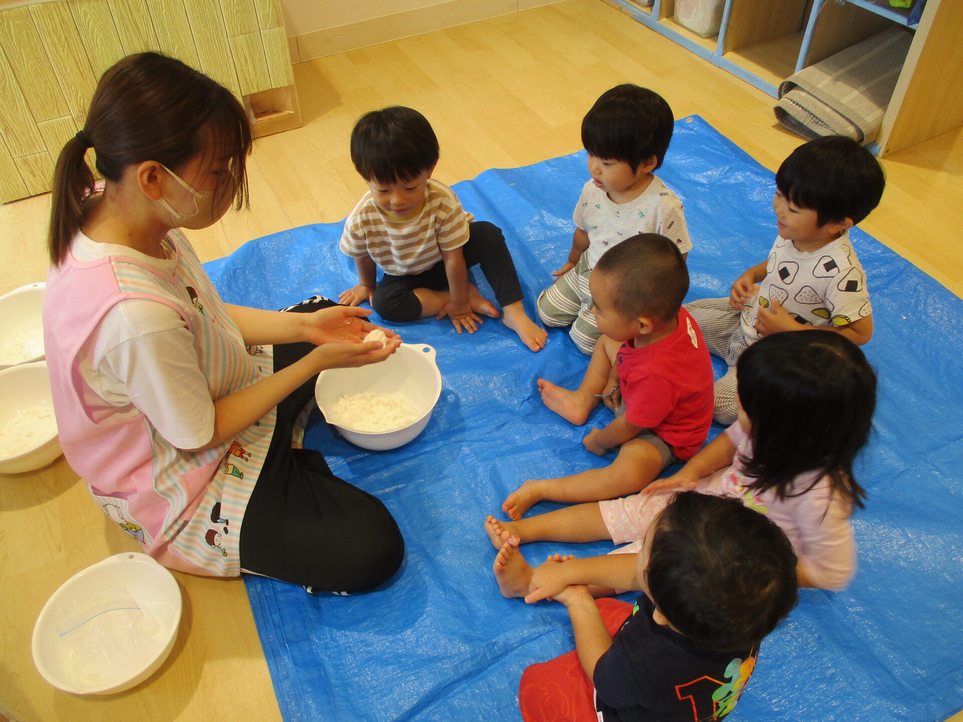 保育者が見本で「見て~!丸くなった!」と見せると
