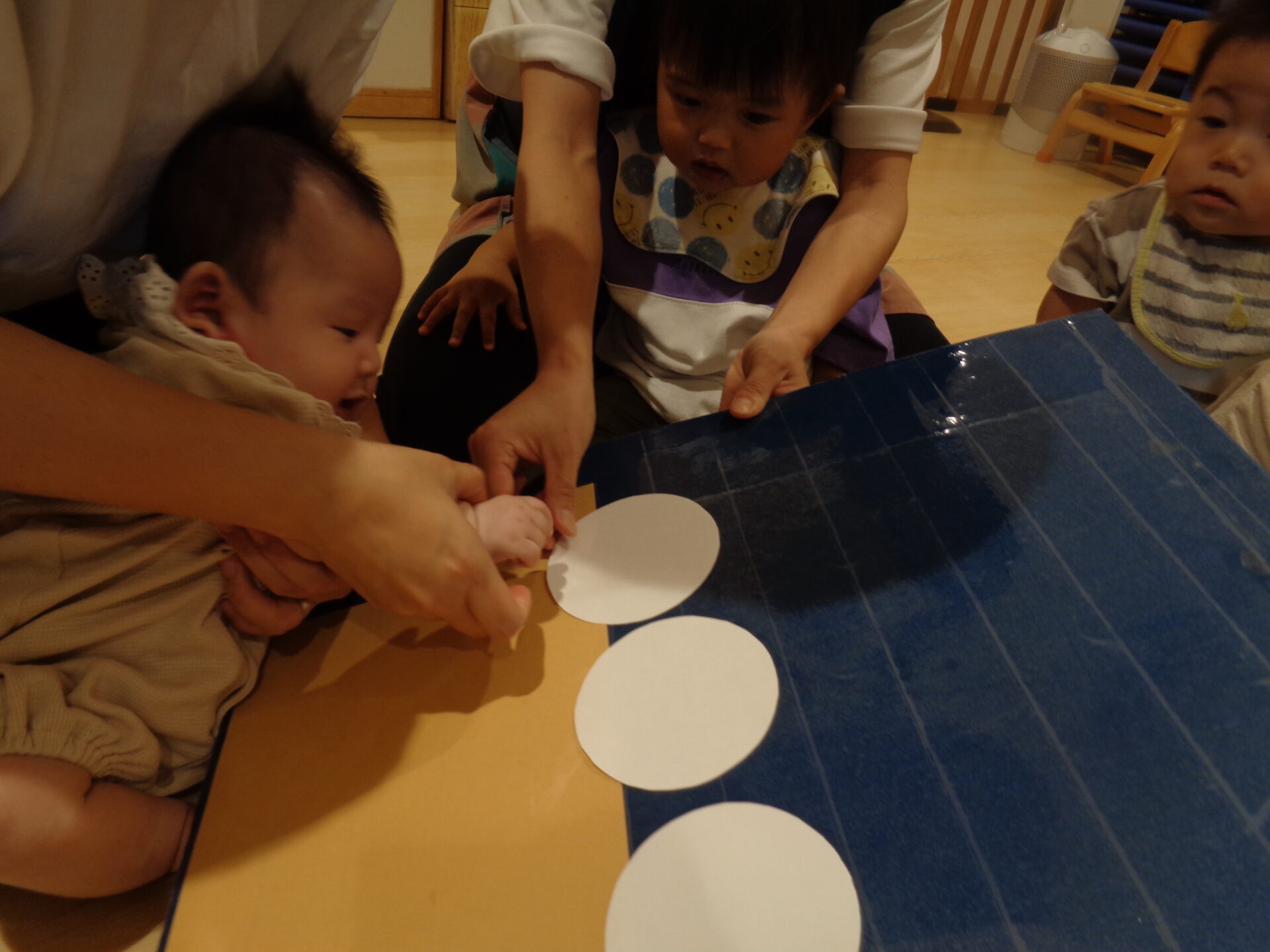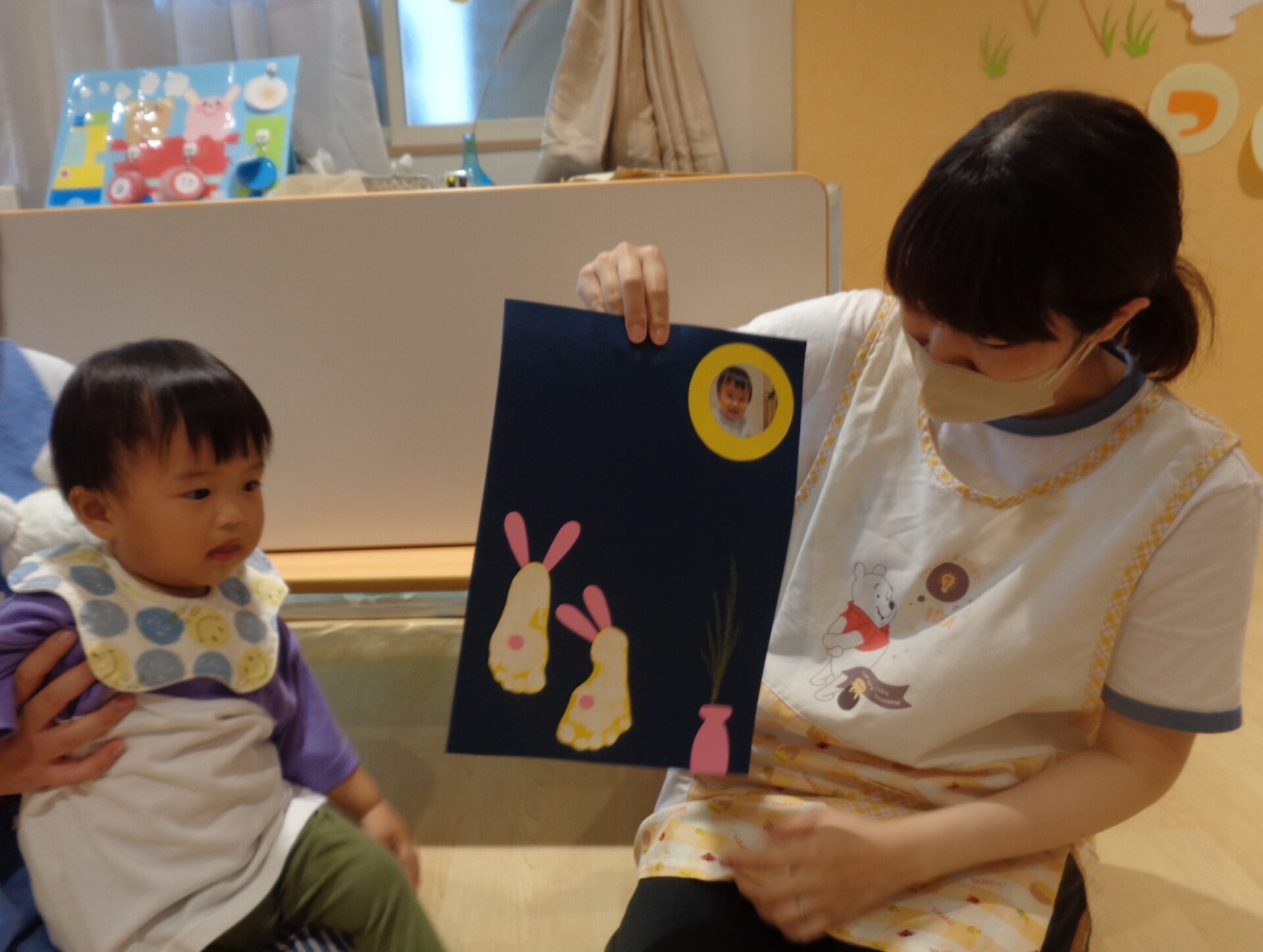 ジップロックに紙皿と絵の具を入れ着色した月に、うさぎとお団子を貼りました。