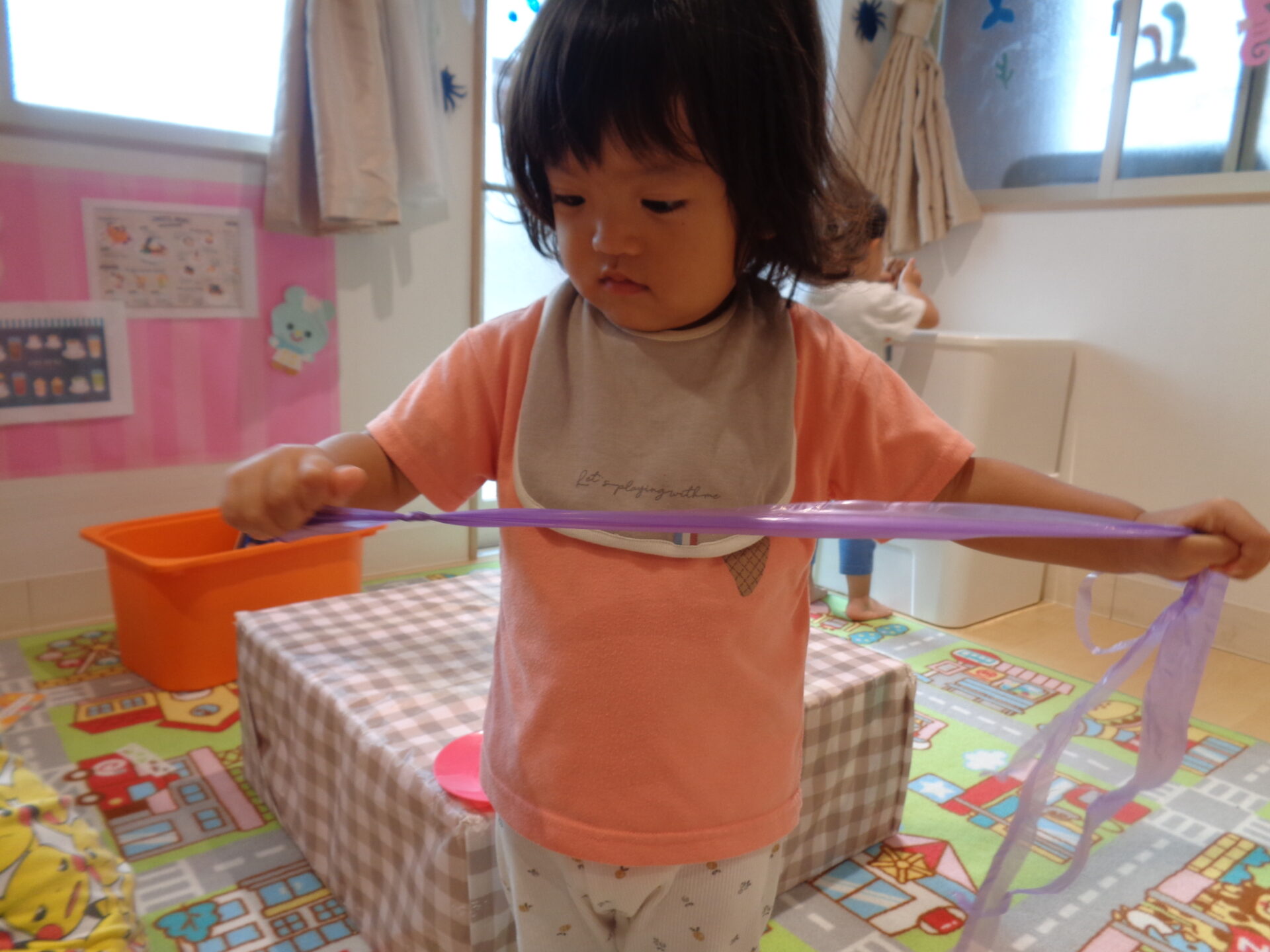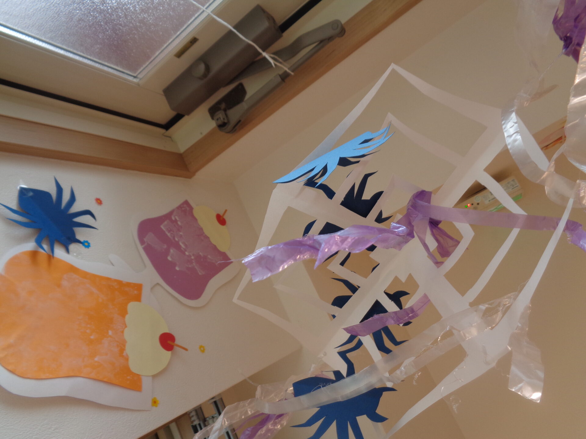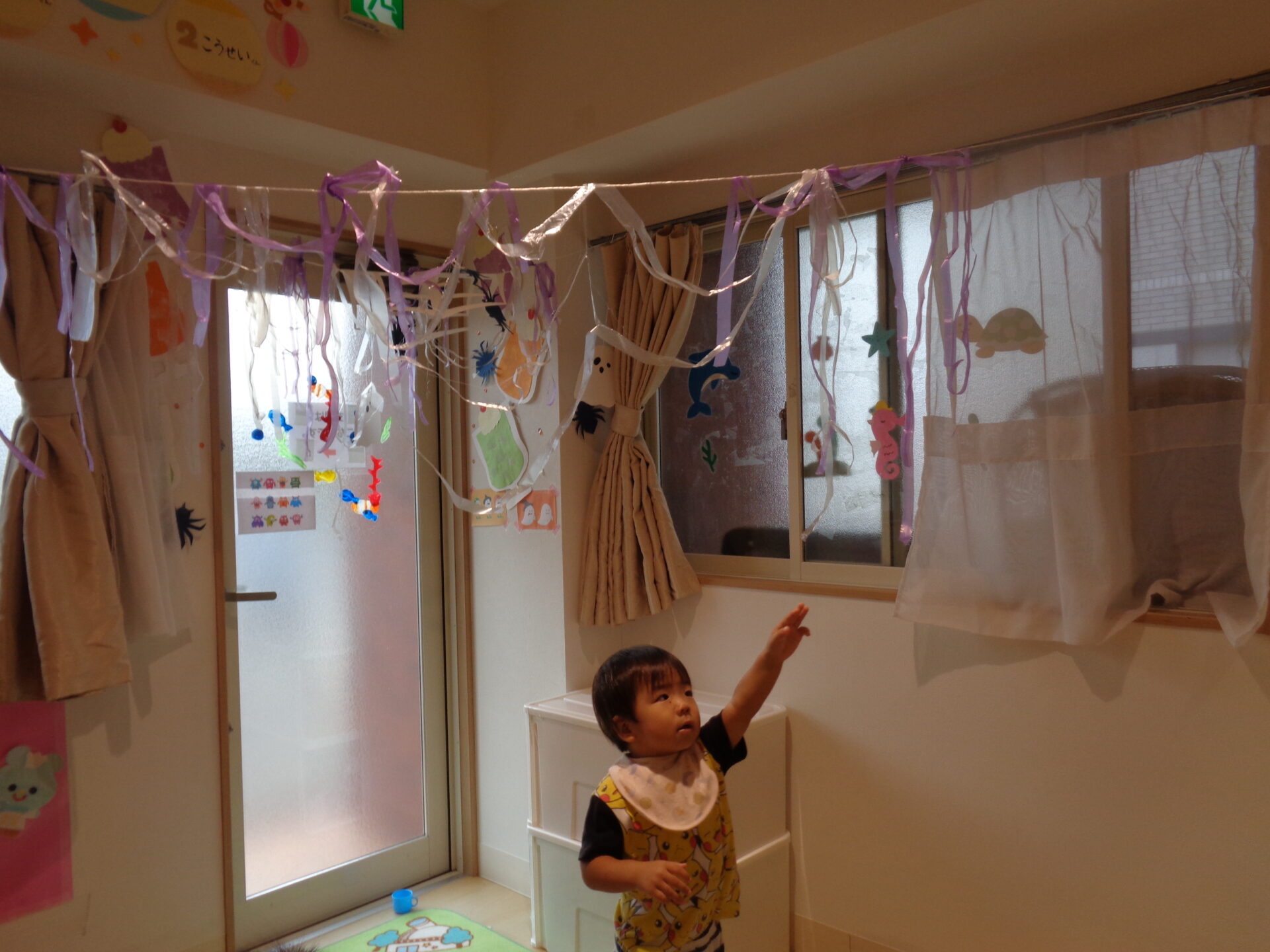2024.10.01 1歳児 ブログ ハロウィン気分🍭(1歳児 だいち組) 10月になりました。 今月はハロウィンがあります🎃 そこで、少しだいち組のお部屋に飾り付けをしました!! 届きそうで届かない蜘蛛の巣🕸一生懸命にジャンプしていました!! 下から見るとこんな感じ・・・「こわ~い😊」と言いながらもニコニコな子ども達。 「びりびり~🌟」とお手伝いもしてくれました! 一人ひとりモンスターを作ってお部屋に飾る予定です。どんなモンスターになるのかとても楽しみです😉 季節が変わり、玩具もアイスクリームからカップケーキに入れ替え🍰「これは、なあに~?」と興味津々です✨ 白いクリームの形がカブに見えたようで、「かぶ!かぶ!!」と盛り上がっていて笑ってしまう保育士でした😂 ジャックオーランタンやおばけなど、ハロウィンの飾りも作ってみました🥰 子ども達が季節を感じられる環境作りをしていきたいです🍂 一覧へ戻る