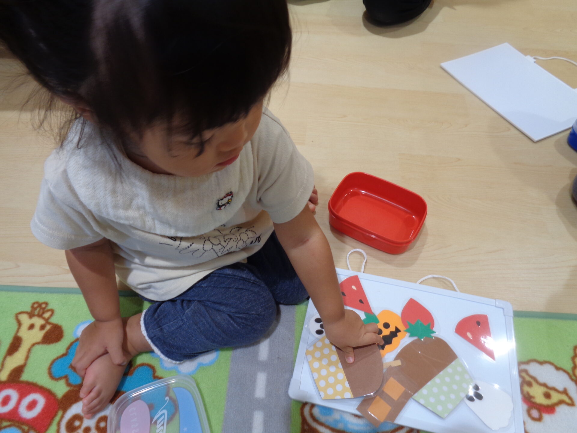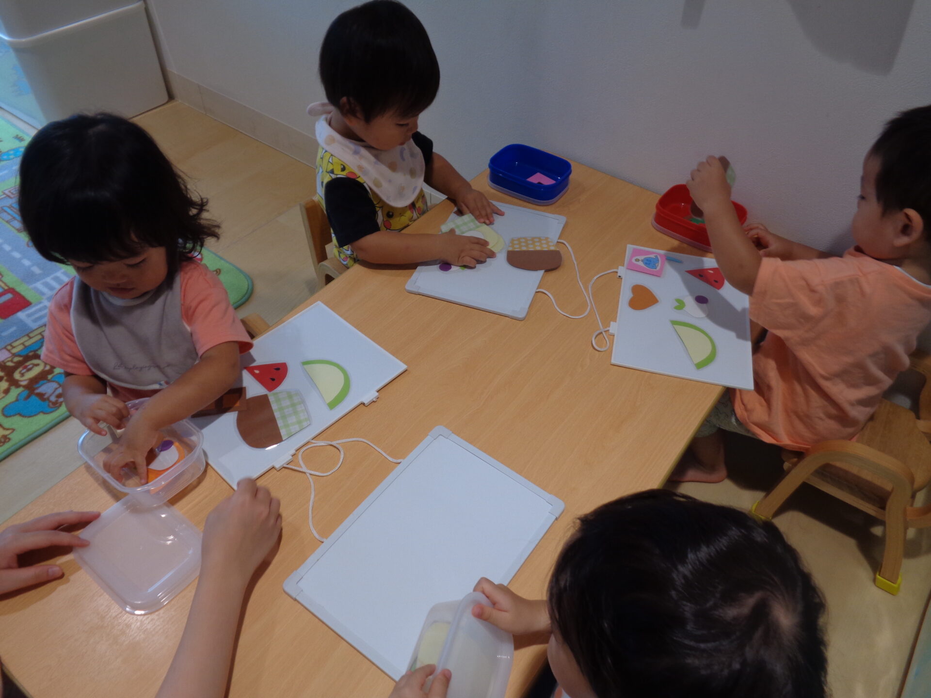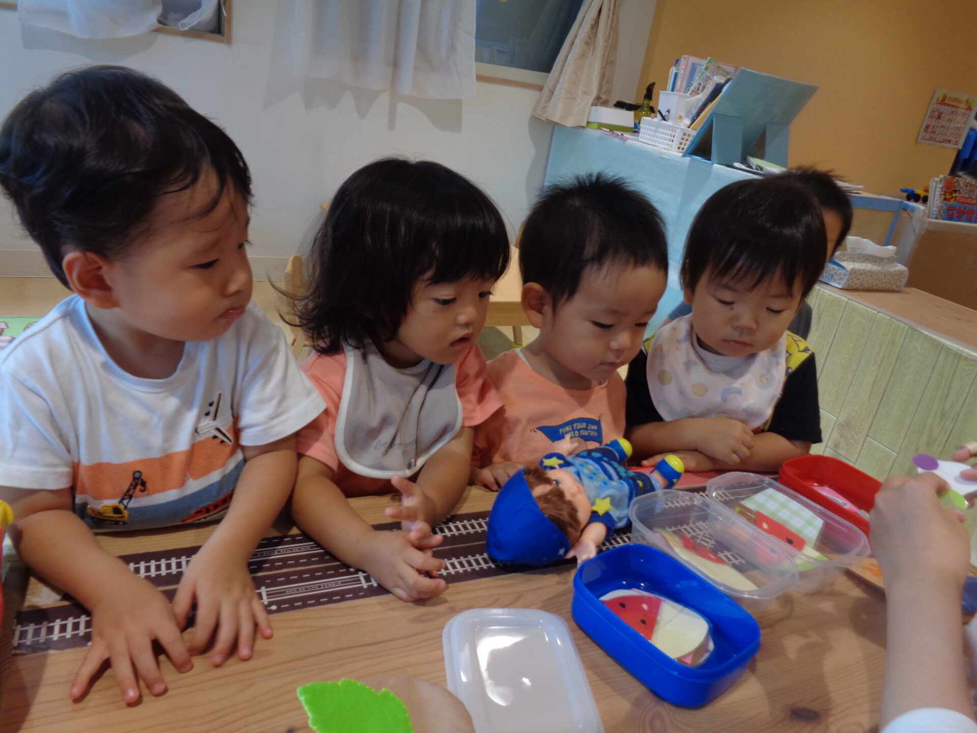 2024.10.01 1歳児 ブログ ハロウィン気分🍭(1歳児 だいち組) 10月になりました。 今月はハロウィンがあります🎃 そこで、少しだいち組のお部屋に飾り付けをしました!! 届きそうで届かない蜘蛛の巣🕸一生懸命にジャンプしていました!! 下から見るとこんな感じ・・・「こわ~い😊」と言いながらもニコニコな子ども達。 「びりびり~🌟」とお手伝いもしてくれました! 一人ひとりモンスターを作ってお部屋に飾る予定です。どんなモンスターになるのかとても楽しみです😉 季節が変わり、玩具もアイスクリームからカップケーキに入れ替え🍰「これは、なあに~?」と興味津々です✨ 白いクリームの形がカブに見えたようで、「かぶ!かぶ!!」と盛り上がっていて笑ってしまう保育士でした😂 ジャックオーランタンやおばけなど、ハロウィンの飾りも作ってみました🥰 子ども達が季節を感じられる環境作りをしていきたいです🍂 一覧へ戻る
