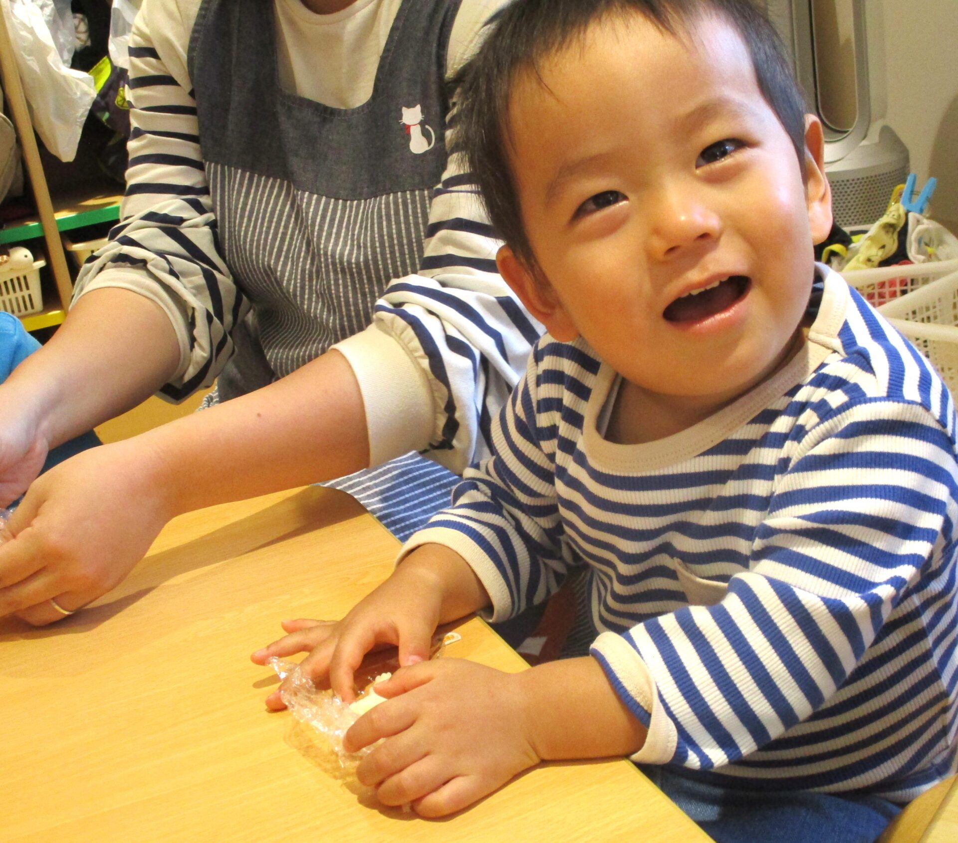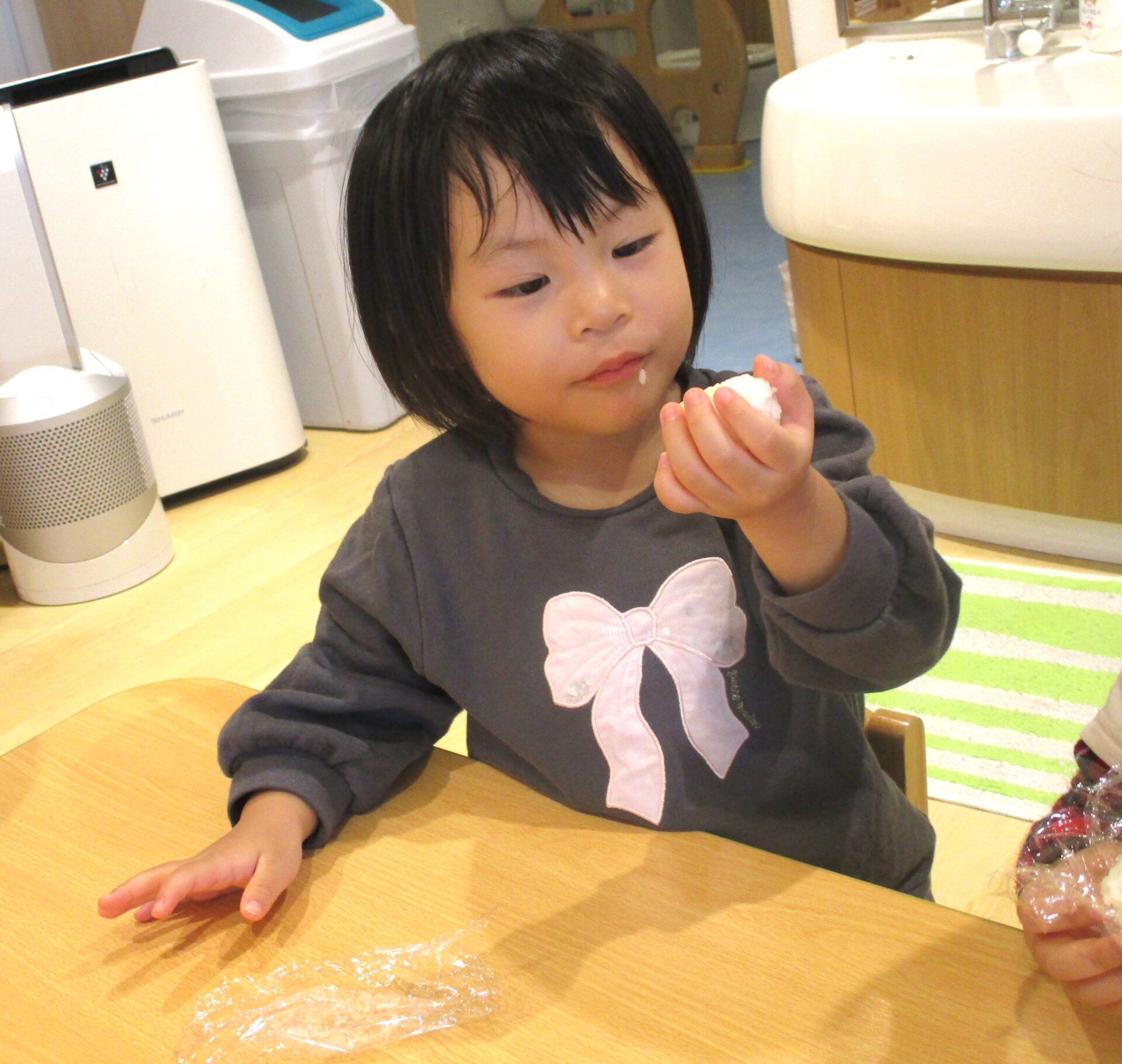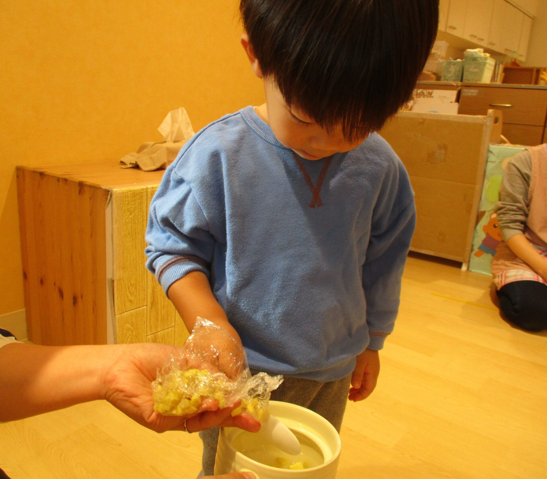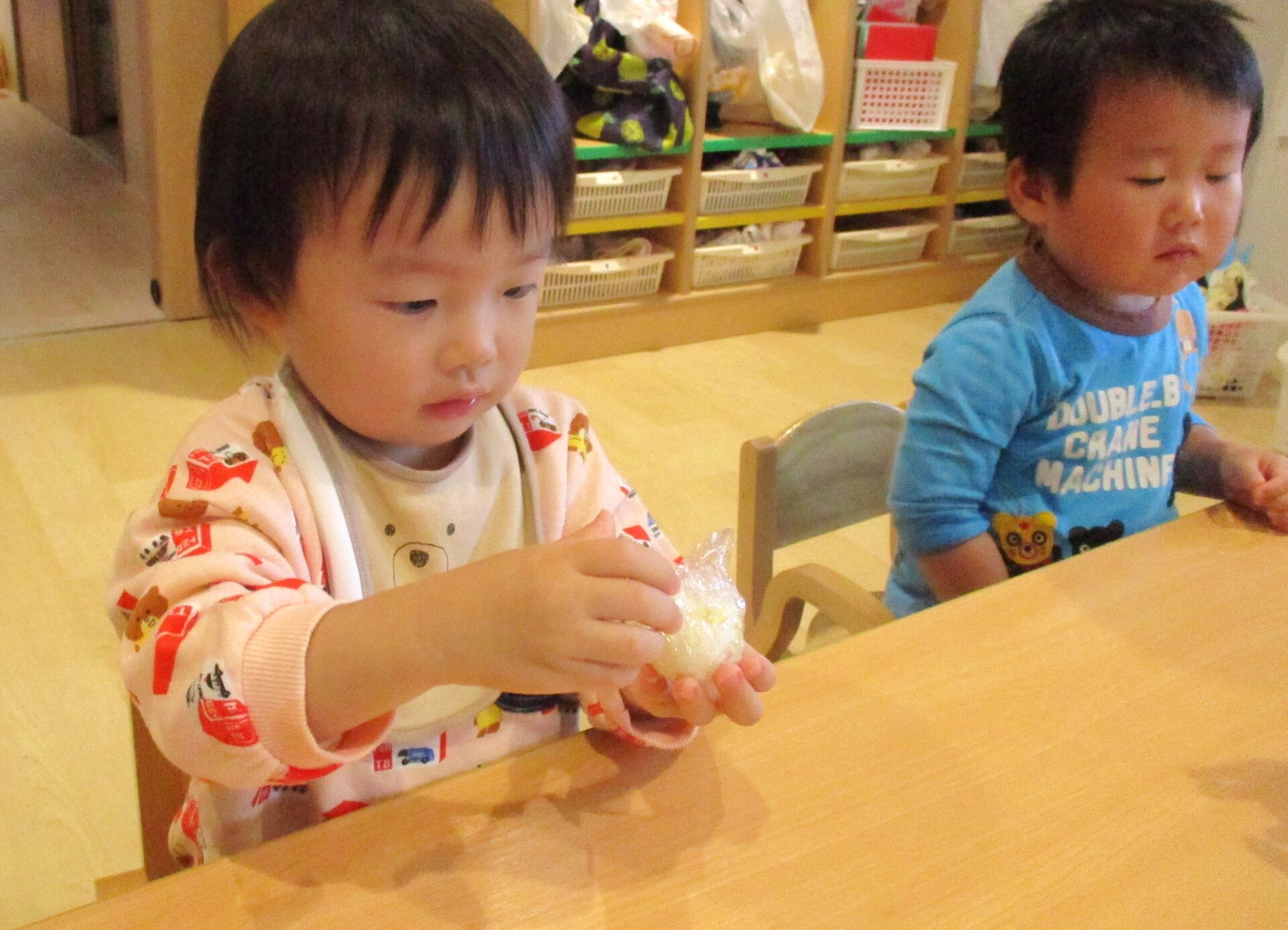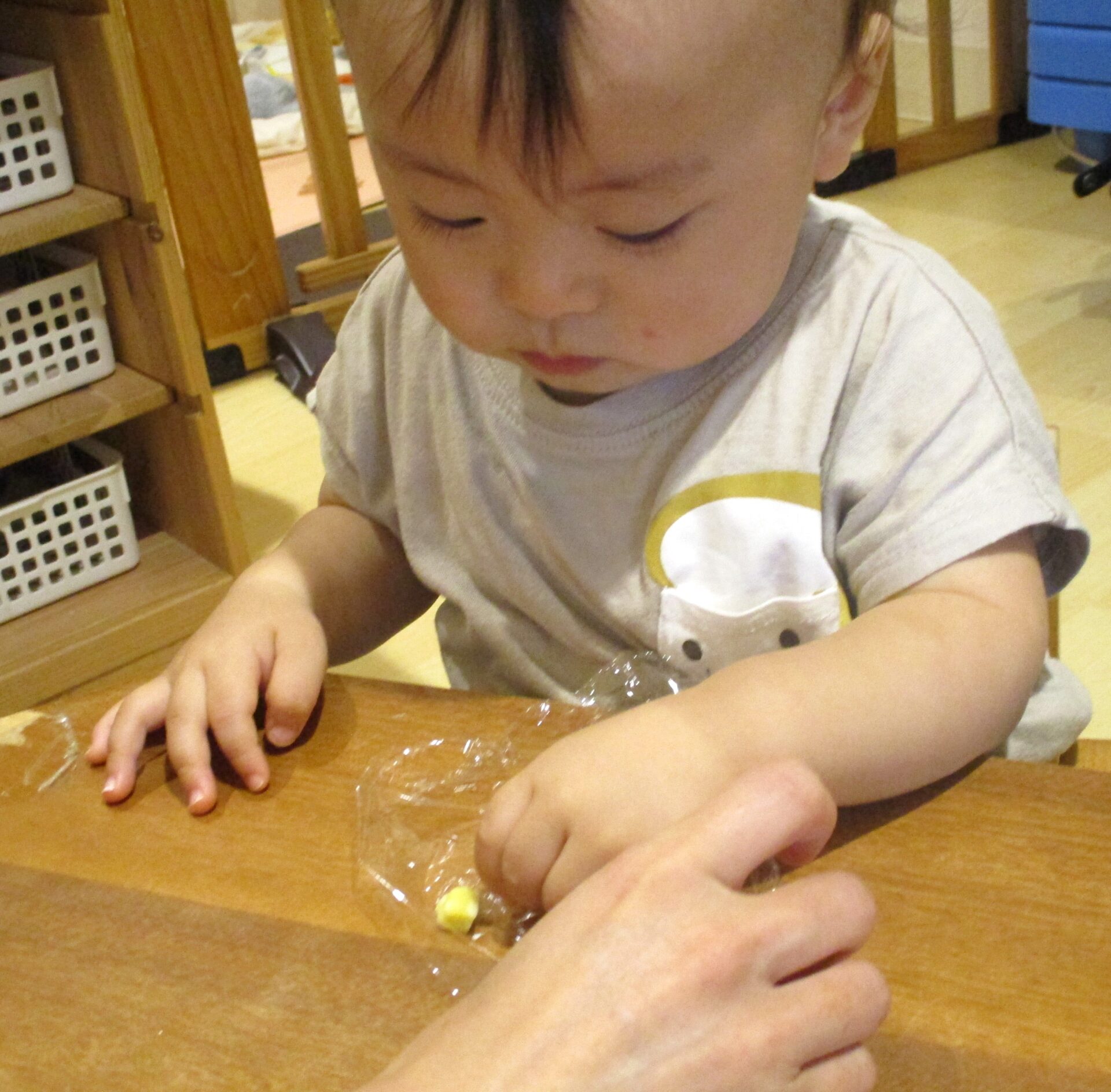 ラップに取り分けている間に、握る練習をするあめ組さん。
