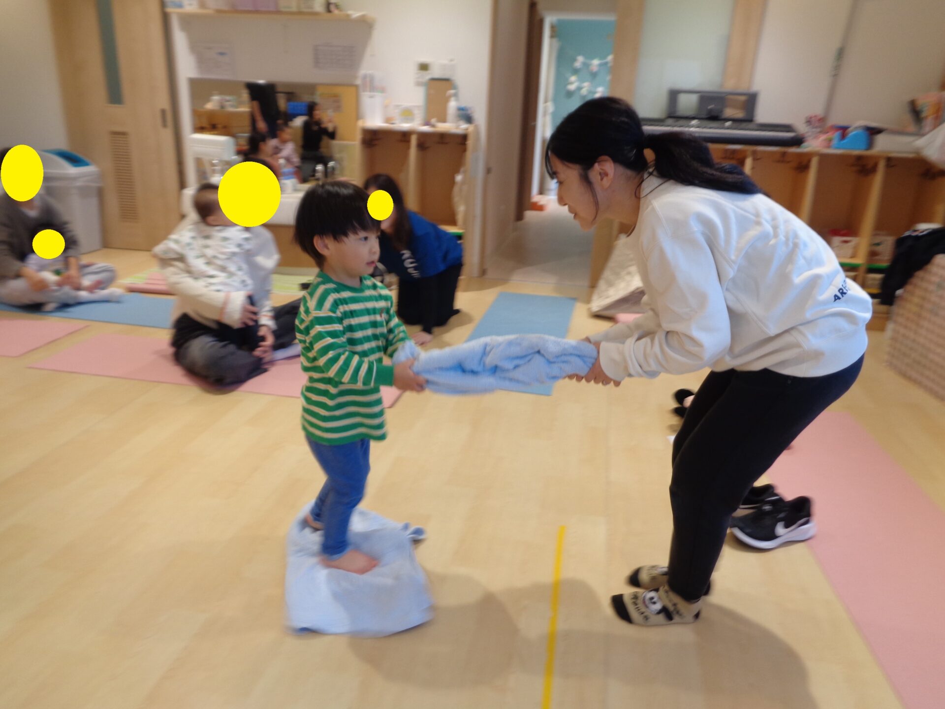 あめぐみでは、子どもたちと楽しくトレーニングしながらお家がキレイになる方法として、子どもがタオルに乗り、足を交互にスライドさせながら進んでいくものや、足を踏ん張って、向かい合わせの大人がタオルで引っ張っていくものを教えてもらいました🌟