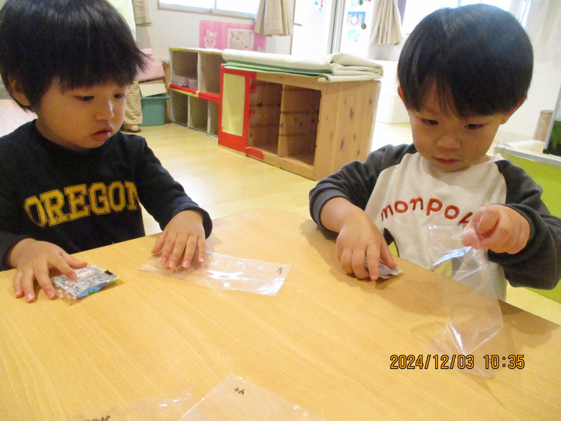 保育園に帰ってからは、買ったお菓子を袋詰めしていきます。
