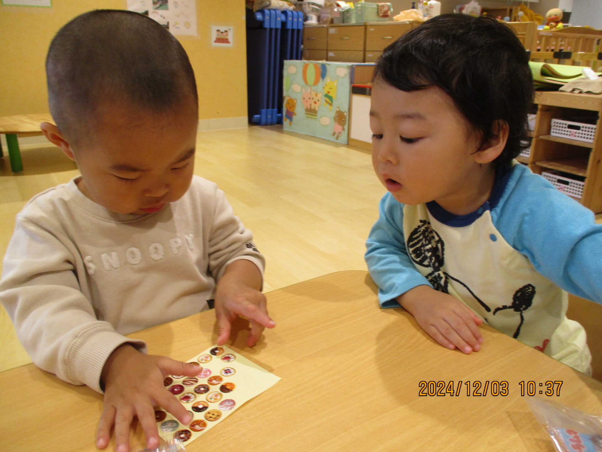 ほとんど保育者の手伝いなしで袋に入れて、好きなシールを貼ることができました!
