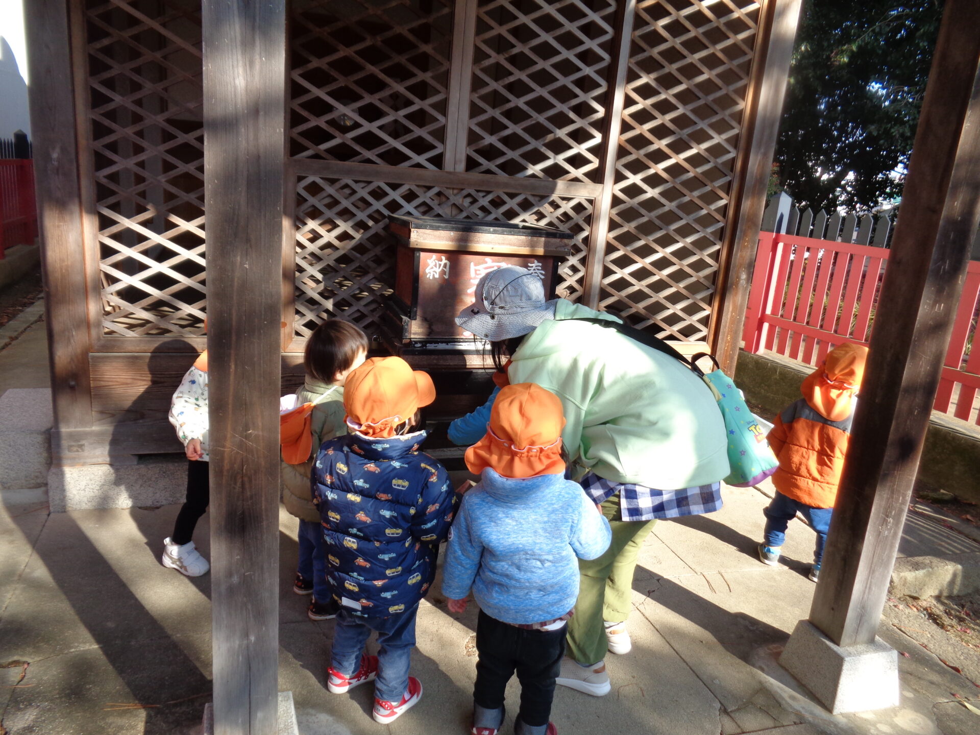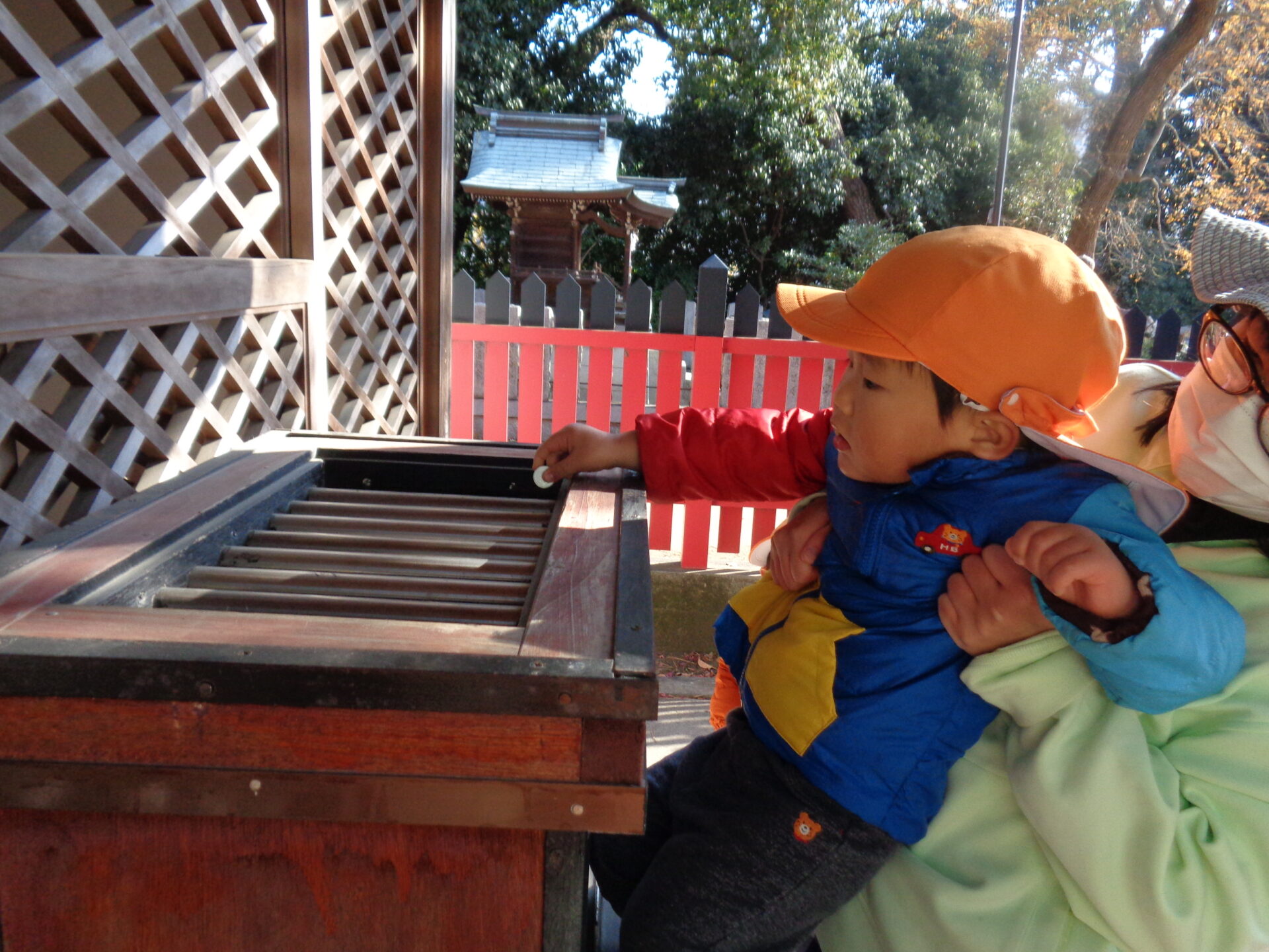 「今年もよろしくお願いしますと言いに神社に行こうか!」と朝の会で子ども達に提案すると「おかねいれて~いう~!!」と