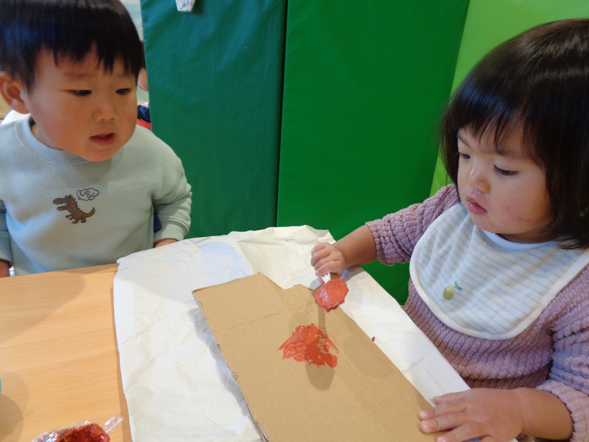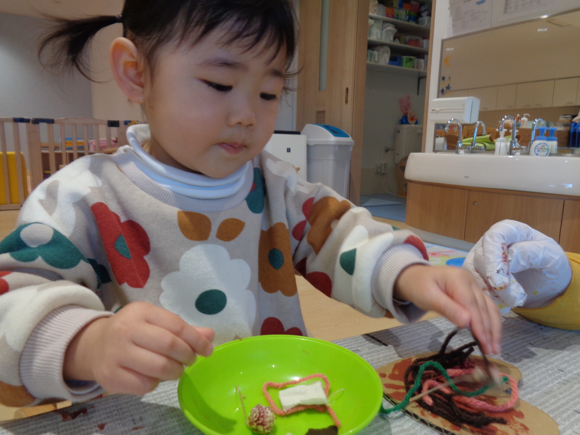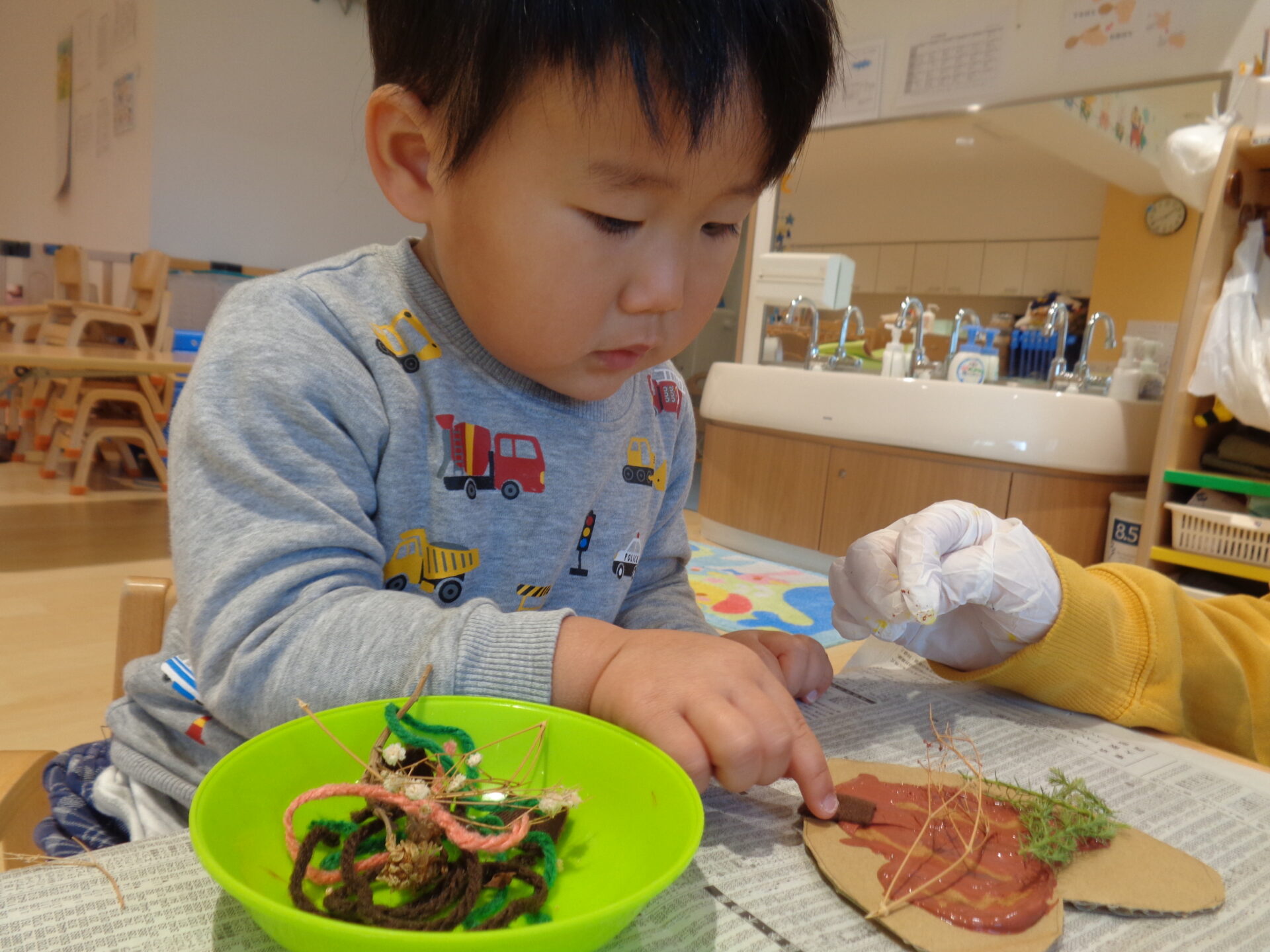 2025.02.06 1歳児 ブログ 心を込めて🍫(1歳児 だいち組) 2月14日はバレンタイン💖 だいち組ではハートの形のチョコレートを作りました。 お花や木の実、毛糸など様々な飾りの中から好きな物を選びました。「これなに?」と興味津々に飾りを触っていました😉 (ちなみにお花や木の実などは保育士が道の駅で見つけた際に購入!これだけ色々と入っていてお得で素敵です✨) ボンドと茶色の絵の具を混ぜて作ったチョコレートソースを塗って選んだ飾りを付けました🌟チョコレートソースを見て「ちょこちょこ!」と喜んでいましたが、手に付くとベタベタするため嫌そうでした😂 1番人気の飾りは毛糸でした。完成すると「おいしそう💕」とにっこりでした! 「まだしたい~!!」というお友だちがいたので一緒に大きな板チョコも作りました😊玄関に飾ってあるのでまた見て下さいね!! 一覧へ戻る