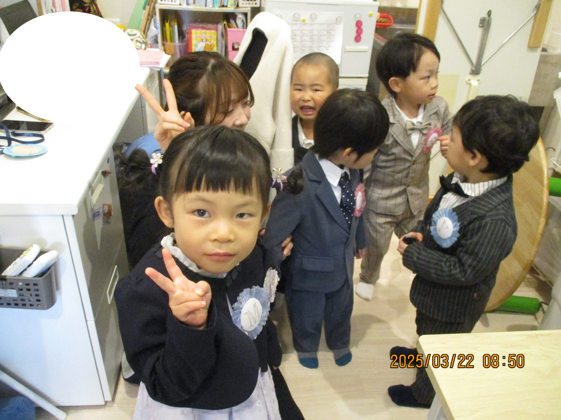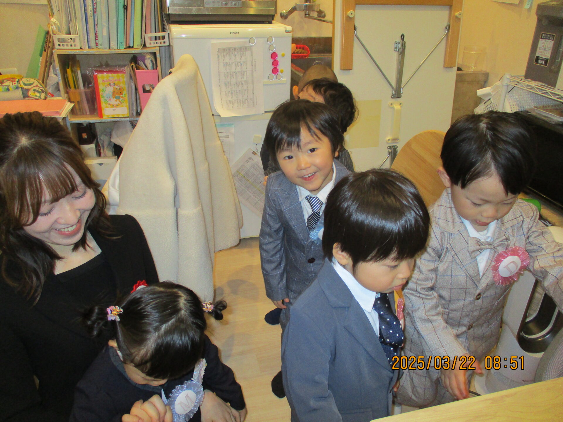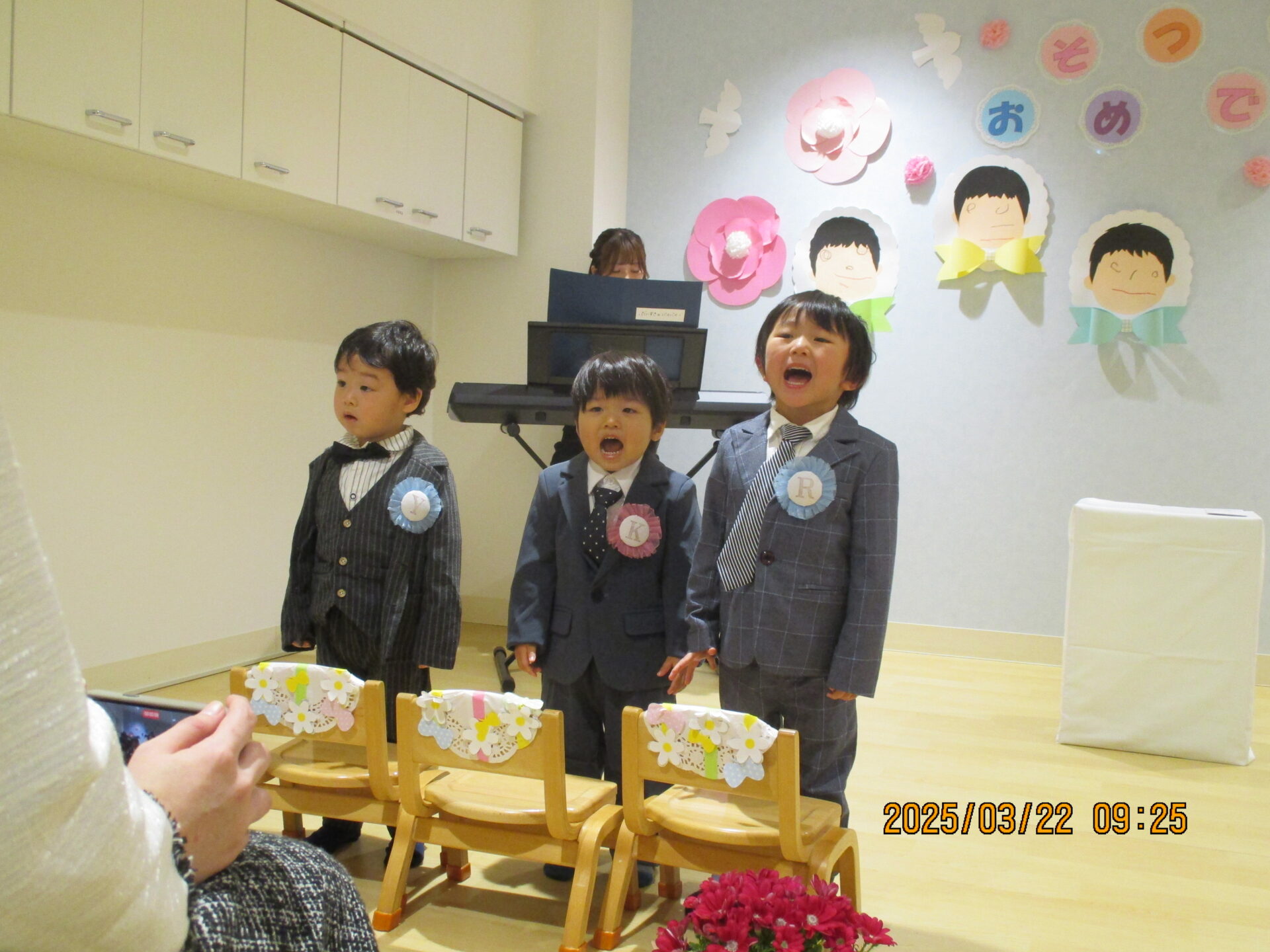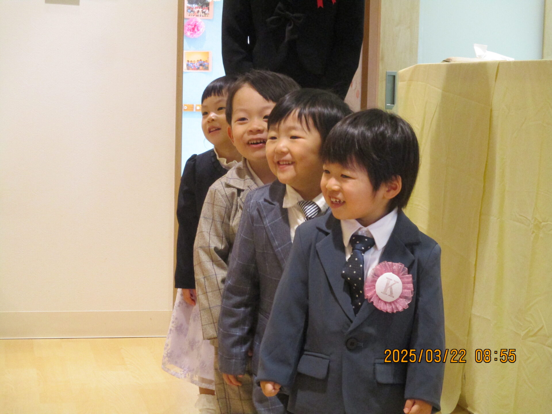 かっこいい服を着て笑顔で登園してくれ、「もうすぐだね!」「〇〇くんのお洋服かっこいい~」などとお話ししながら、式が始まるのを待っています😊
