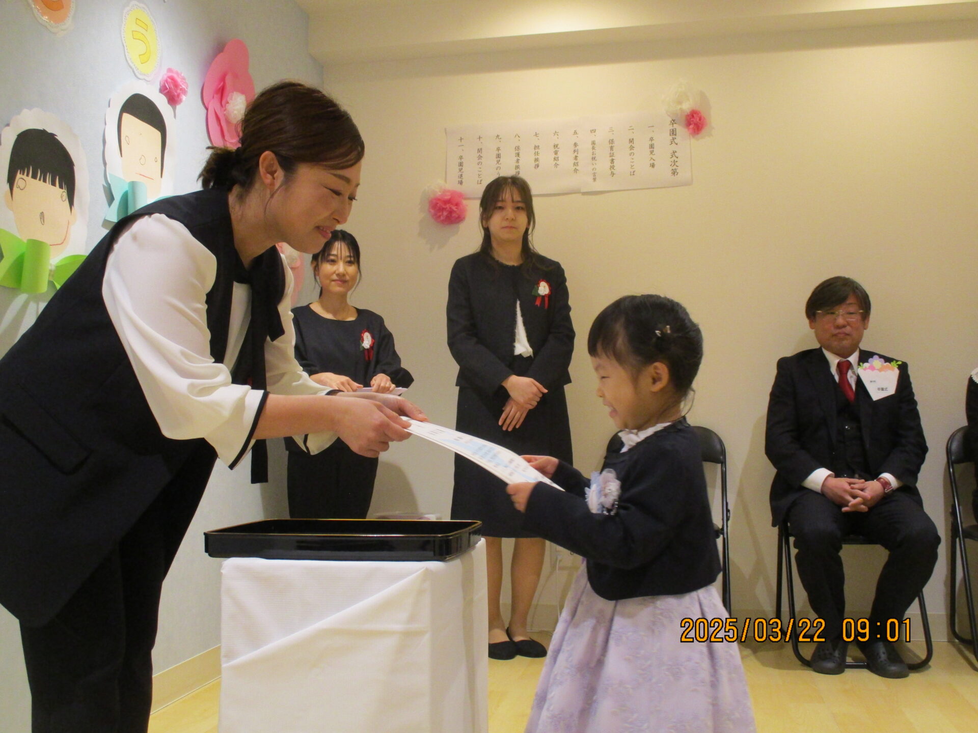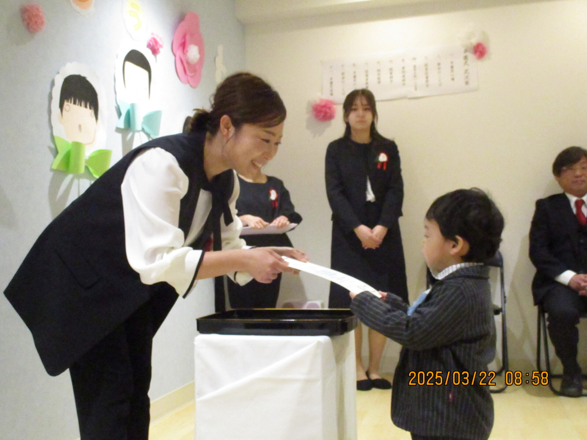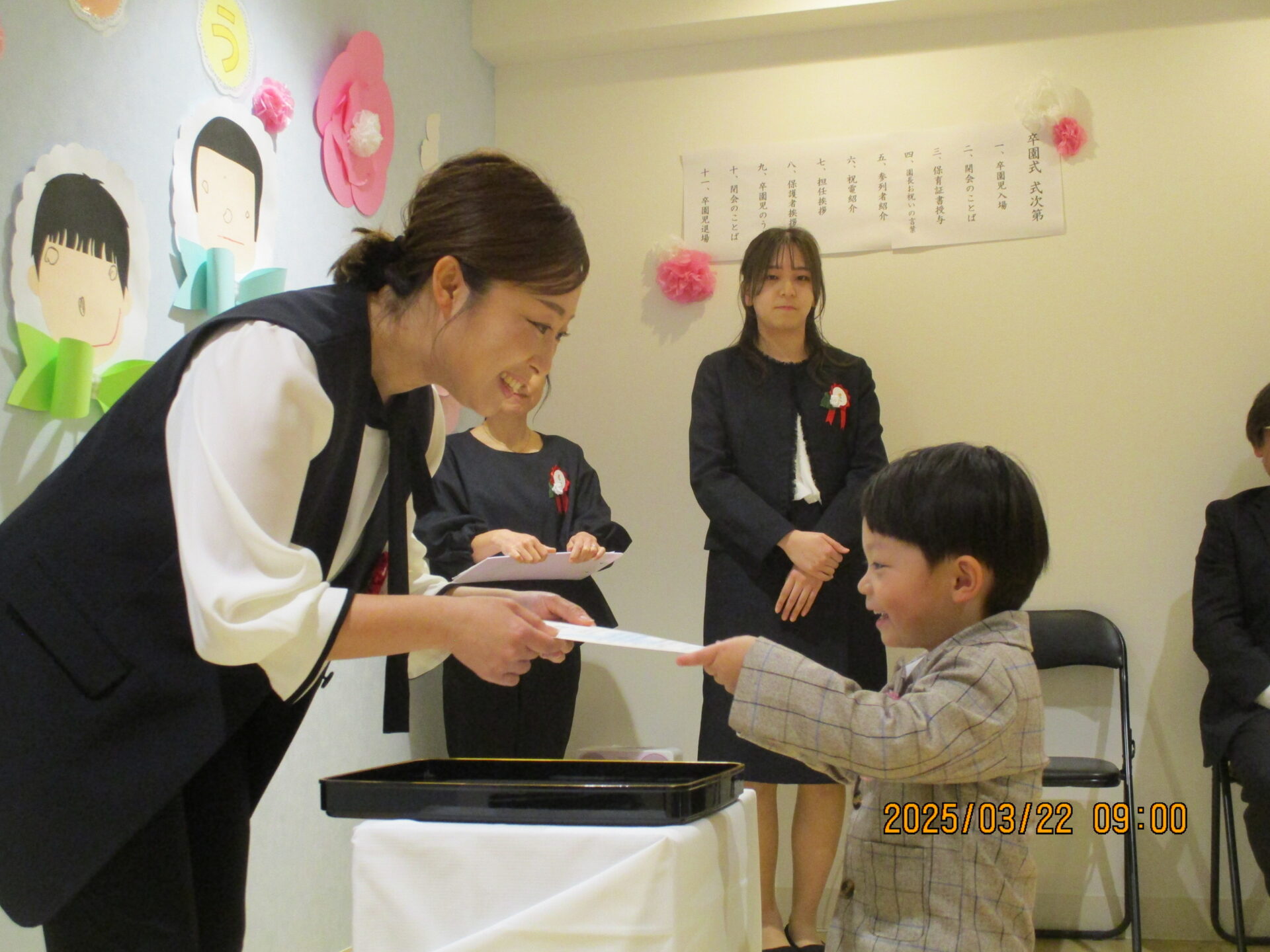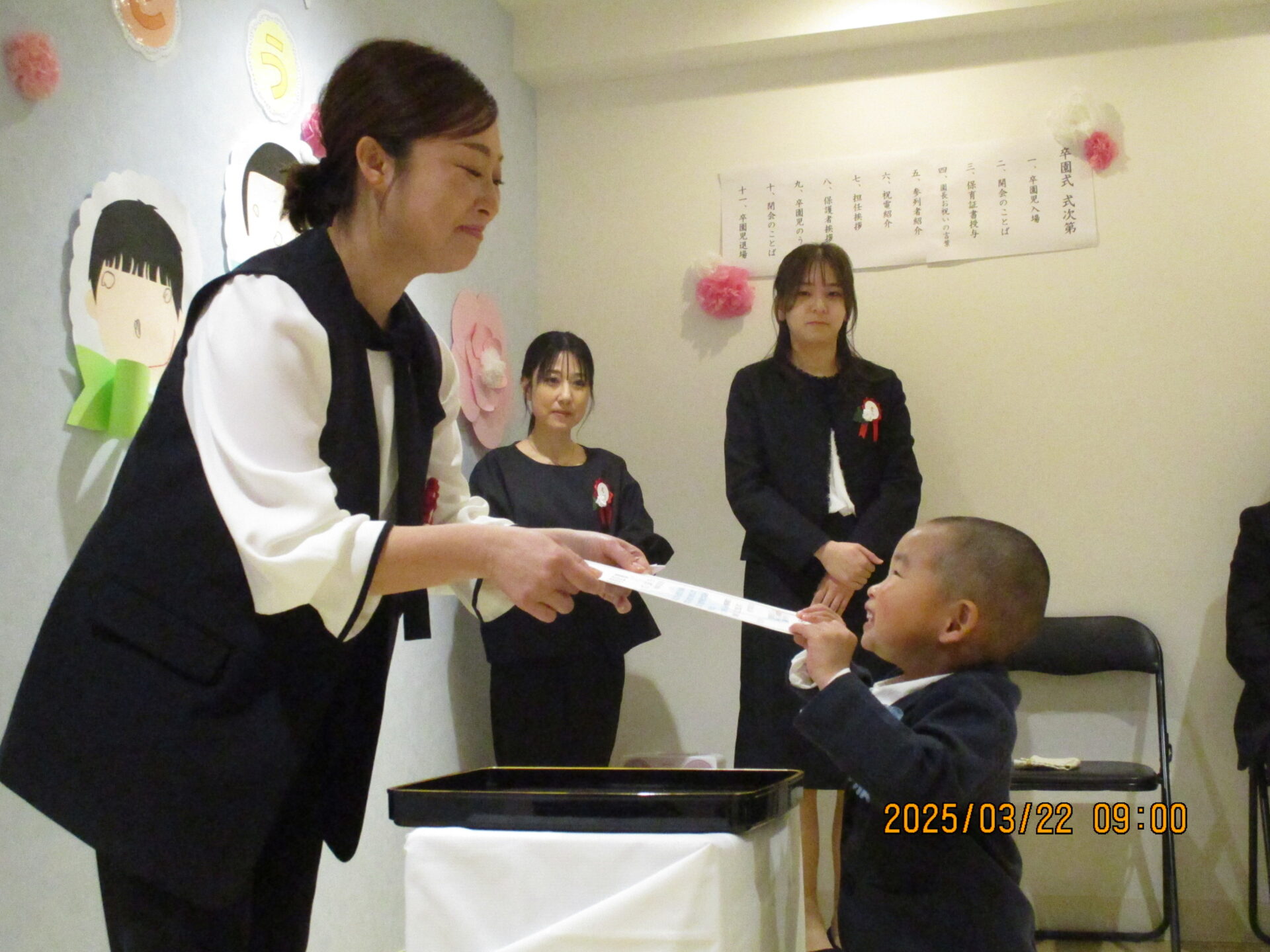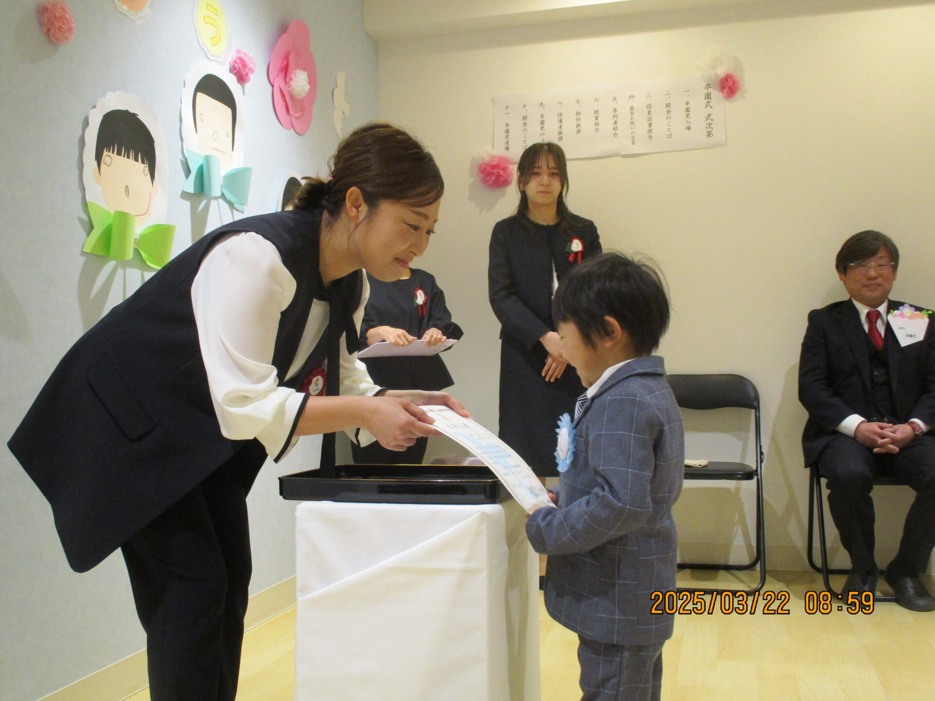 みんなしっかりと園長先生と目線を合わせて、これまで練習してきたとおりに堂々と証書を受け取ってくれました。