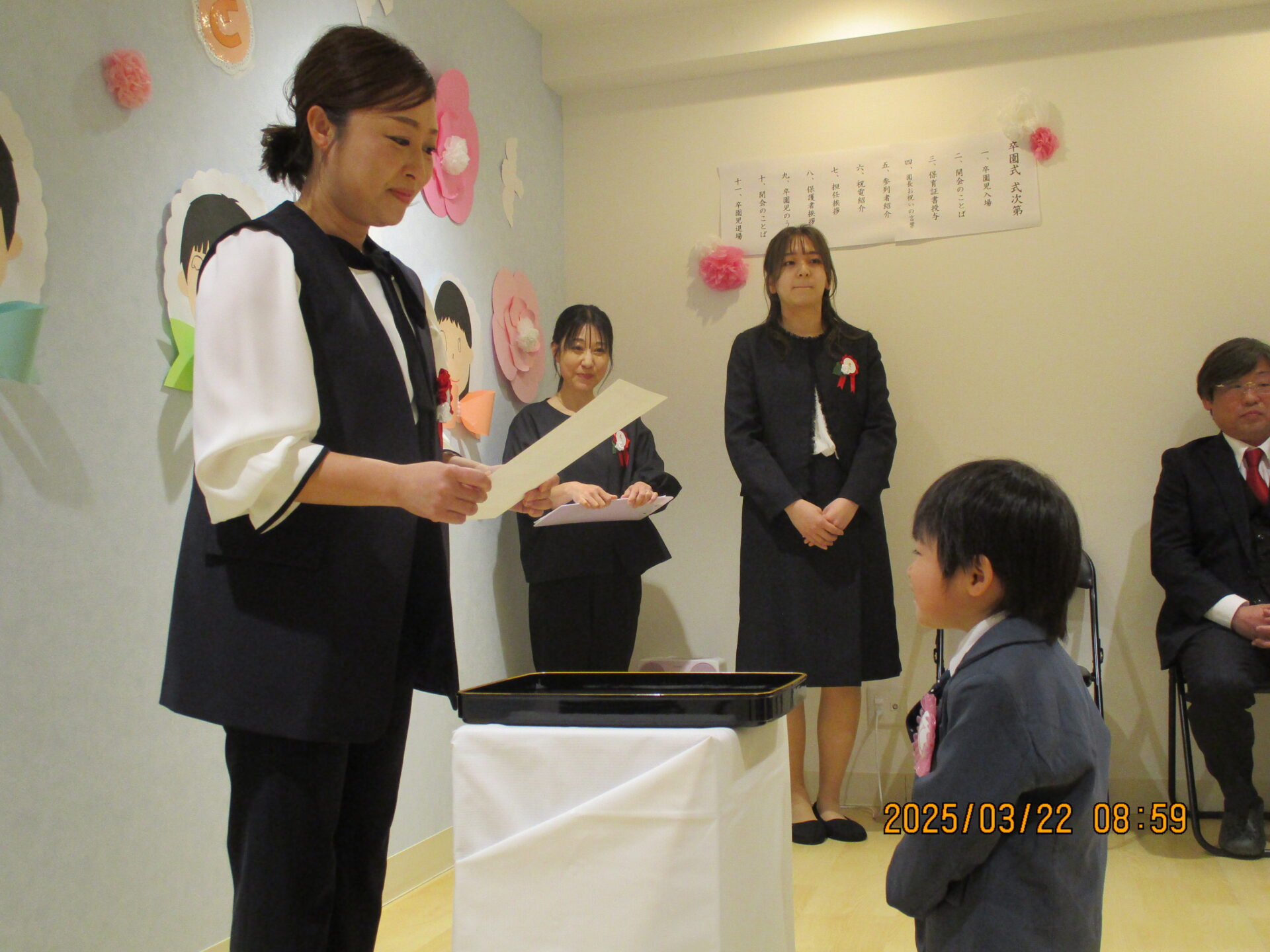 卒園証書授与では、一人ずつお名前が呼ばれ、それぞれが「はい!」のお返事で証書を受け取りに行ってくれました。