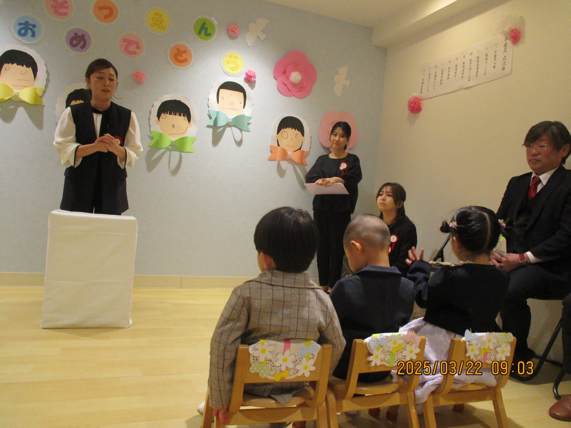 園長先生や担任のお話、来賓紹介や保護者の方のお話もしっかり聞くことができました。