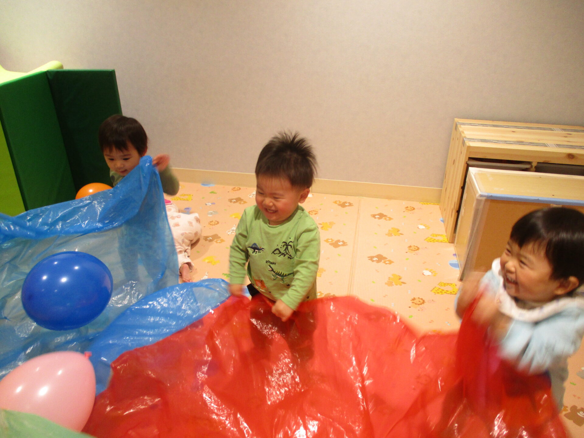 また別の日には、風船やカラーポリをつなげて思いきり遊びました。