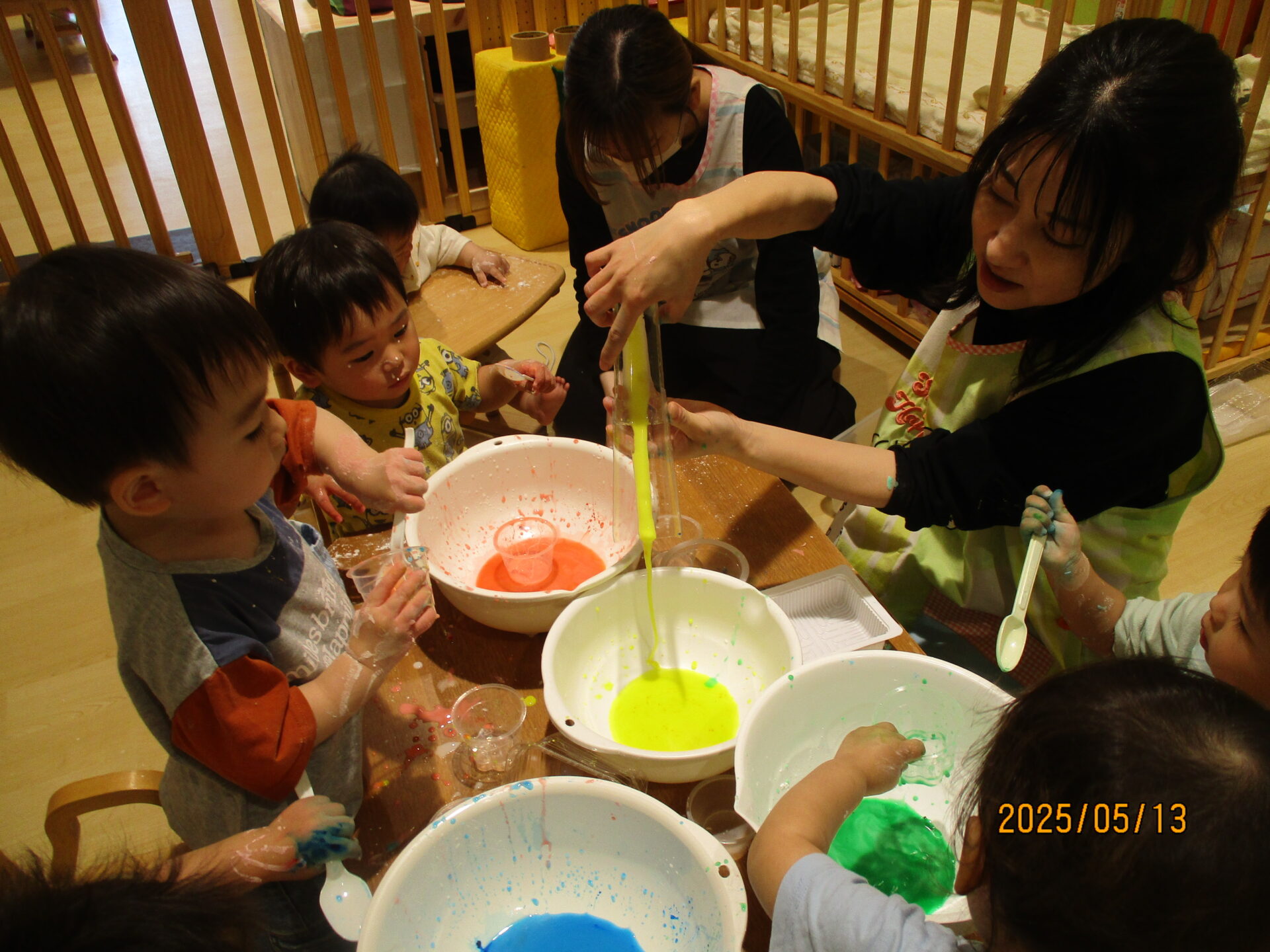 さらに食紅で色を付け、スプーンやカップなどを用意し、好きに使っていいよと出しました。