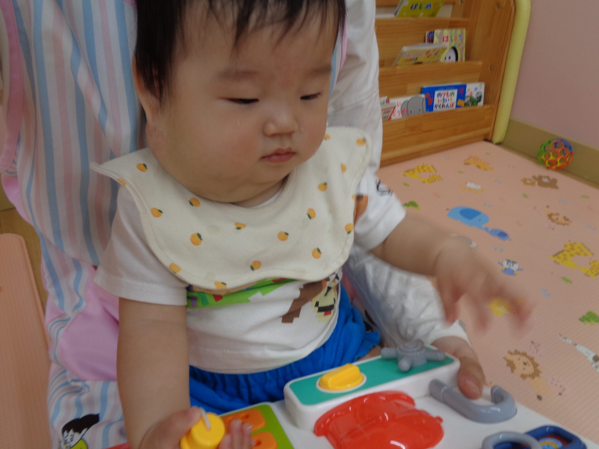 まずは保育士の膝に座って音の鳴る玩具で遊びました。