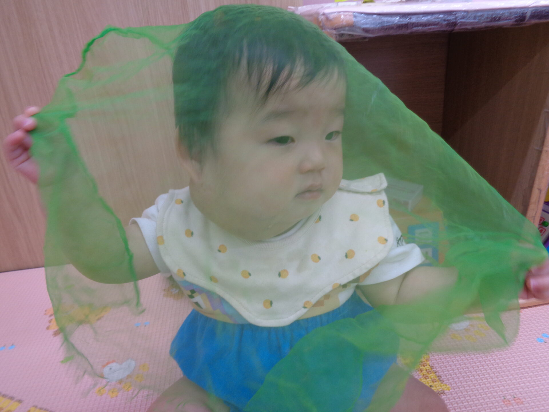 こちらが「いないいない~?」と言うと自ら持って「ばあ!」と