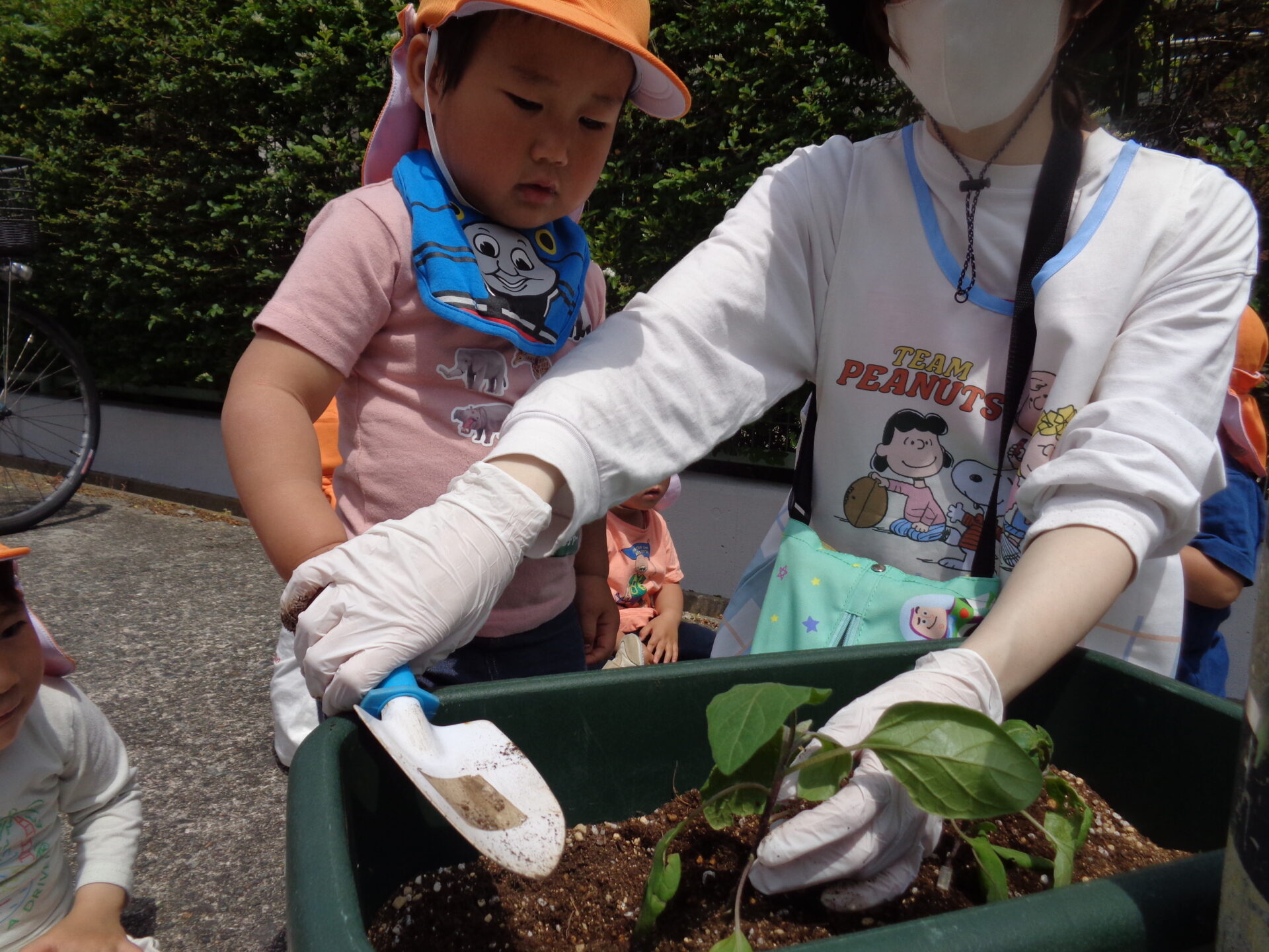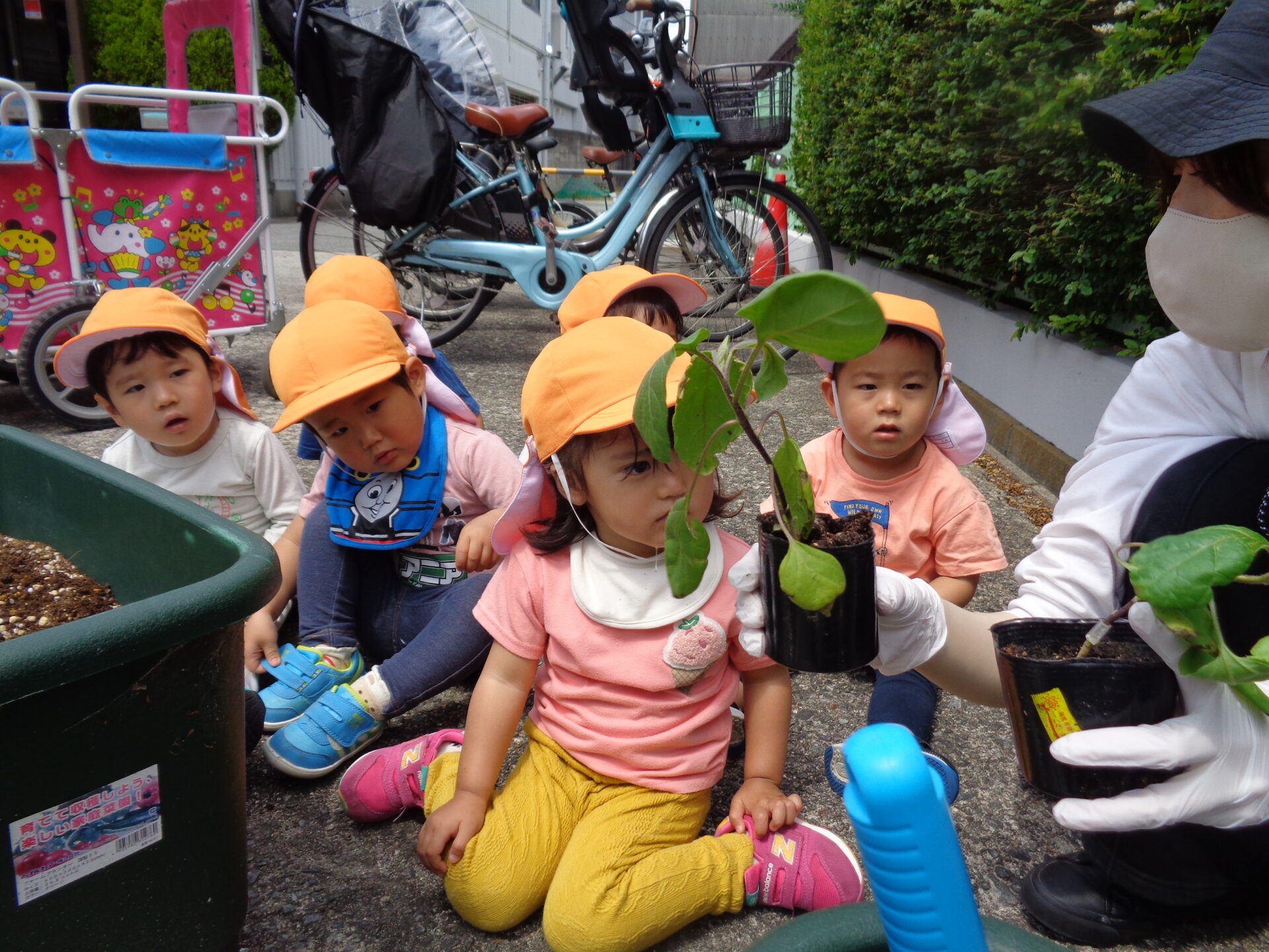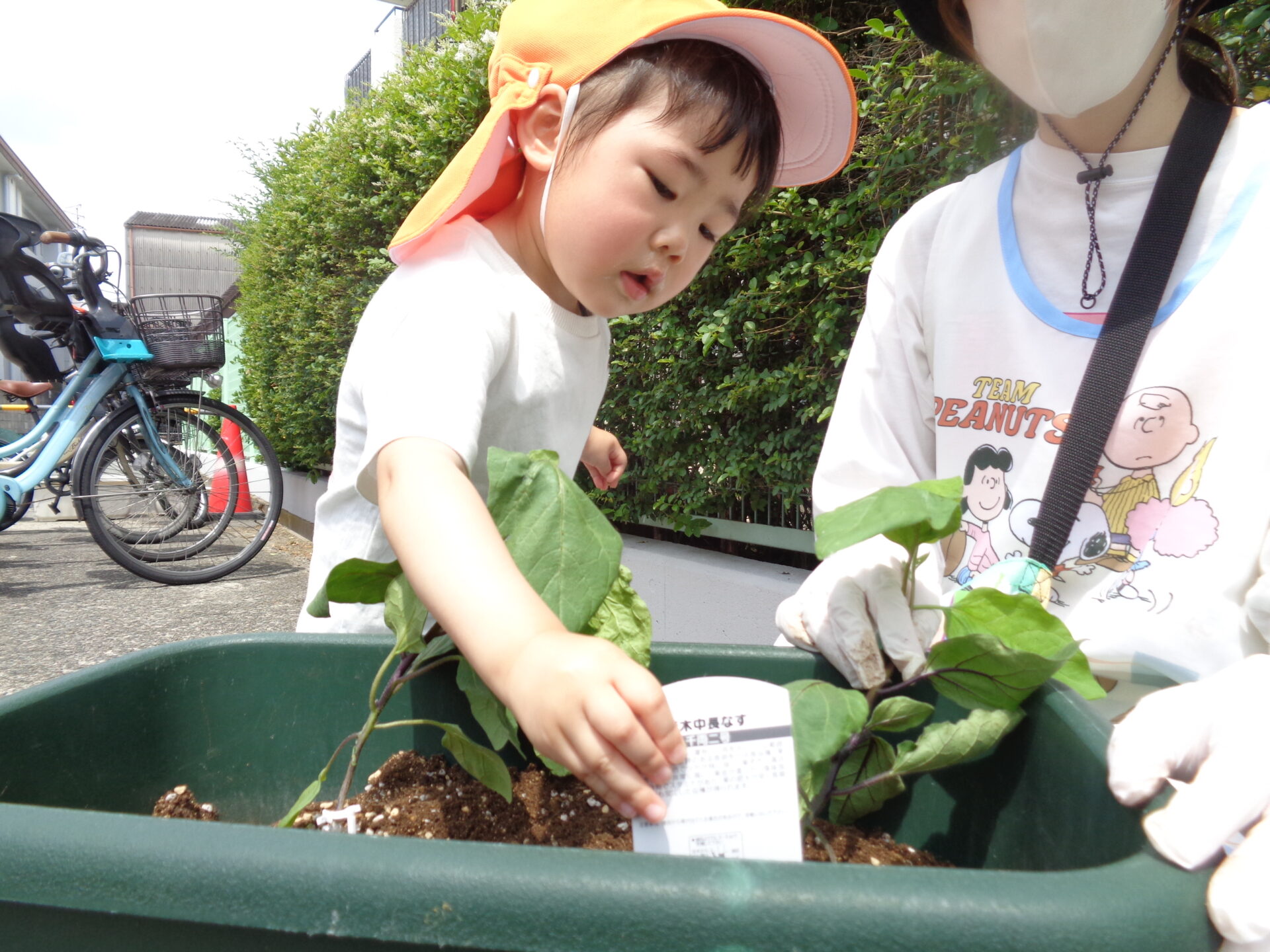 みんなで大切に植えた茄子の苗、無事におおきく育ちますように🍆✨