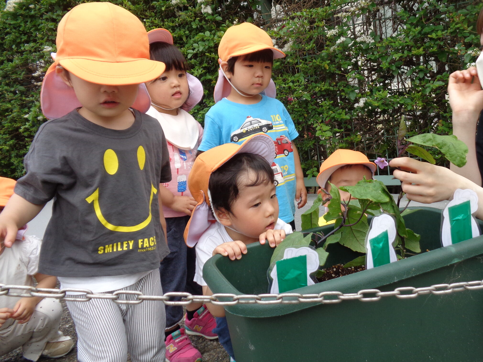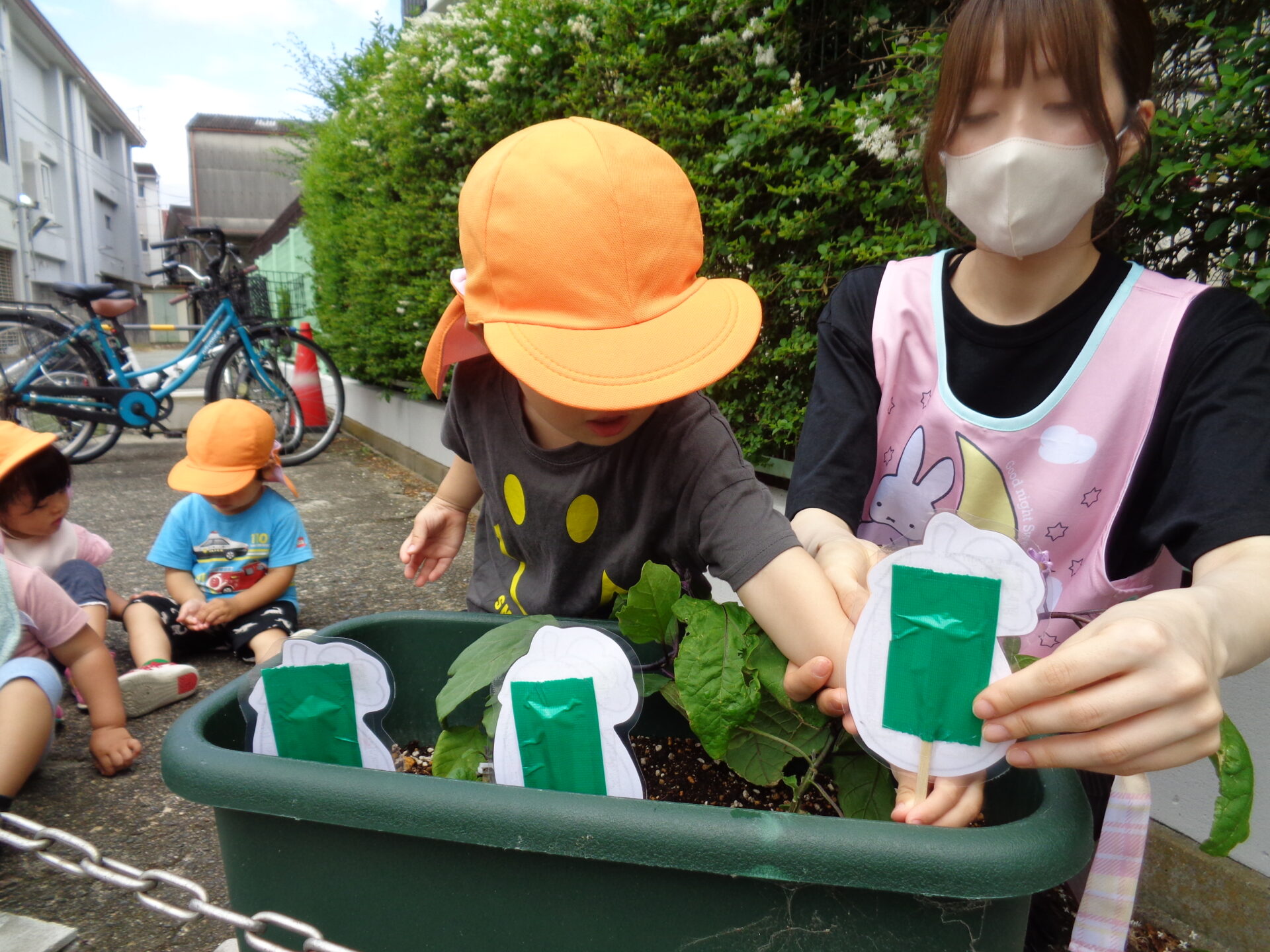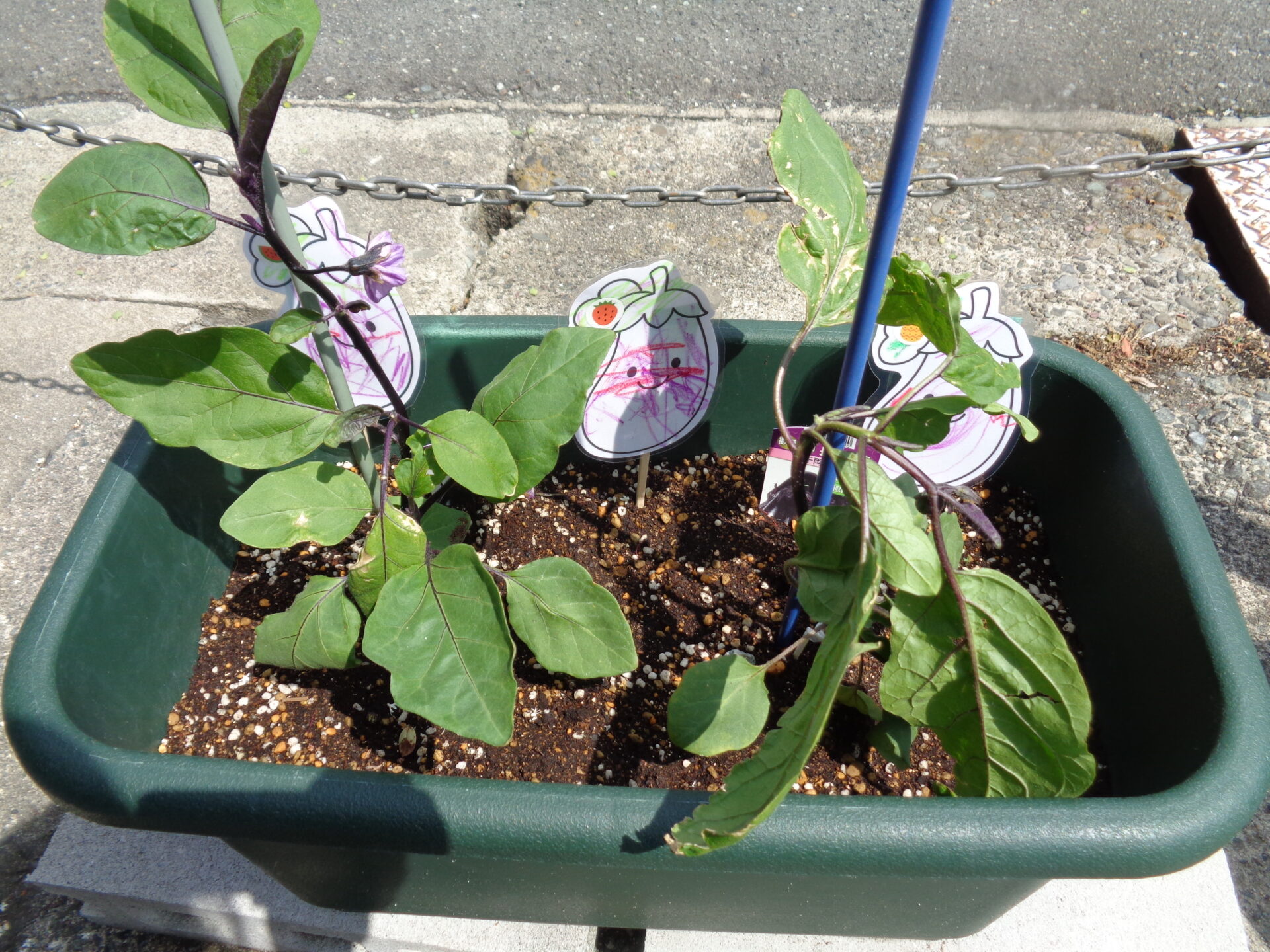 そして後日、今度は苗を植えた鉢に茄子の塗り絵のポップを飾りました。