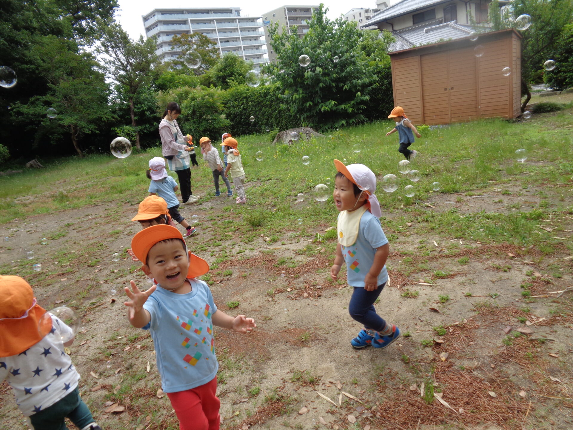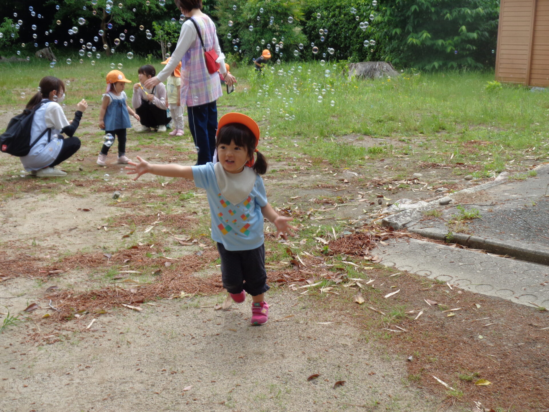その後は広場に戻り、皆で走り回りながらしゃぼん玉を楽しみました.。o○