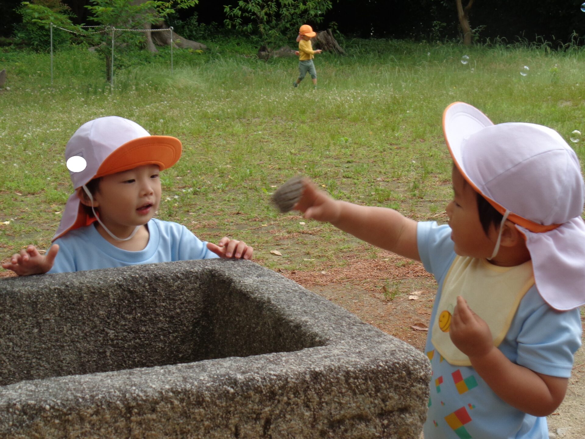 しゃぼん玉だけでなく、落ちていた松ぼっくりやちょうちょなどの虫を見つけるのも楽しんでいました🦋