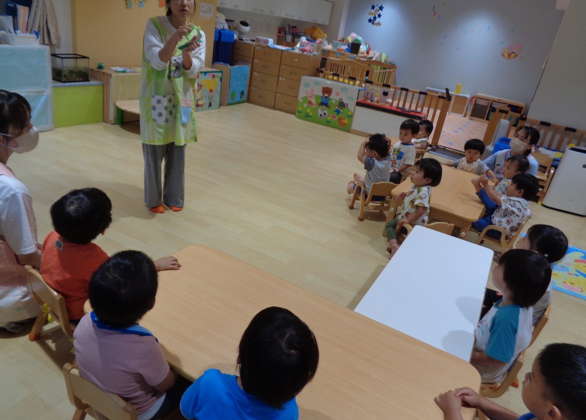 みんな大好きで、1歳児の子どもたちも歌詞を覚えて歌えるようになってきました。