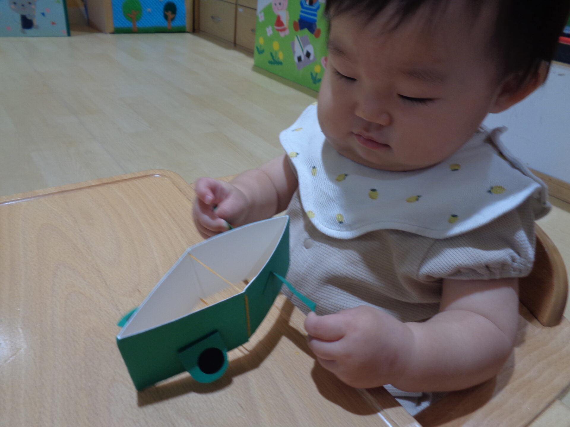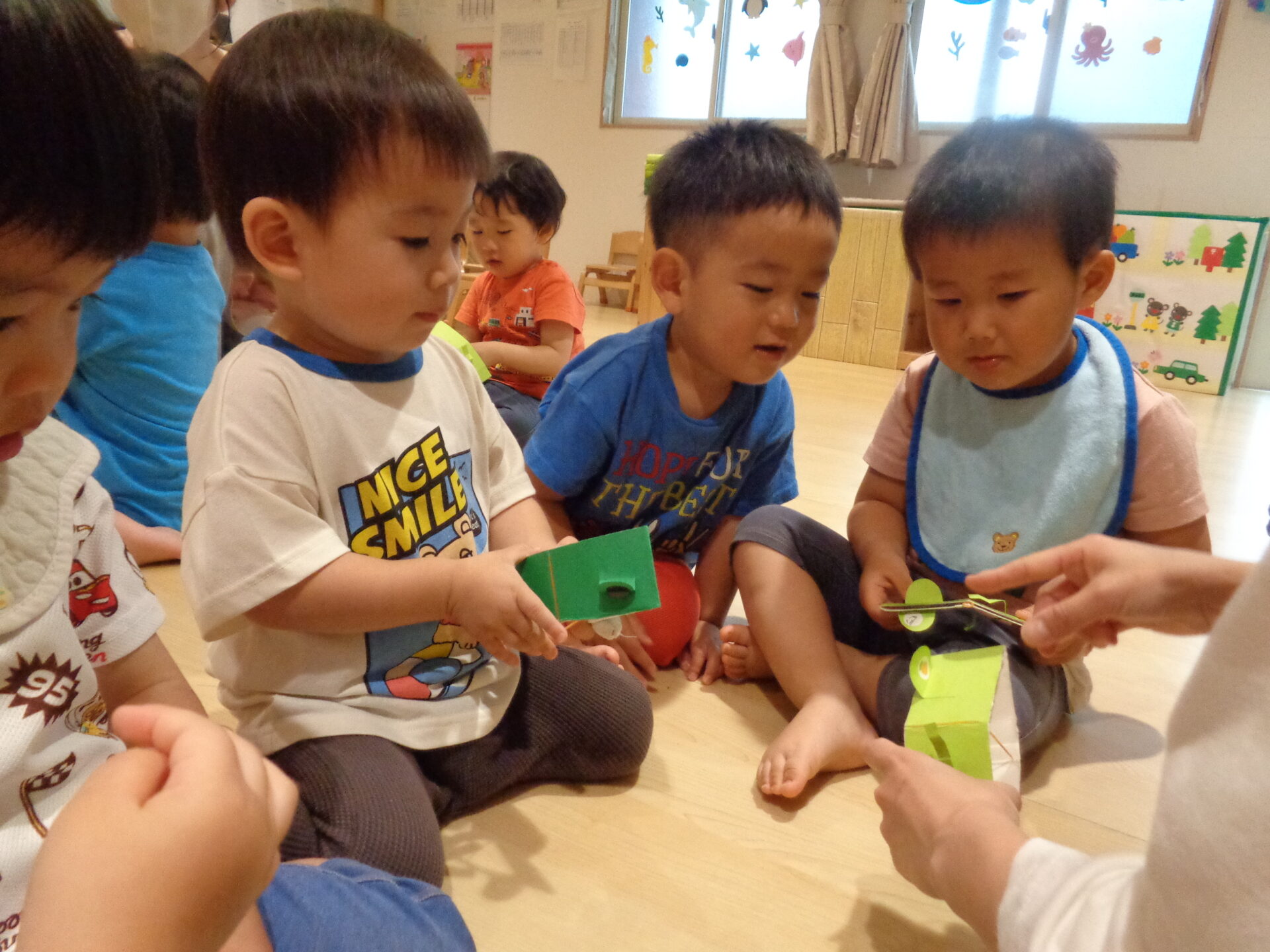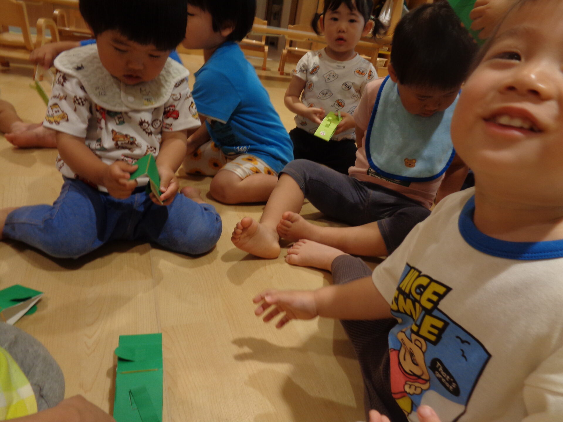 そしてこの日は、「跳ぶカエル」を0.1.2歳児みんなで作ってみました🐸