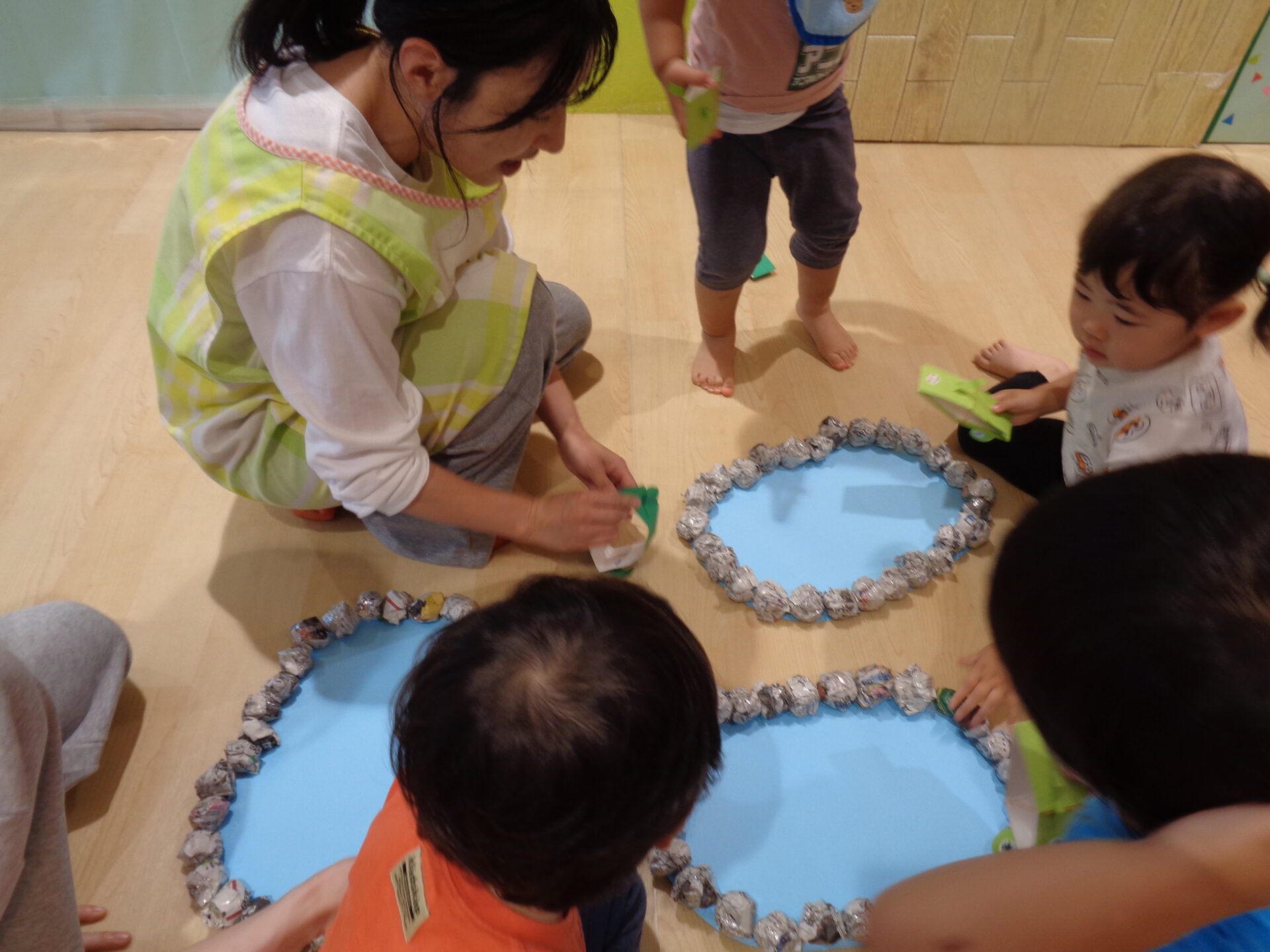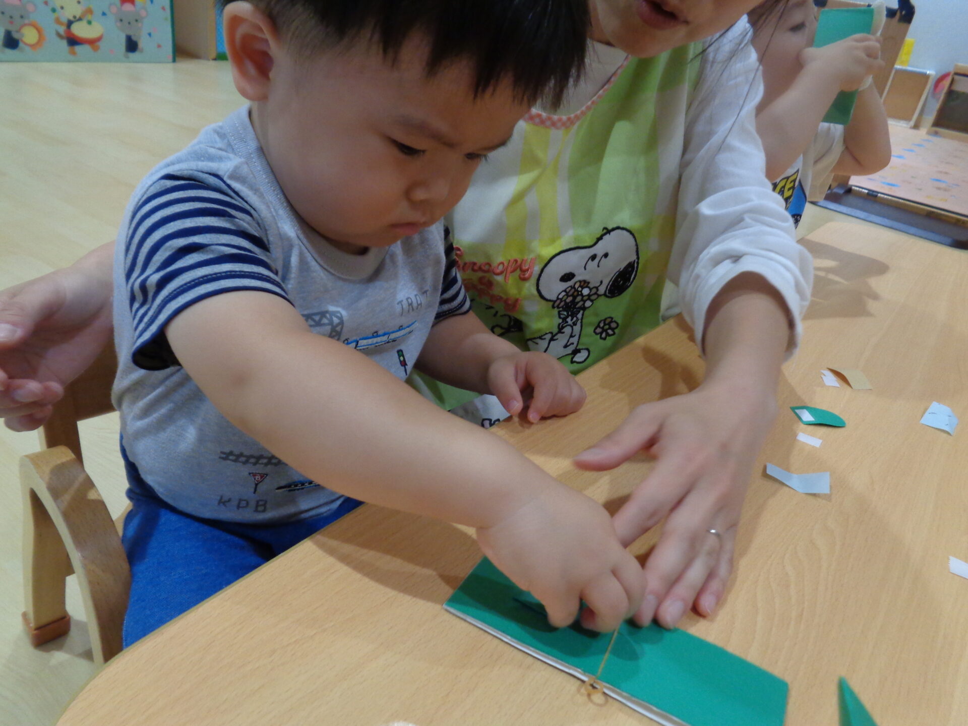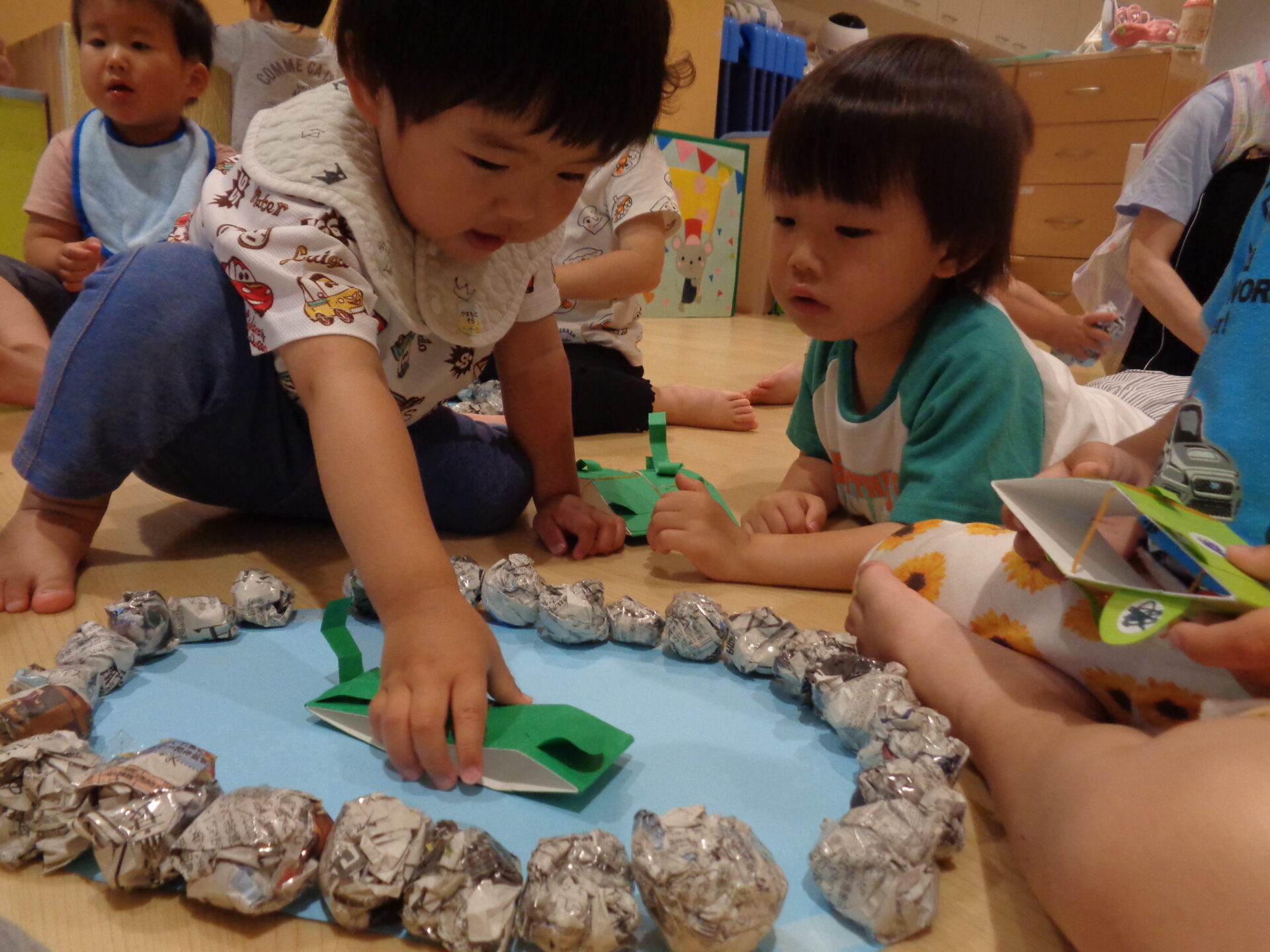 そしてこの日は、「跳ぶカエル」を0.1.2歳児みんなで作ってみました🐸