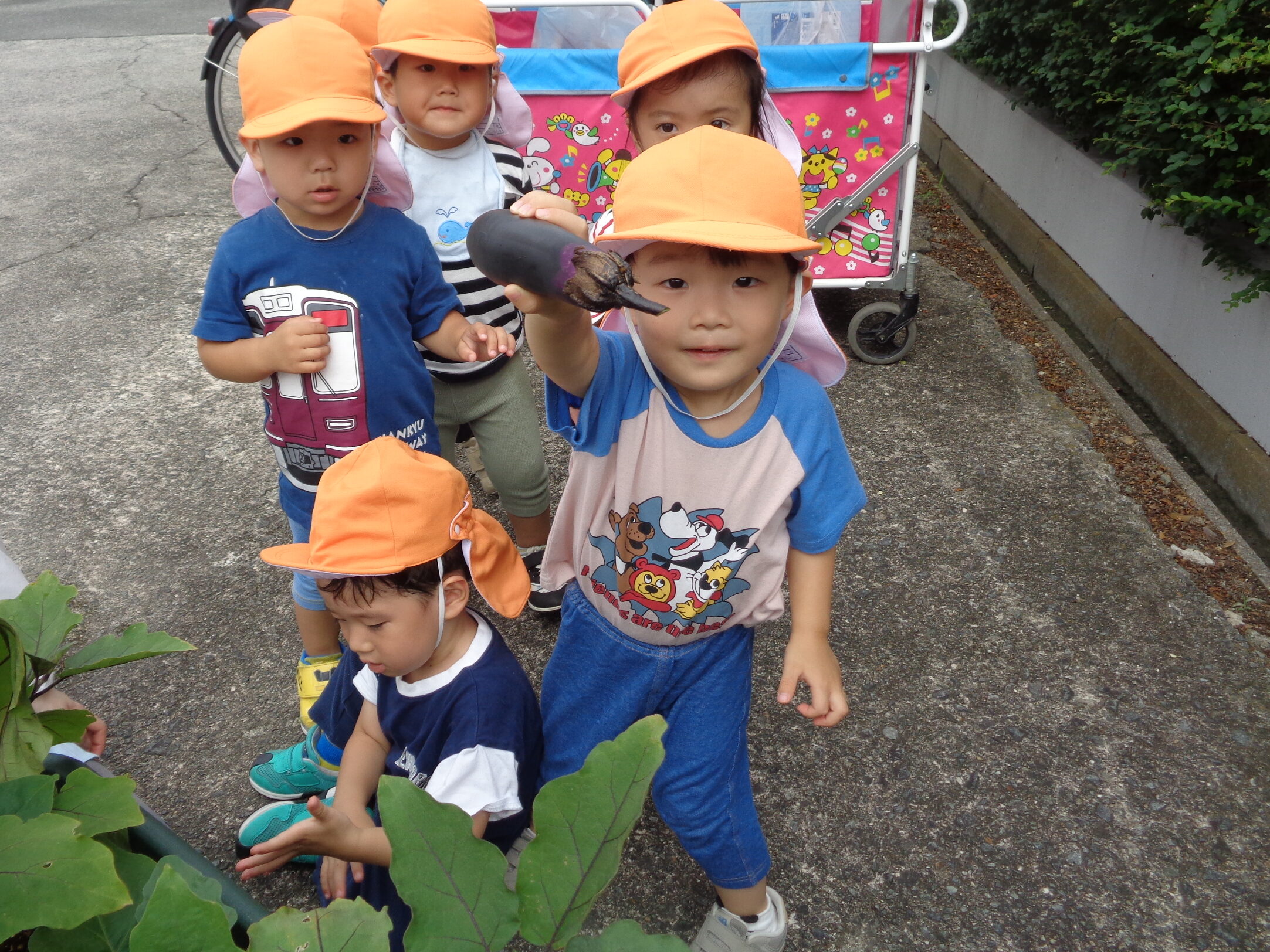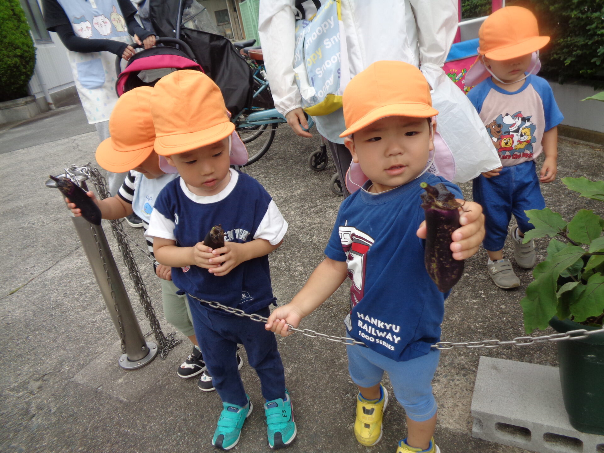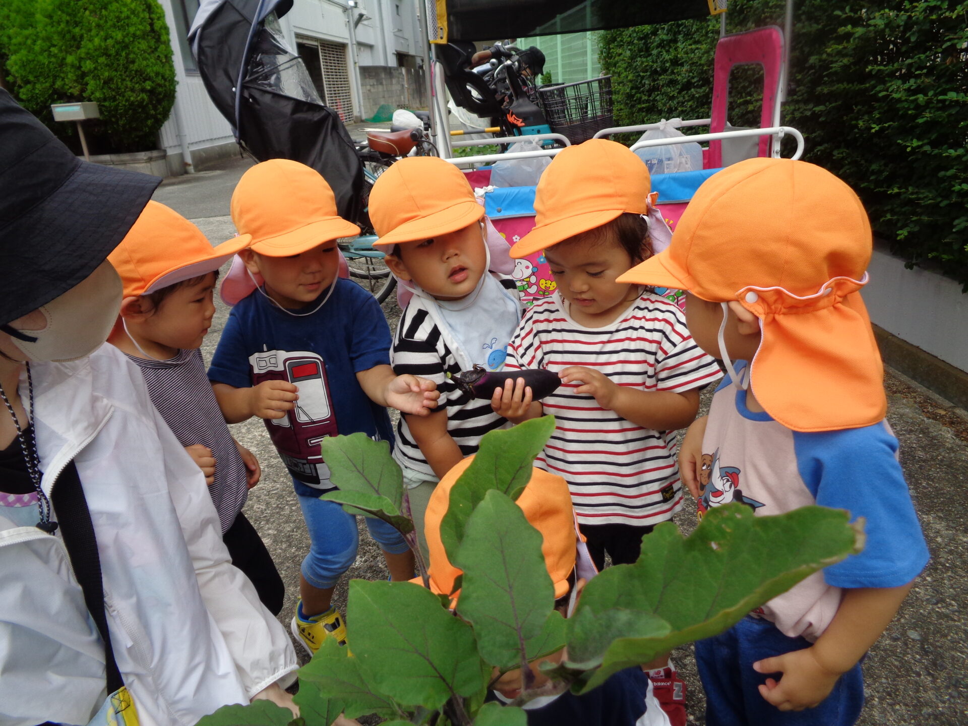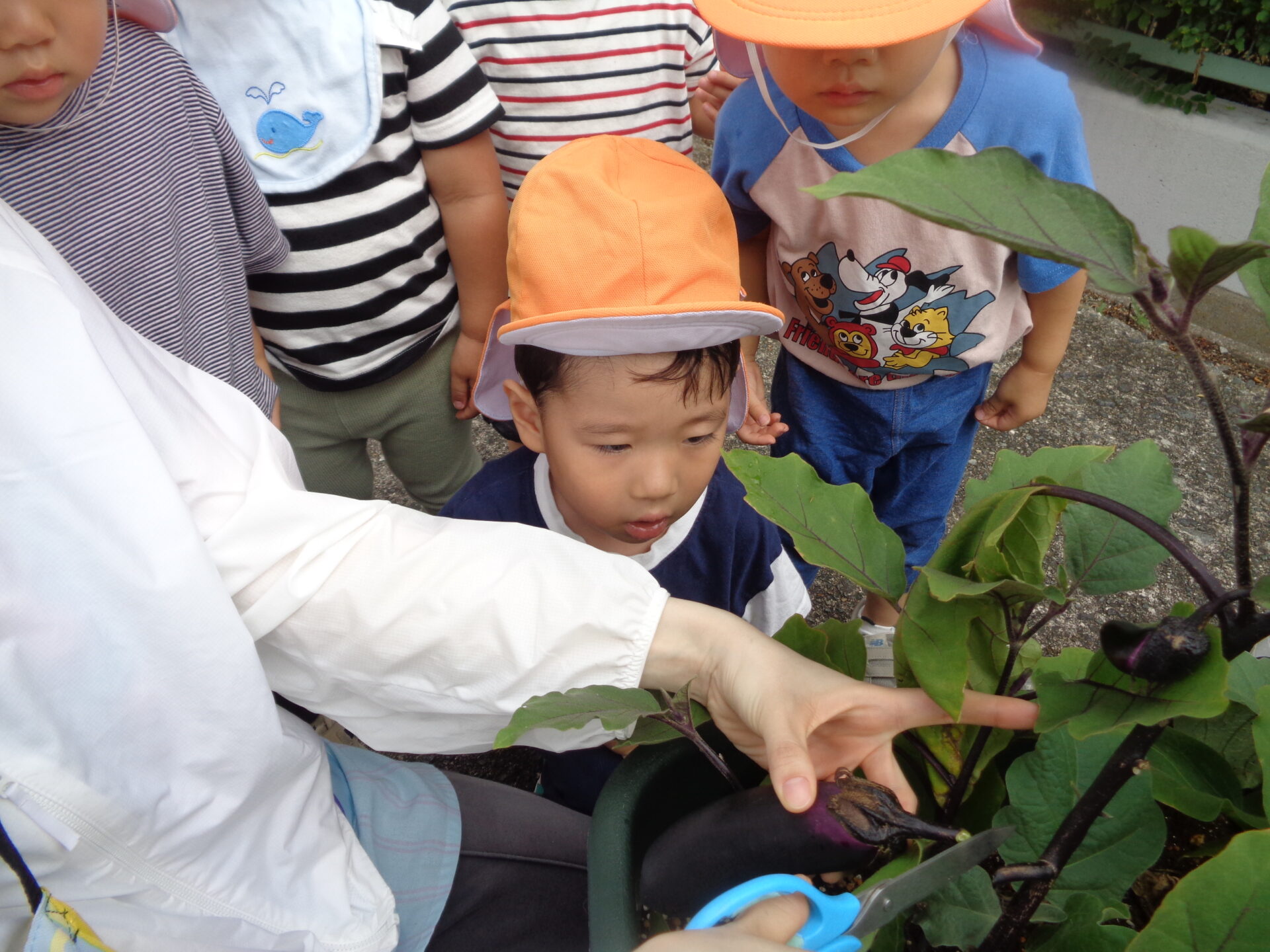 「いちばん大きいなすさんはどれかな?」と聞いてみると、「これー!」と嬉しそうに大きくなったナスを教えてくれてみんなで見守りながら収穫することができました。