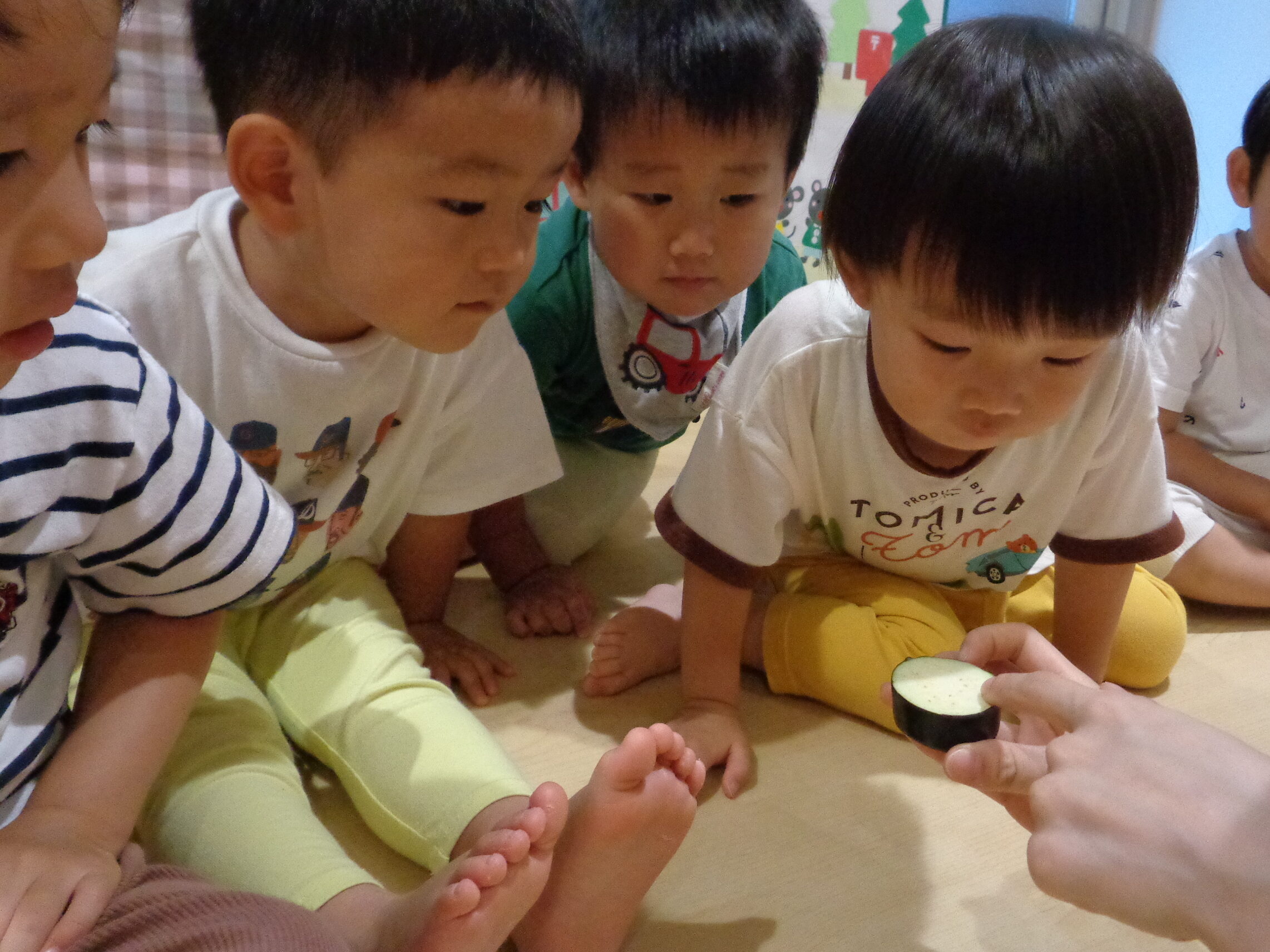 輪切りにしたナスを見ると興味津々でお話を聞いてくれ、「中は白いんだね~。種があるね!」と伝えるとじ~~~っと観察していました👀