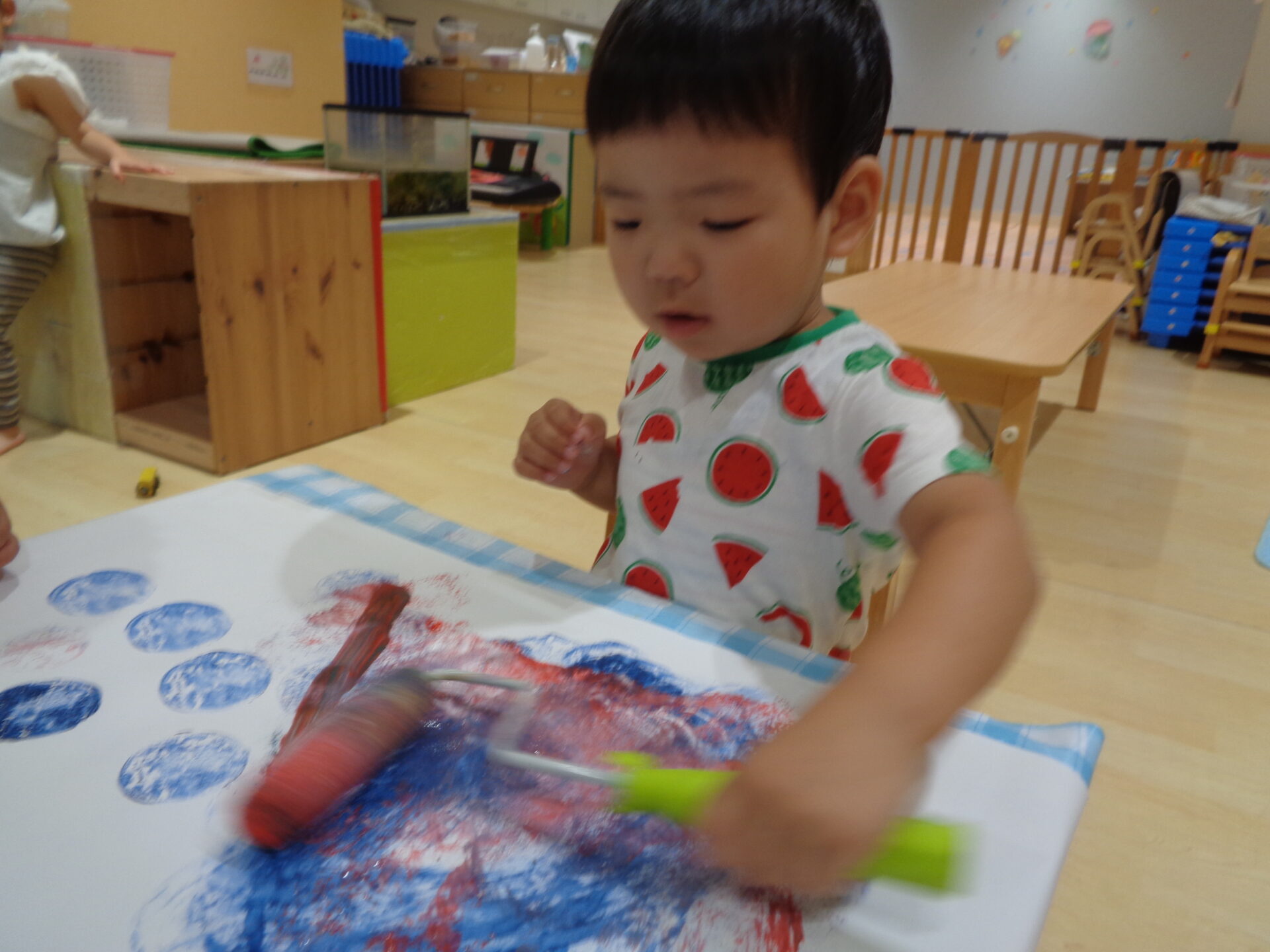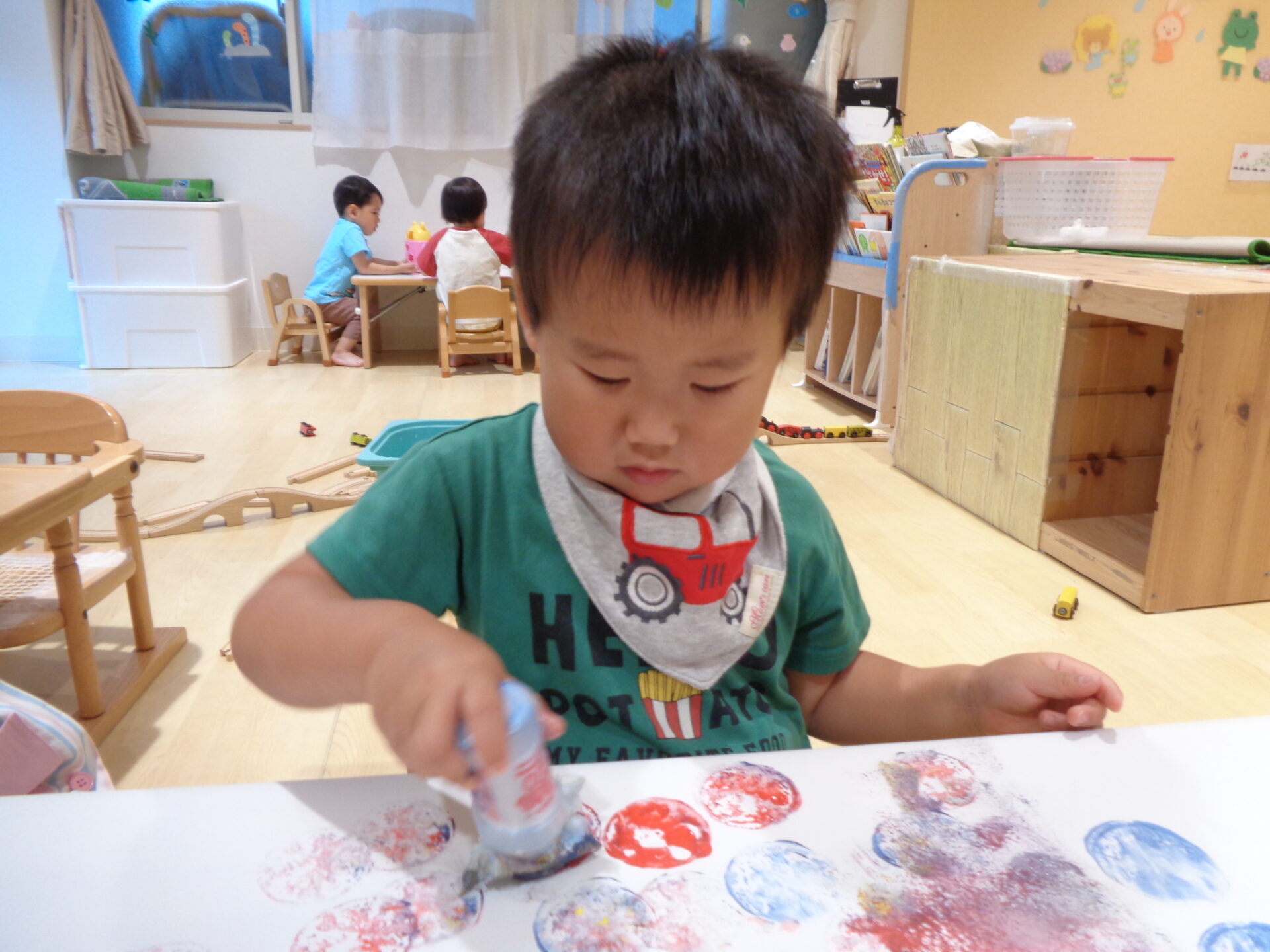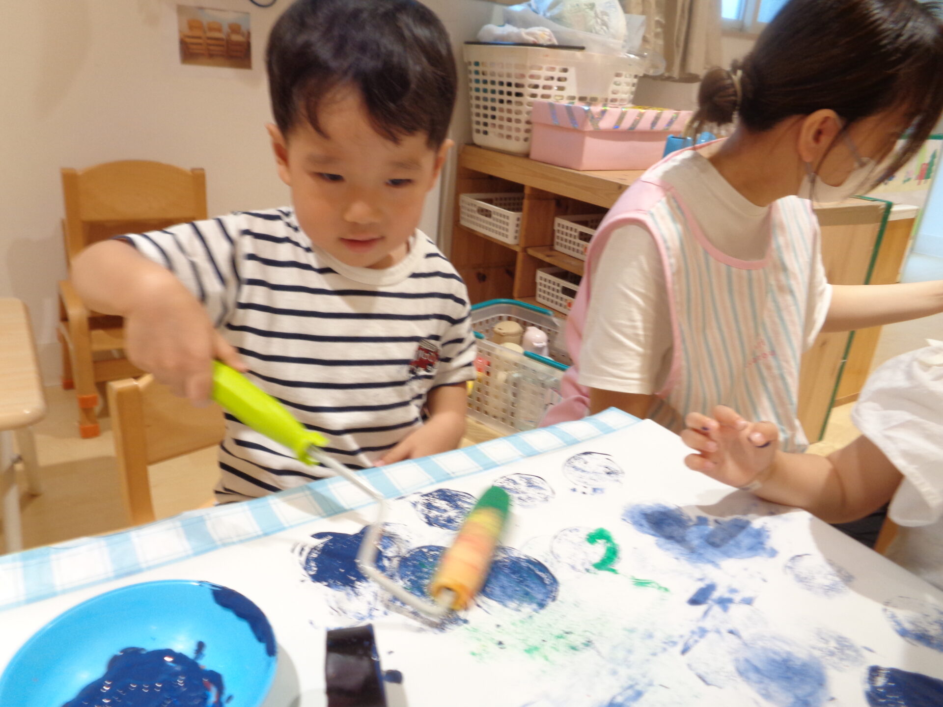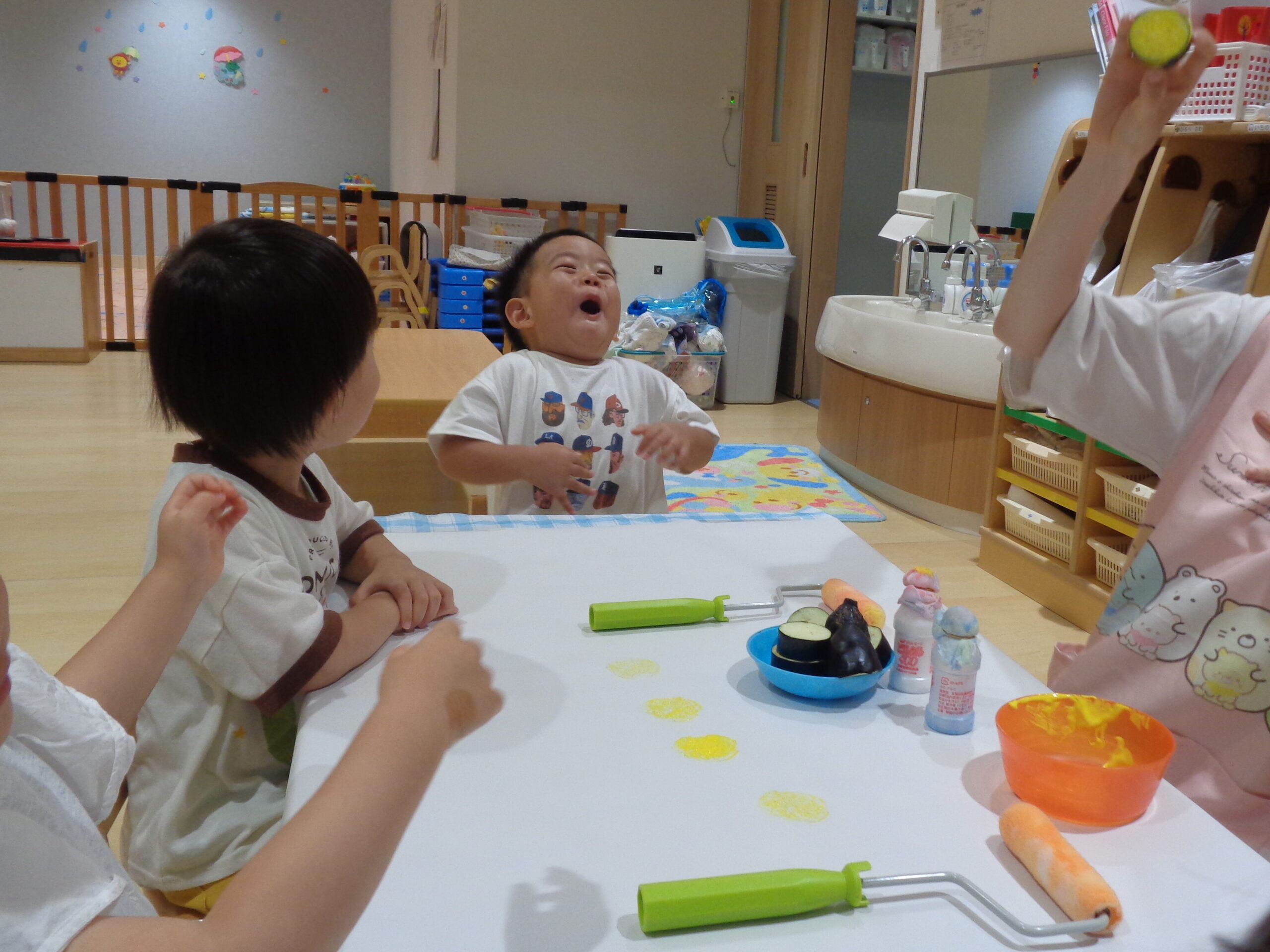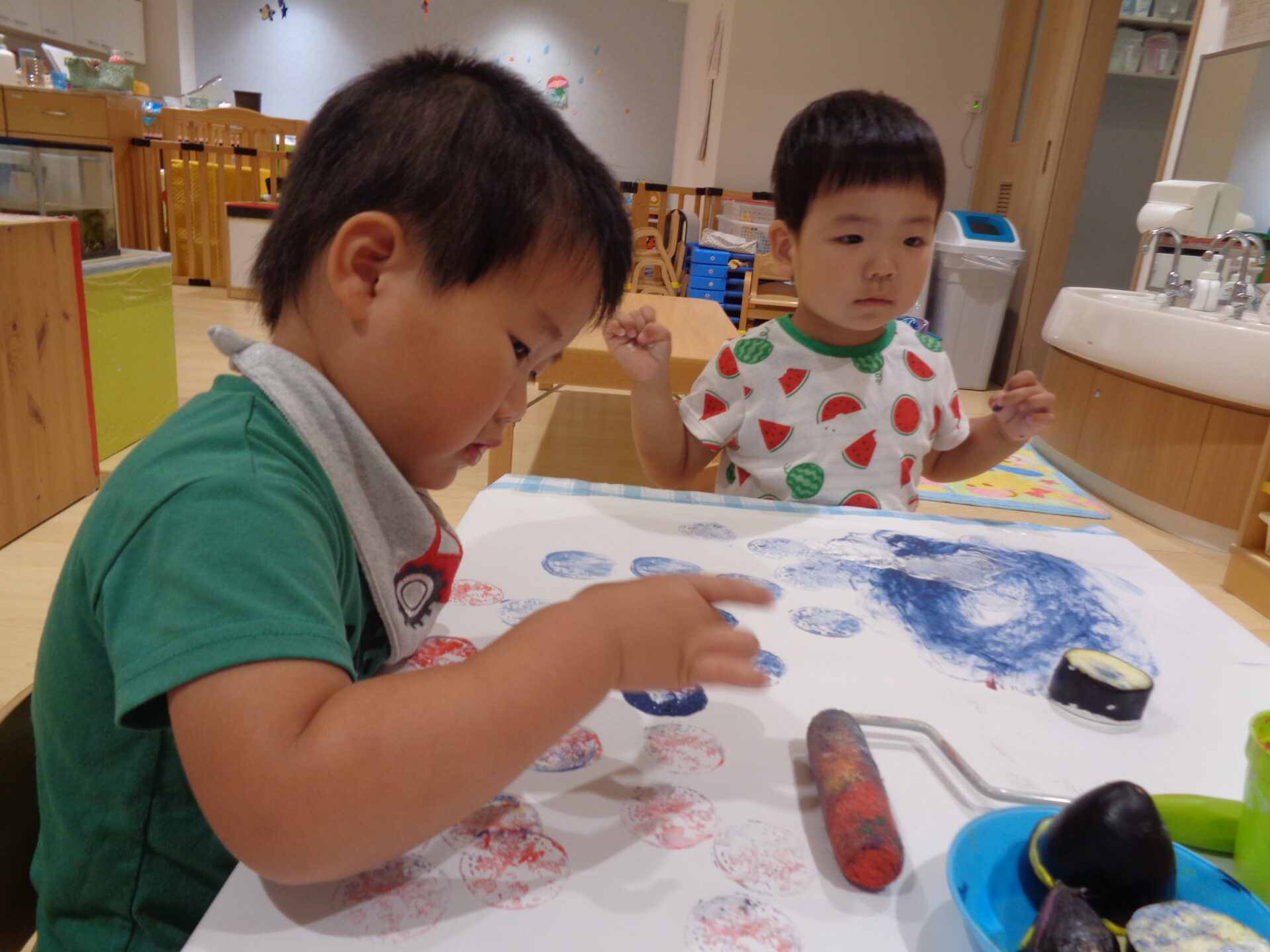 そして、ナスだけではなくタンポやローラーでも絵の具遊びを楽しみました☺