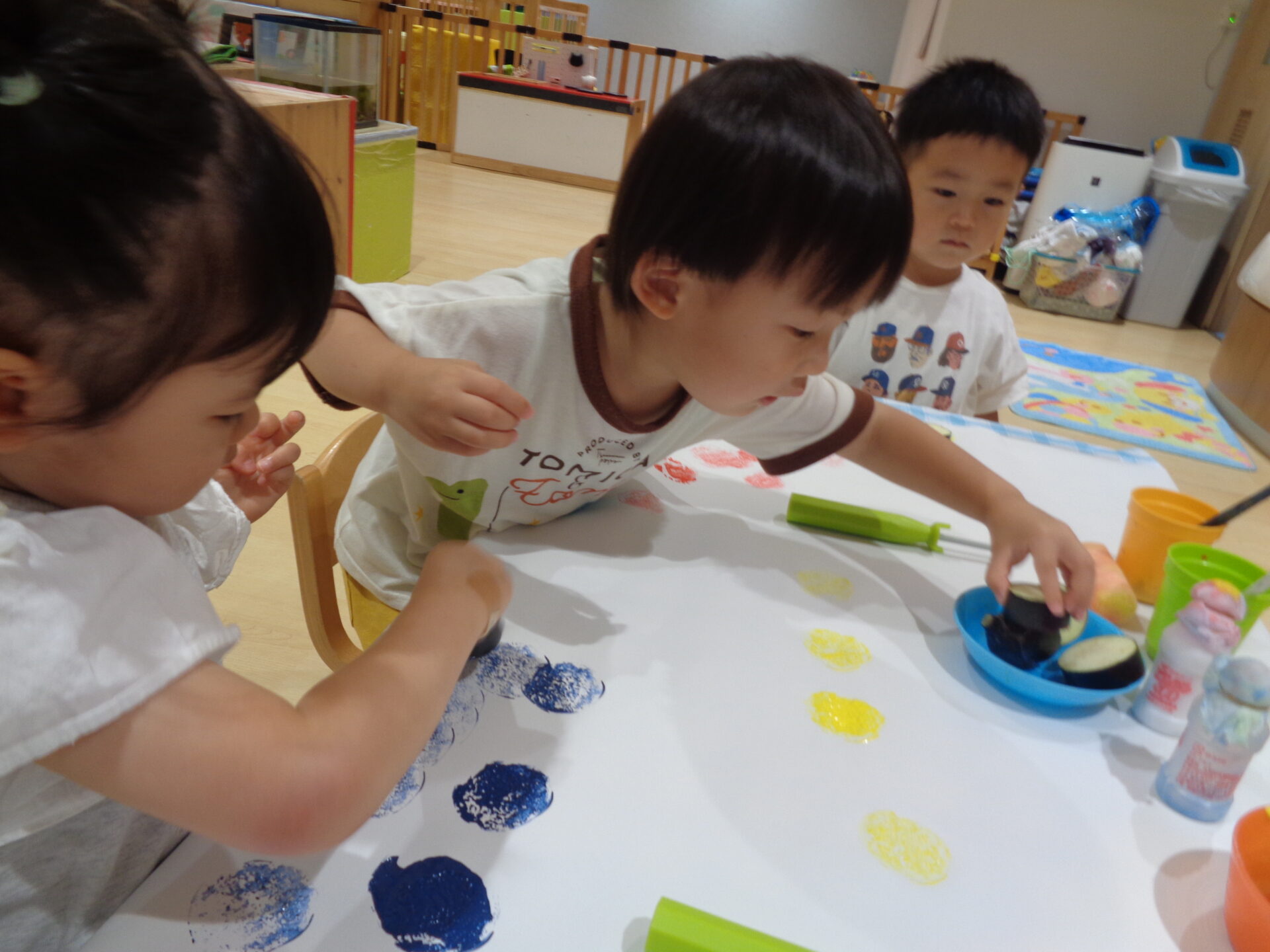 一人ずつ好きな色を選んでナスを持ち、ぽんぽんっとたくさんナスの模様を出して楽しんでいます。