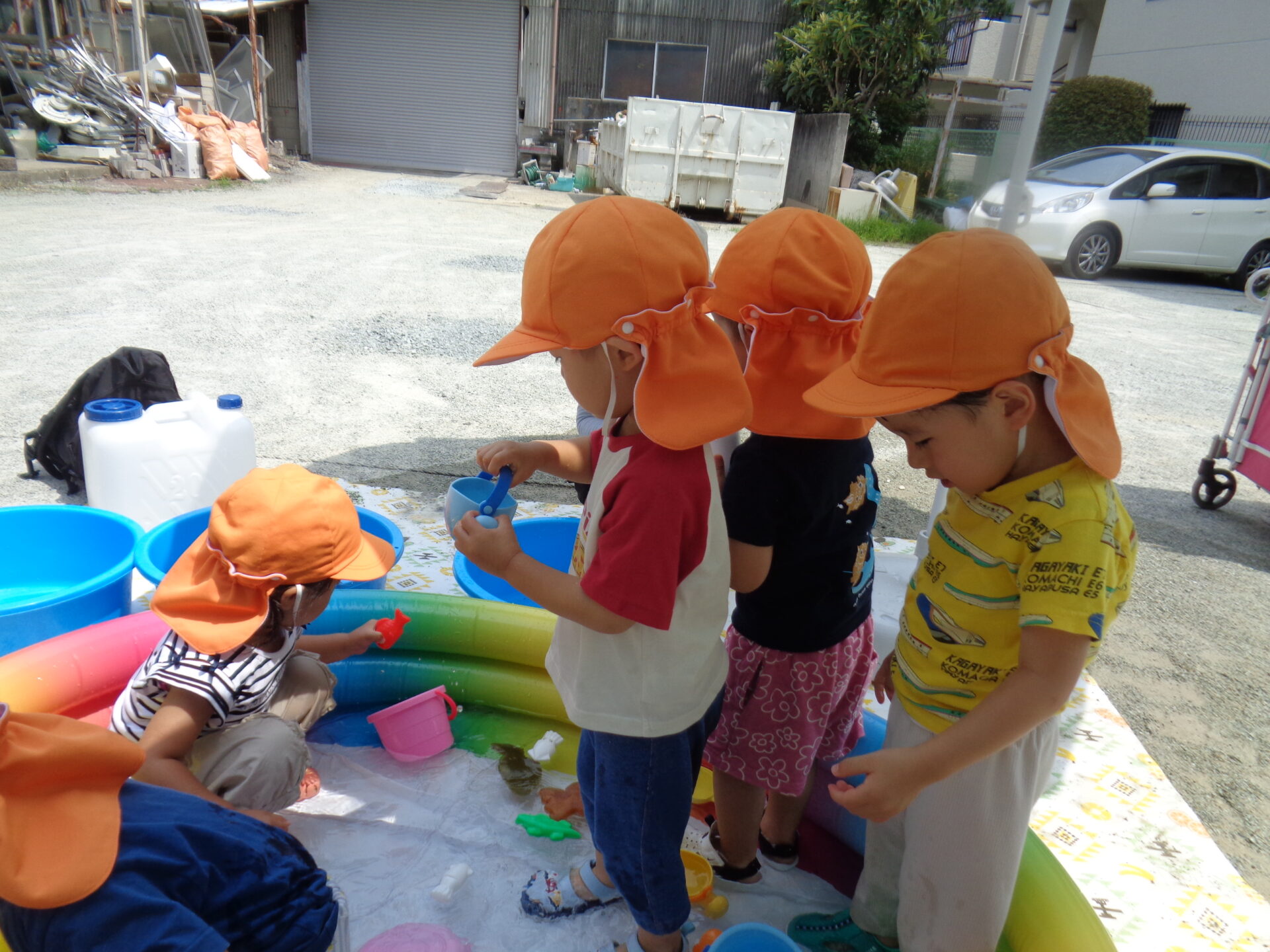 みんなお気に入りのサンダルを履いてプールのある駐車場に向かい、プールが見えてくると「はやくはやく~!」と早足になって向かおうとするお友だちも🤭