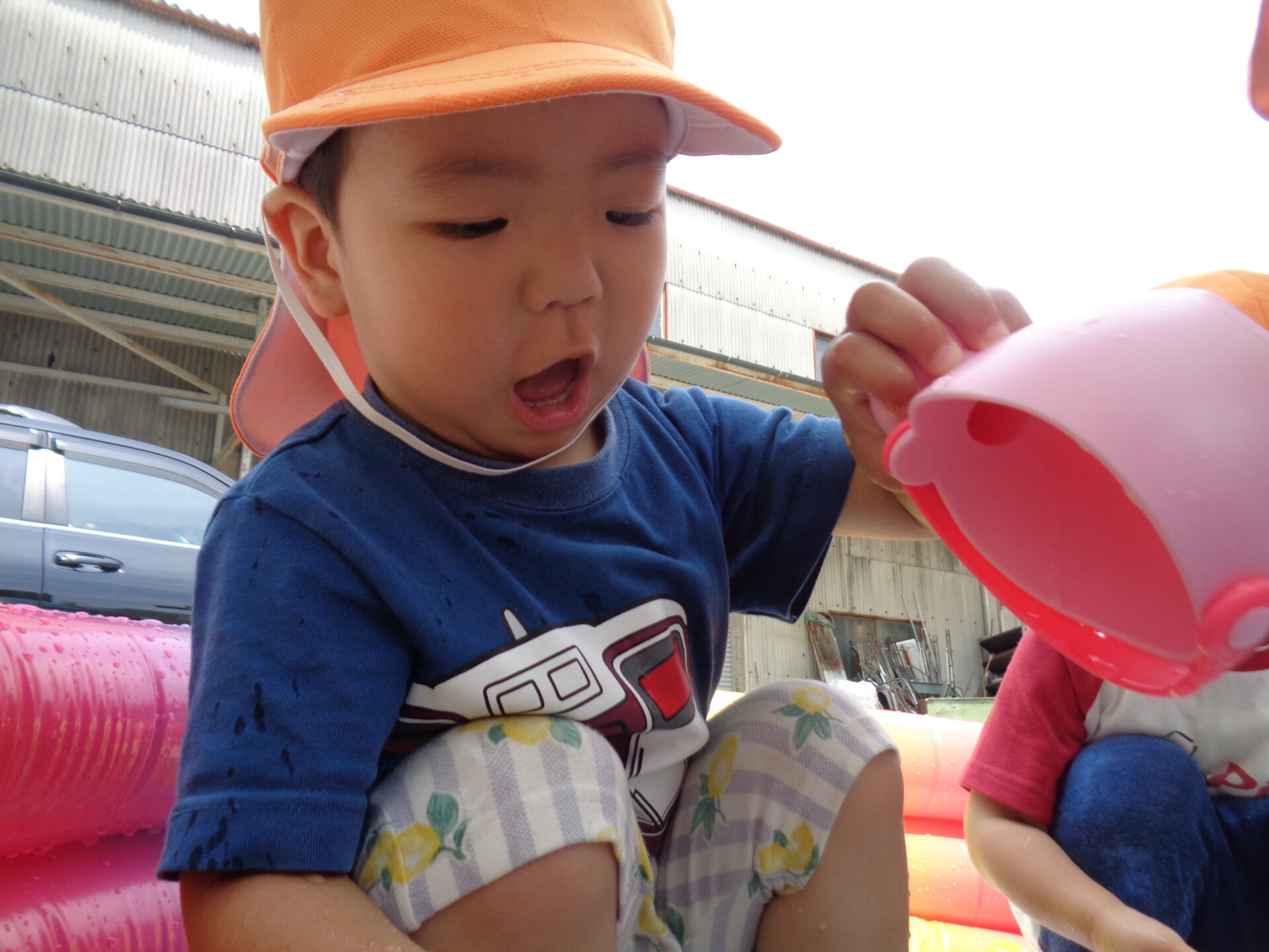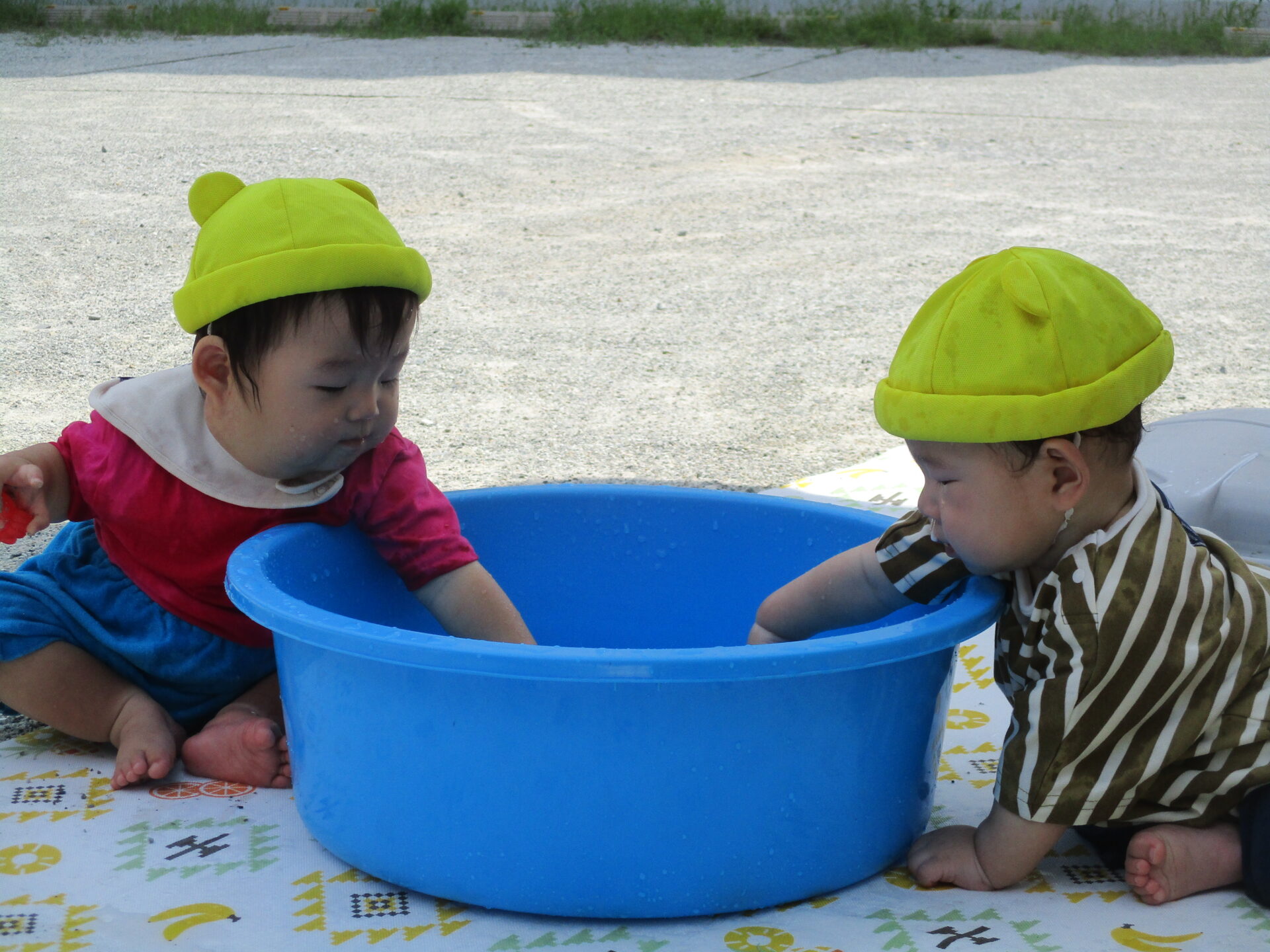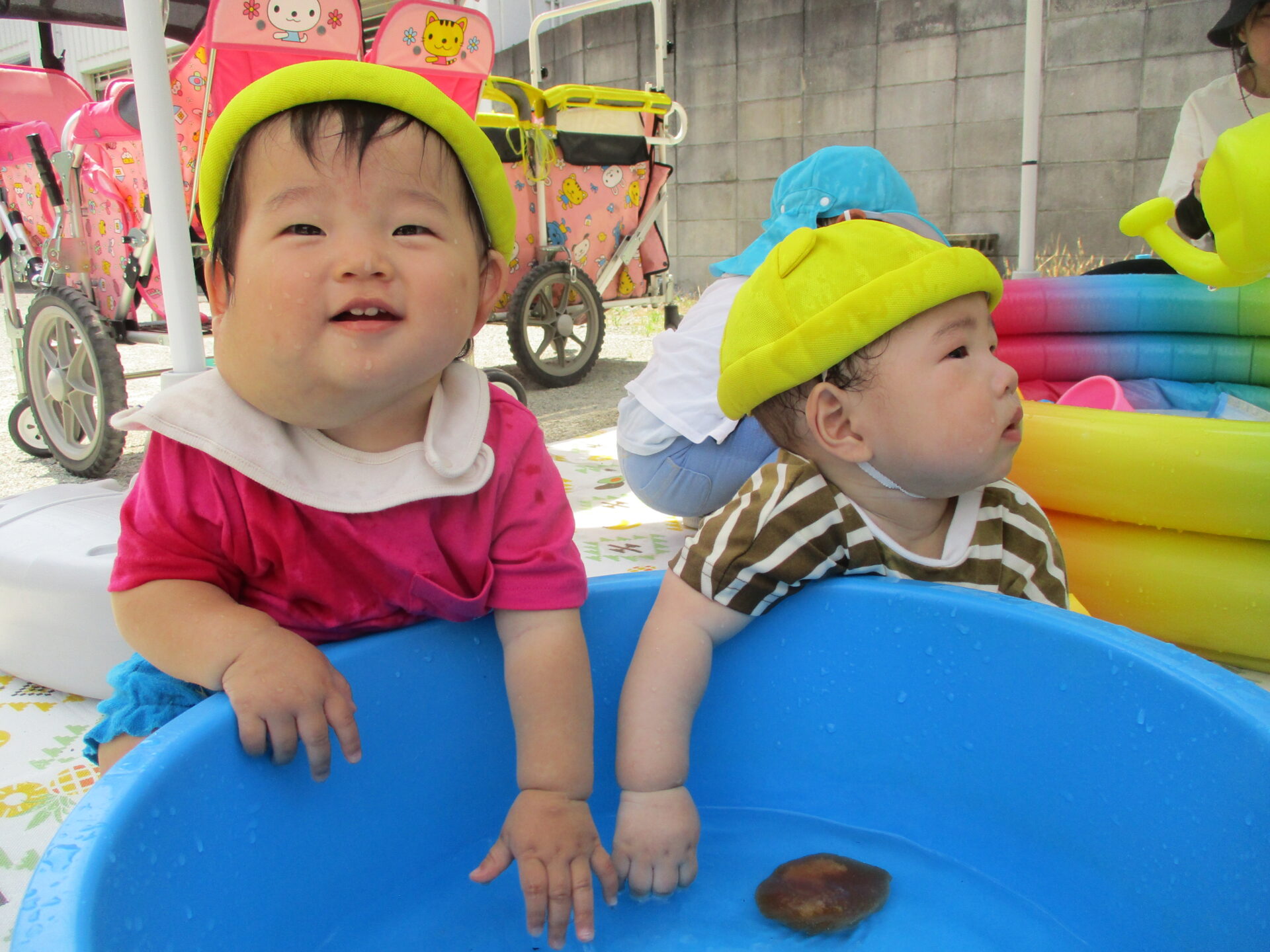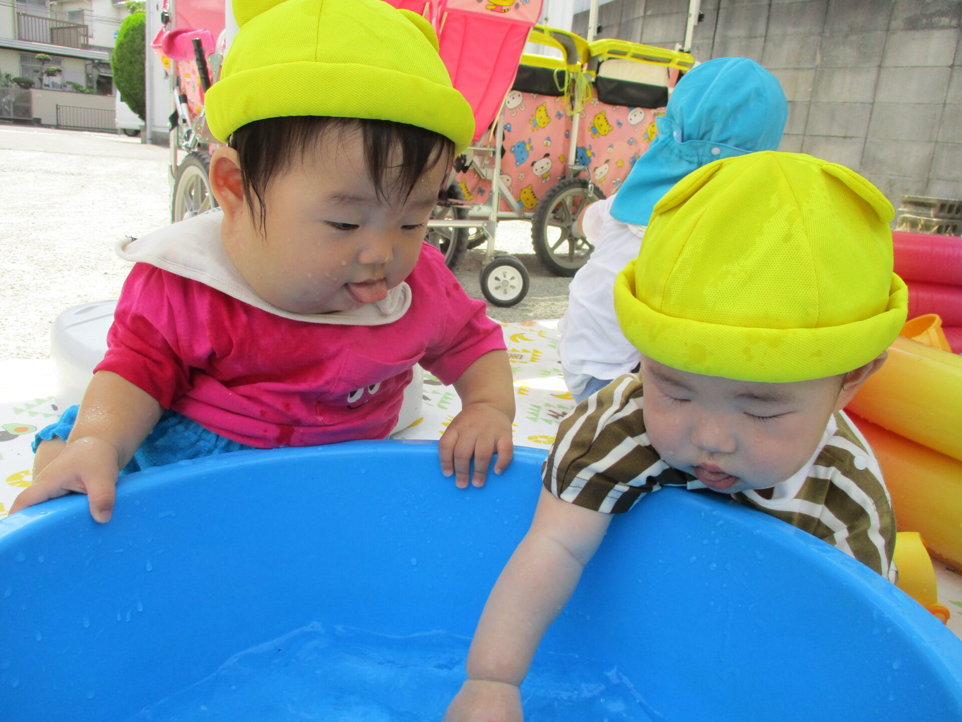 プールのお隣でたらいを使ってちゃぷちゃぷとお水の感触や冷たさを楽しんでいます。