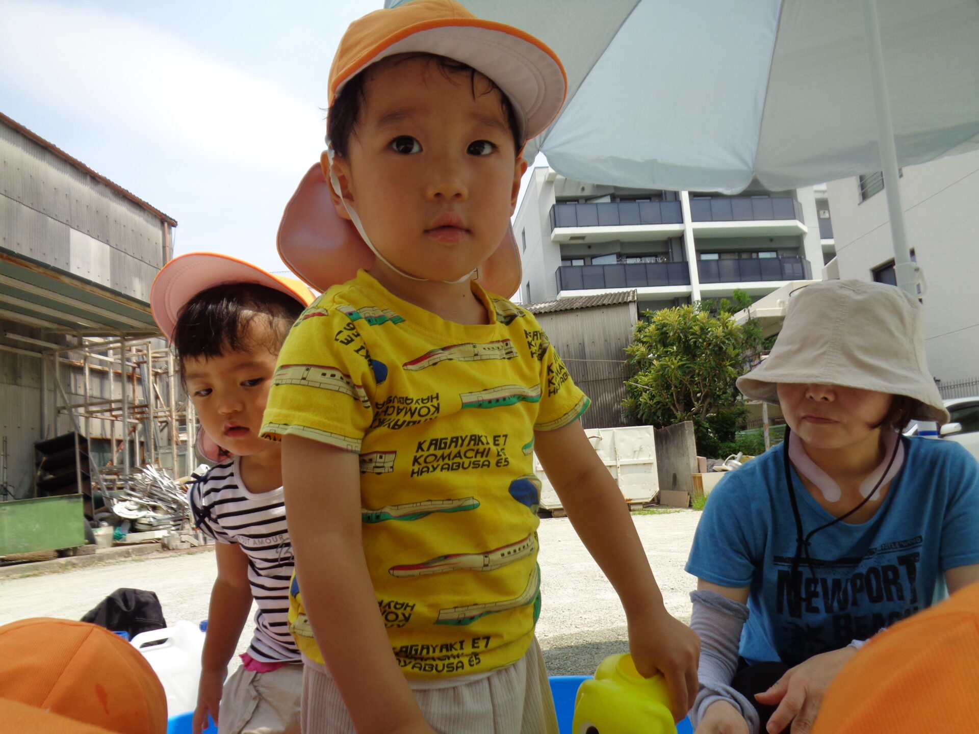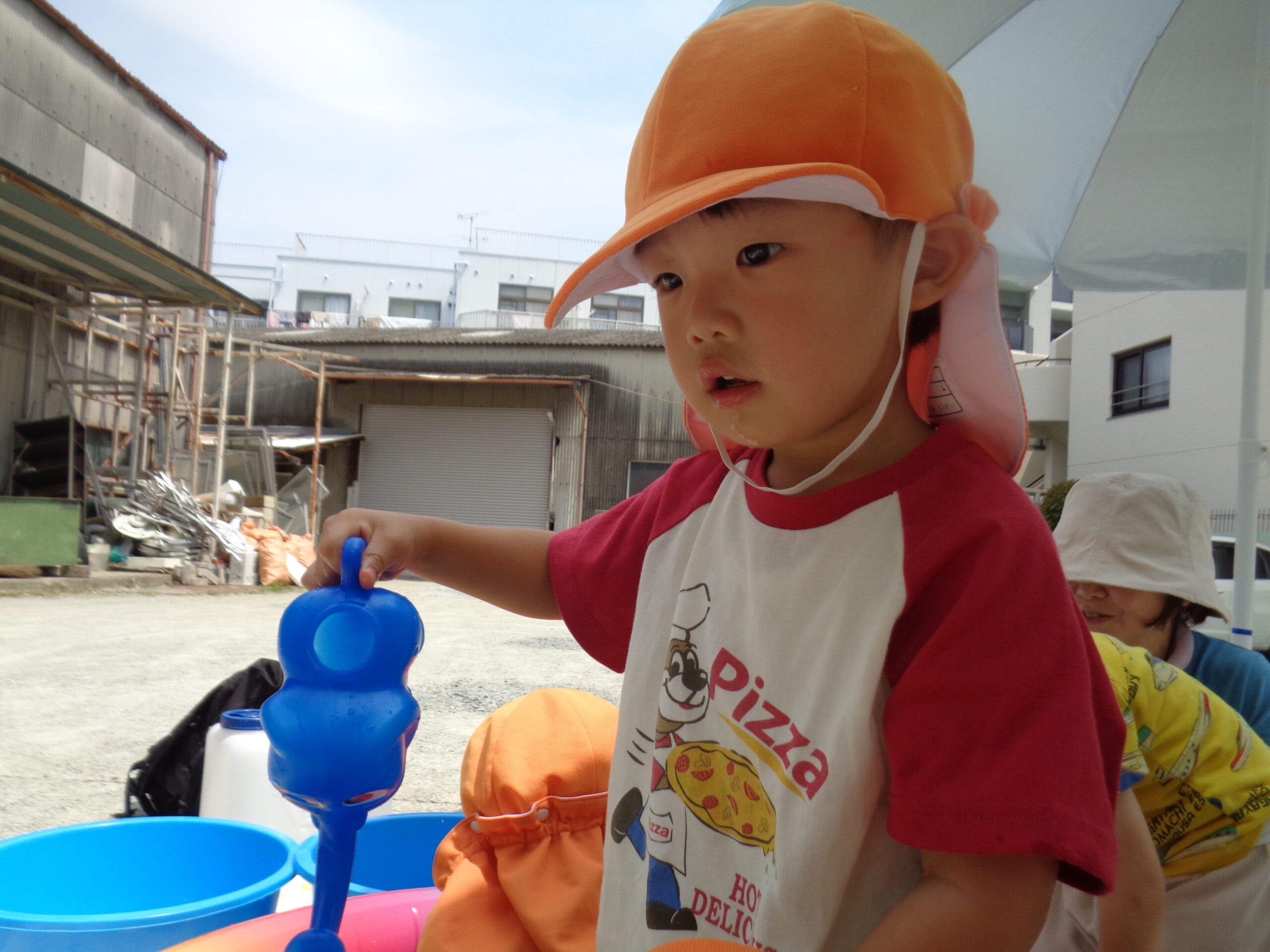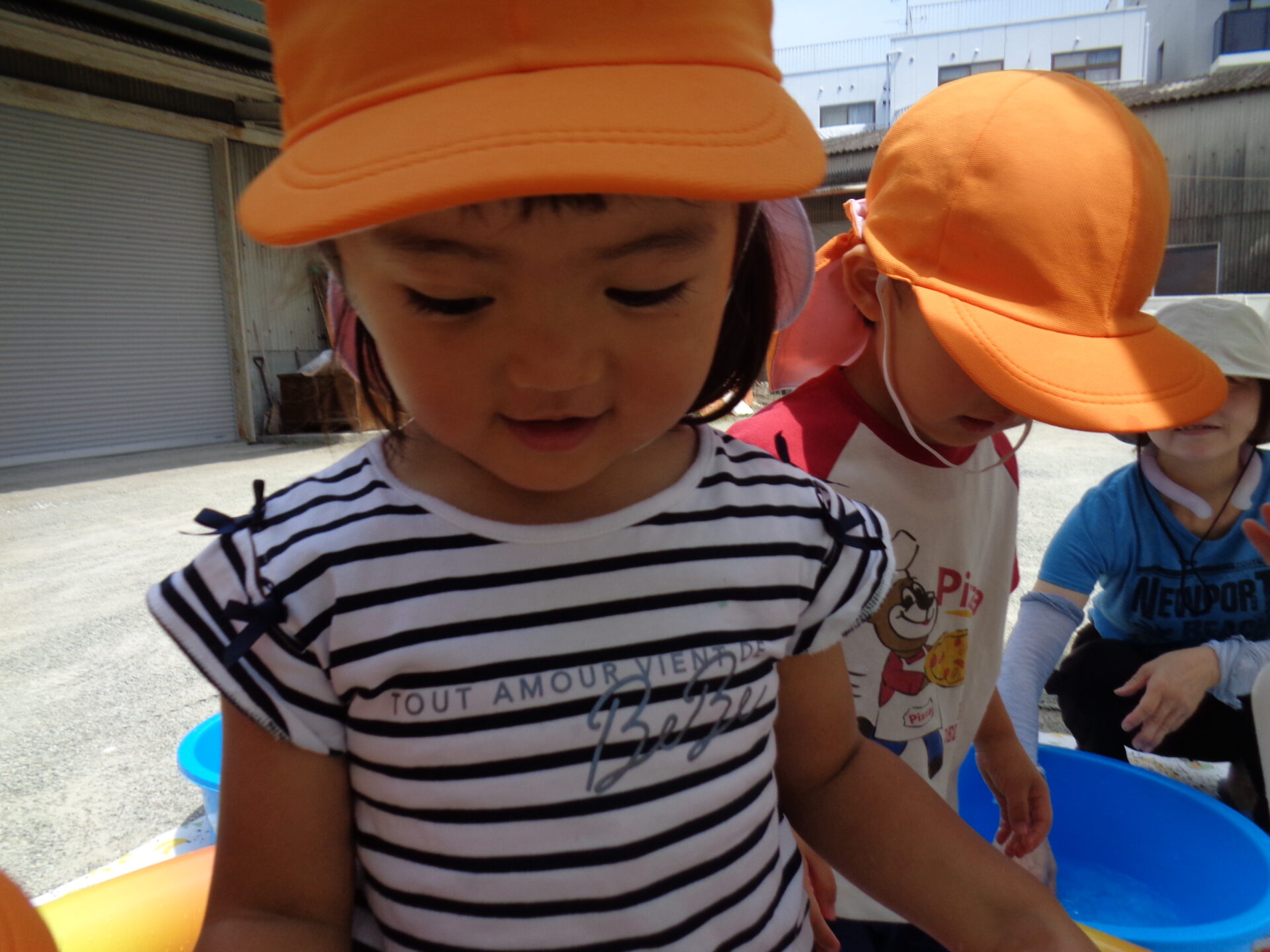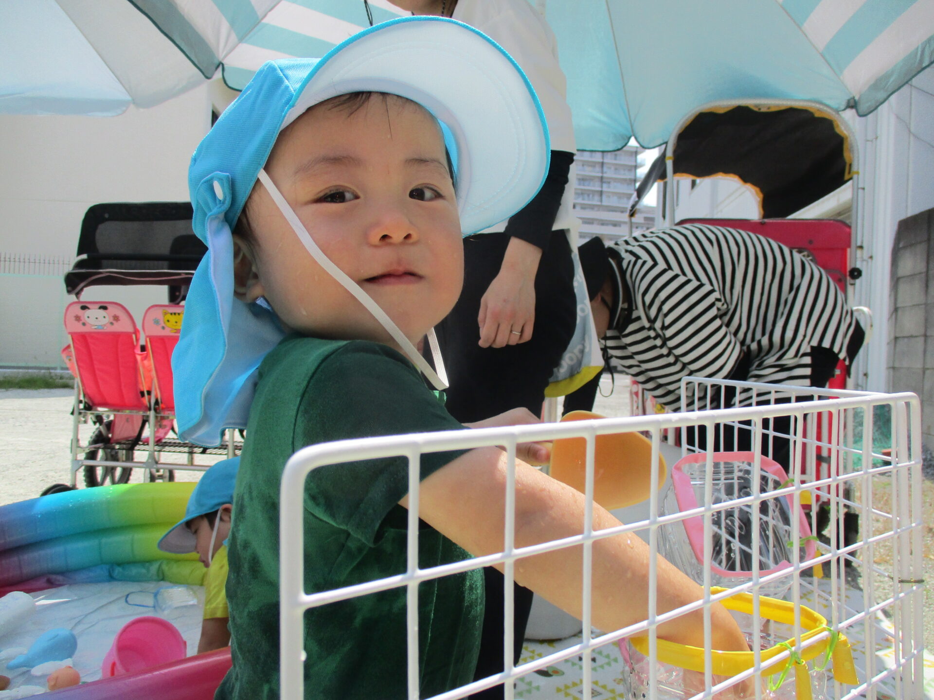 プールのお隣でたらいを使ってちゃぷちゃぷとお水の感触や冷たさを楽しんでいます。