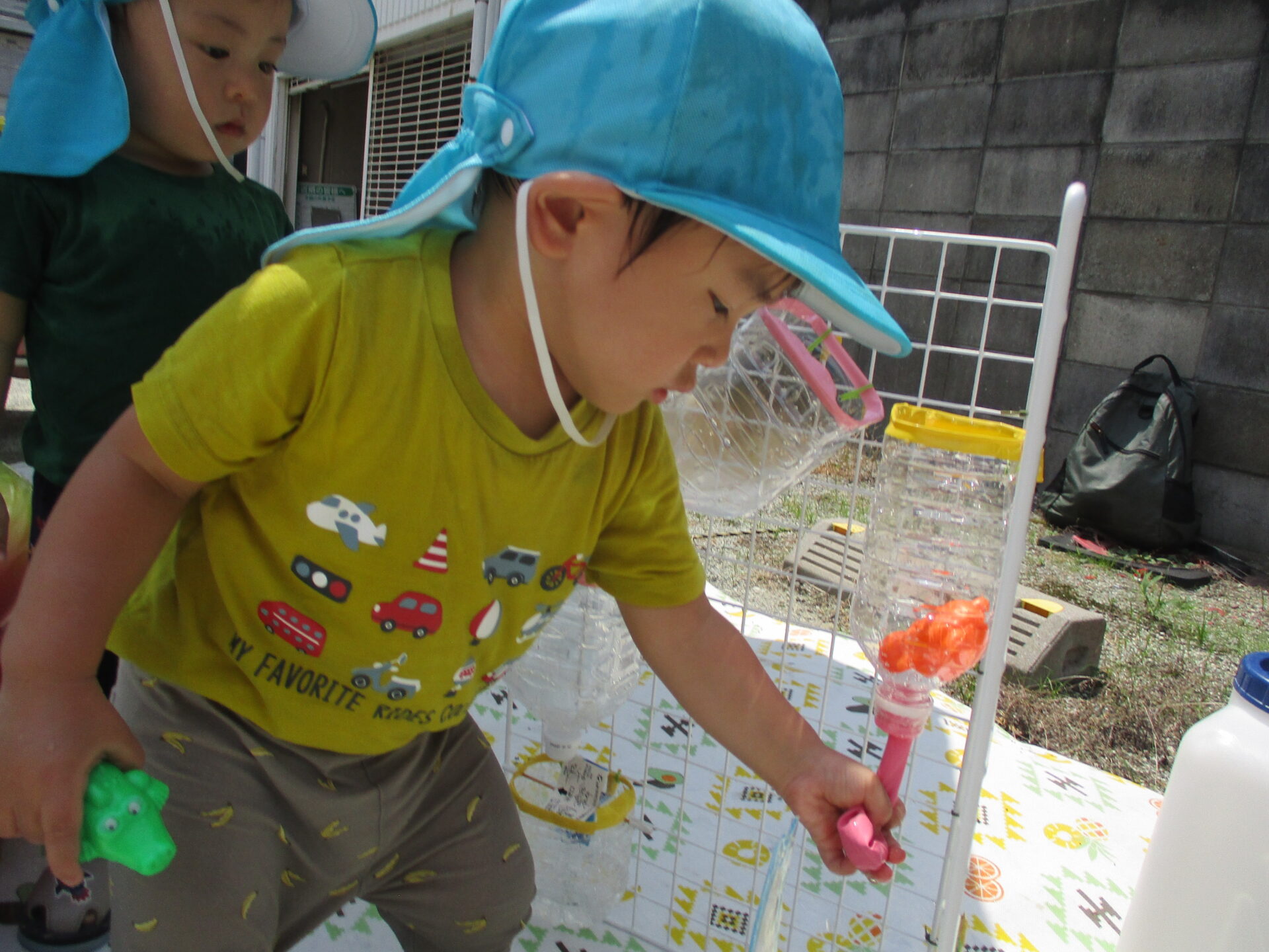 お水が流れていく仕掛け玩具も、おもちゃを使ってお水を流して楽しみました!