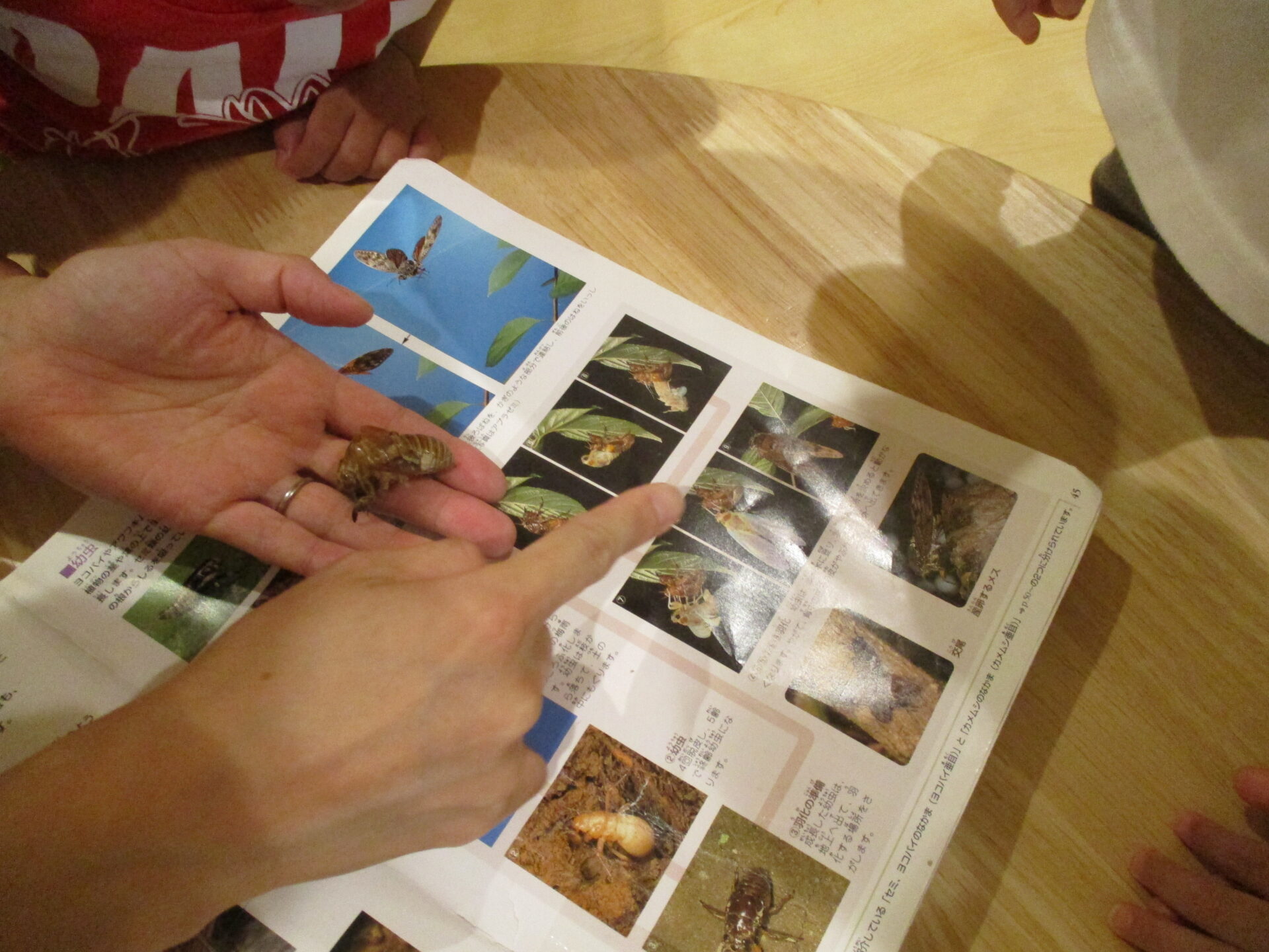 そして、朝ちょうど抜け殻を持ってきてくれたお友だちがいたので、図鑑と照らし合わせながら観察しました。