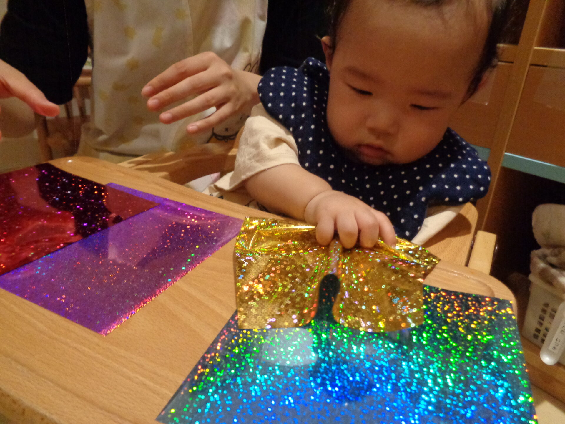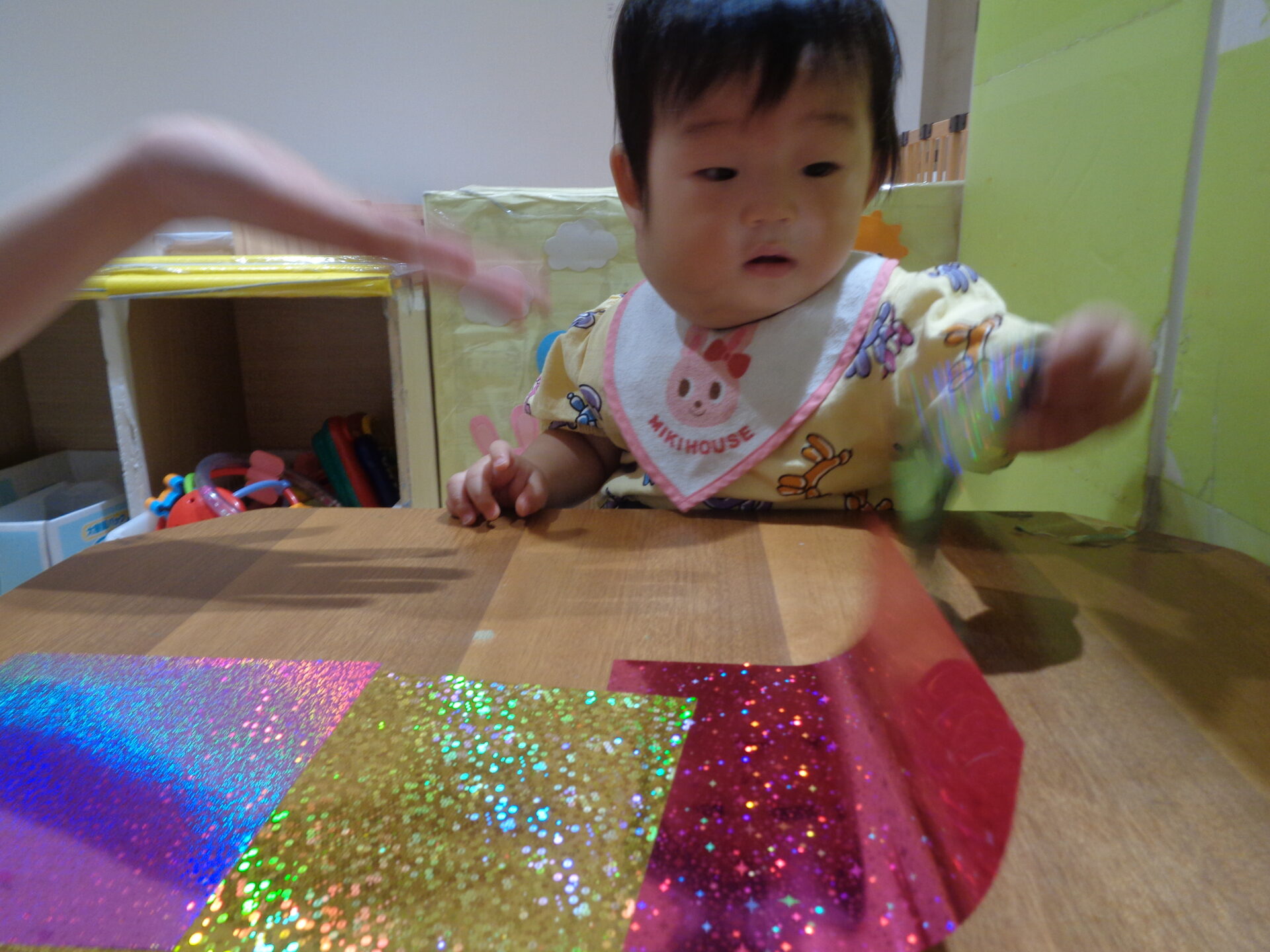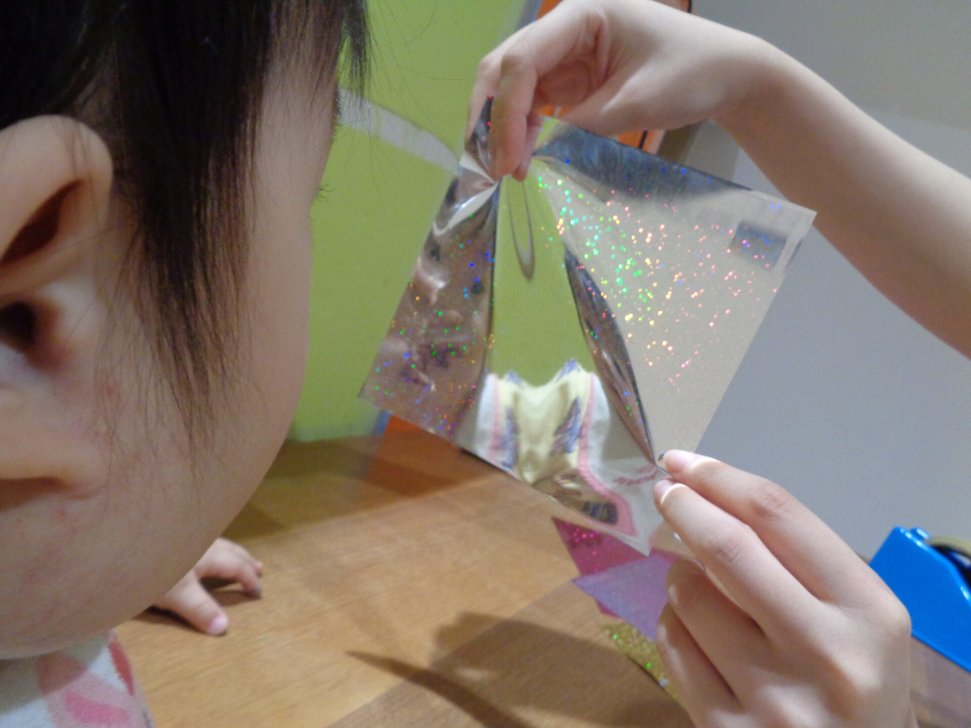 折り紙が反射して自分が映っていることに衝撃を受けたり