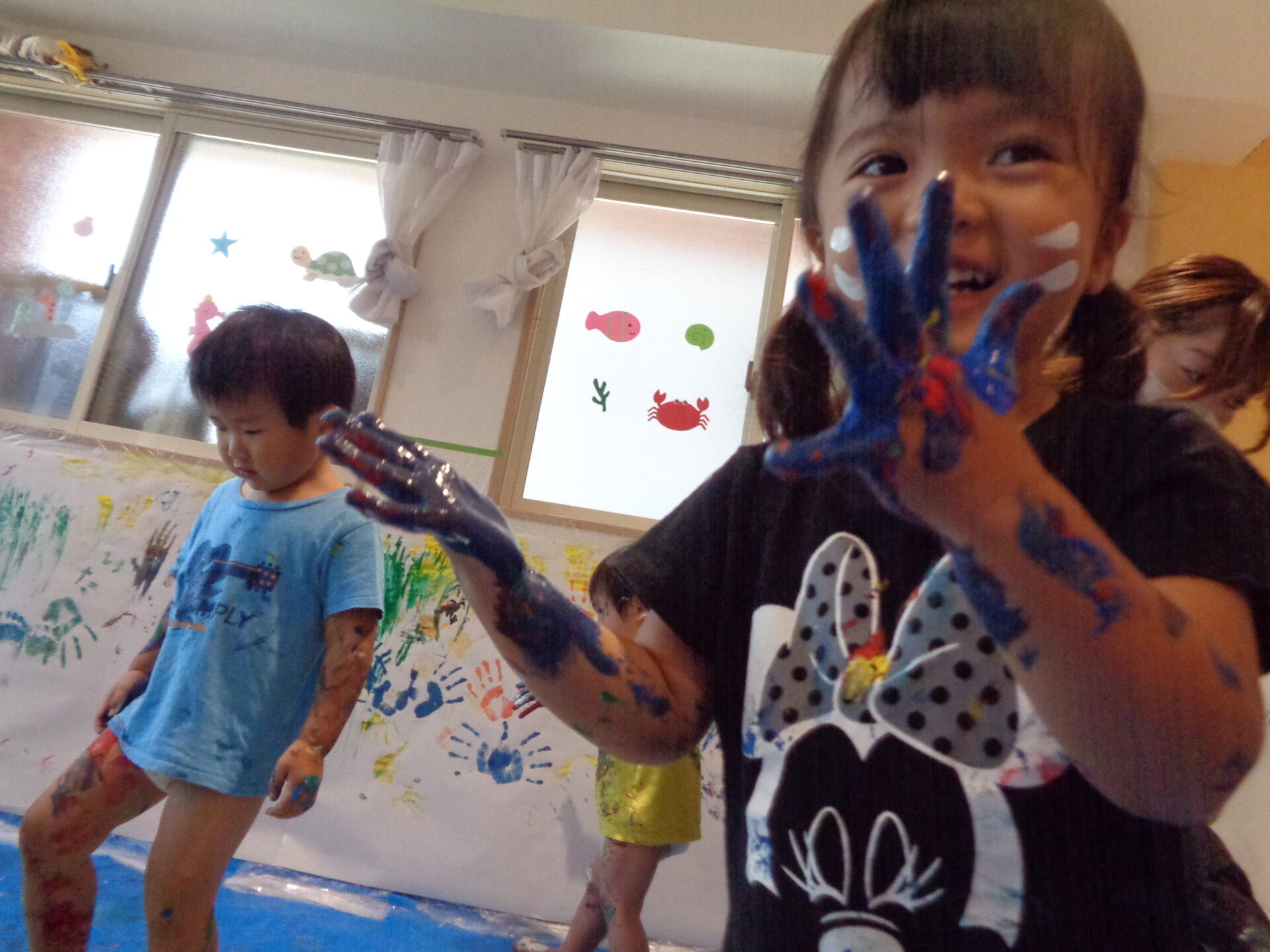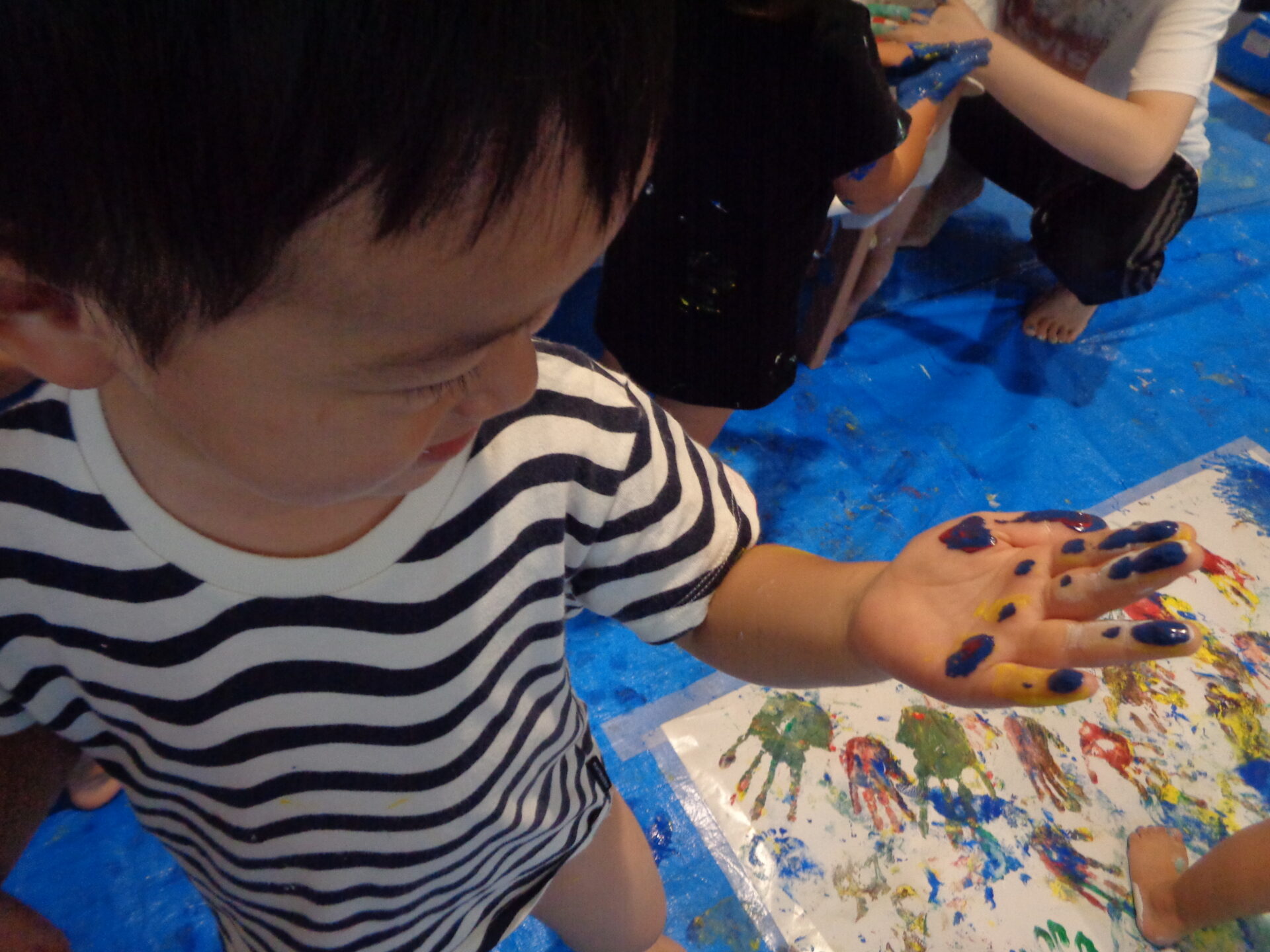 去年は指でちょこんっと絵の具を触ることが精いっぱいだった子たちが、今年はこんなに笑顔で活動に楽しんで参加してくれました。