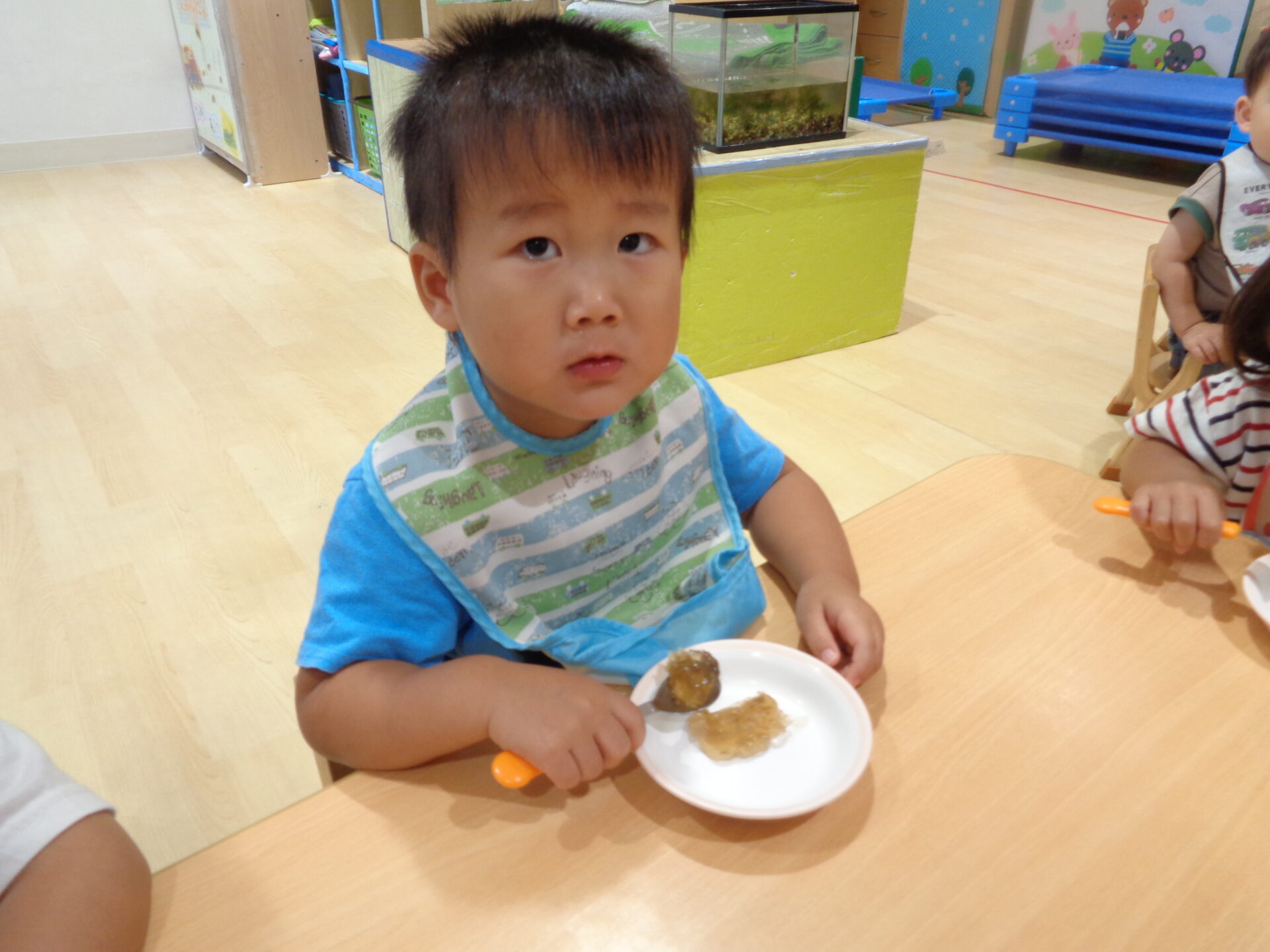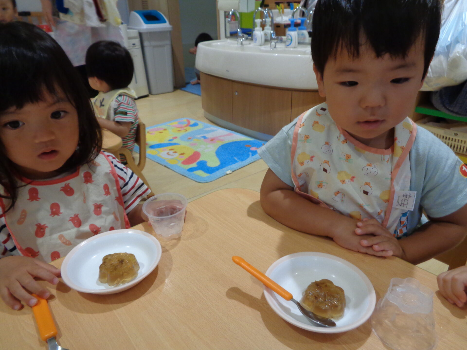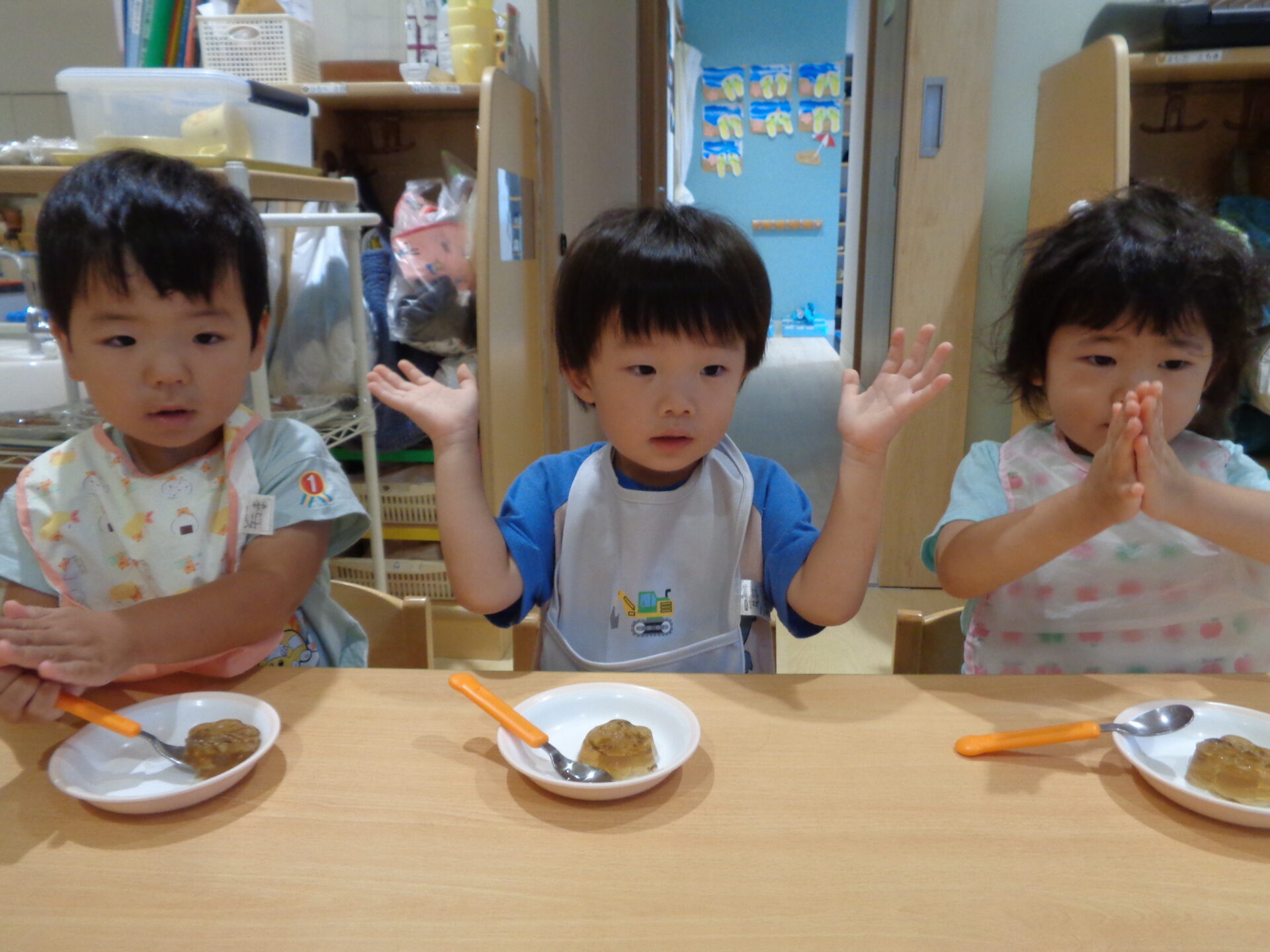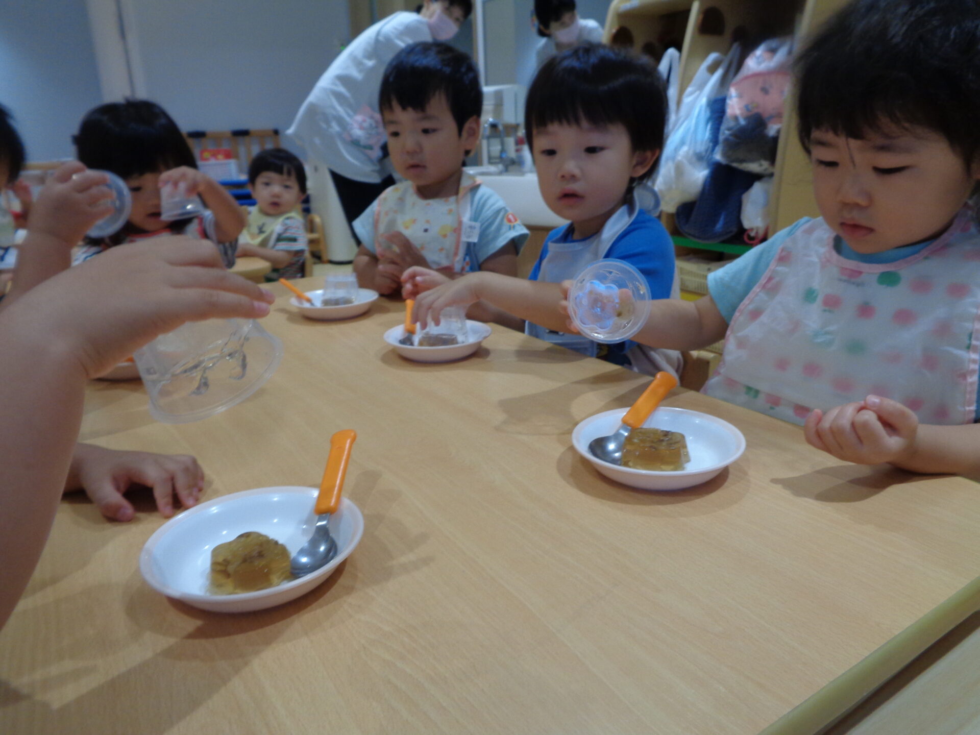 ゼリーカップを冷蔵庫に入れて、固まるまでお給食やお昼寝の時間を過ごしたあめ組さん。