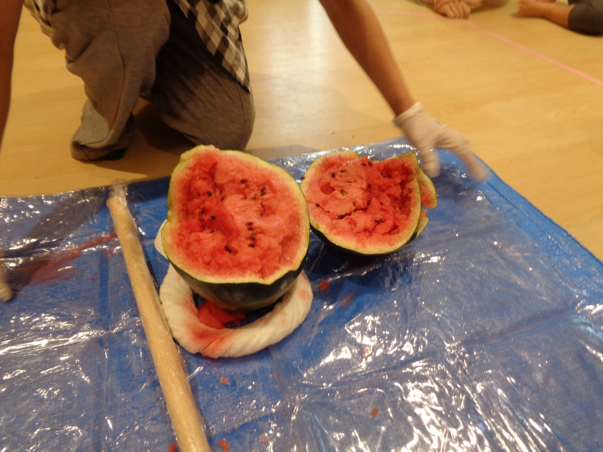 硬い硬いすいかはなかなか割れず、木魚を叩くように何度もコンコンコンと叩く子もいました😆