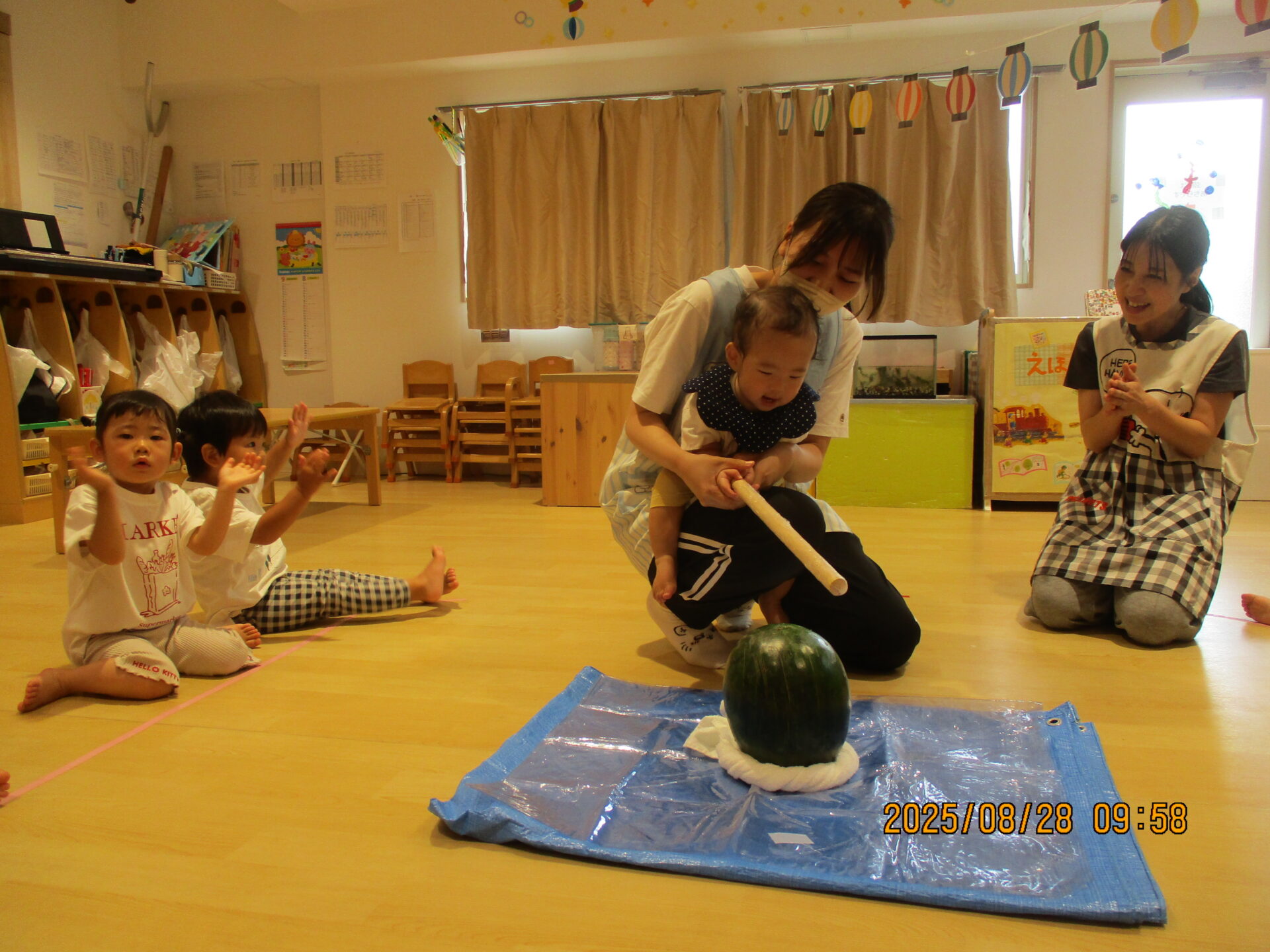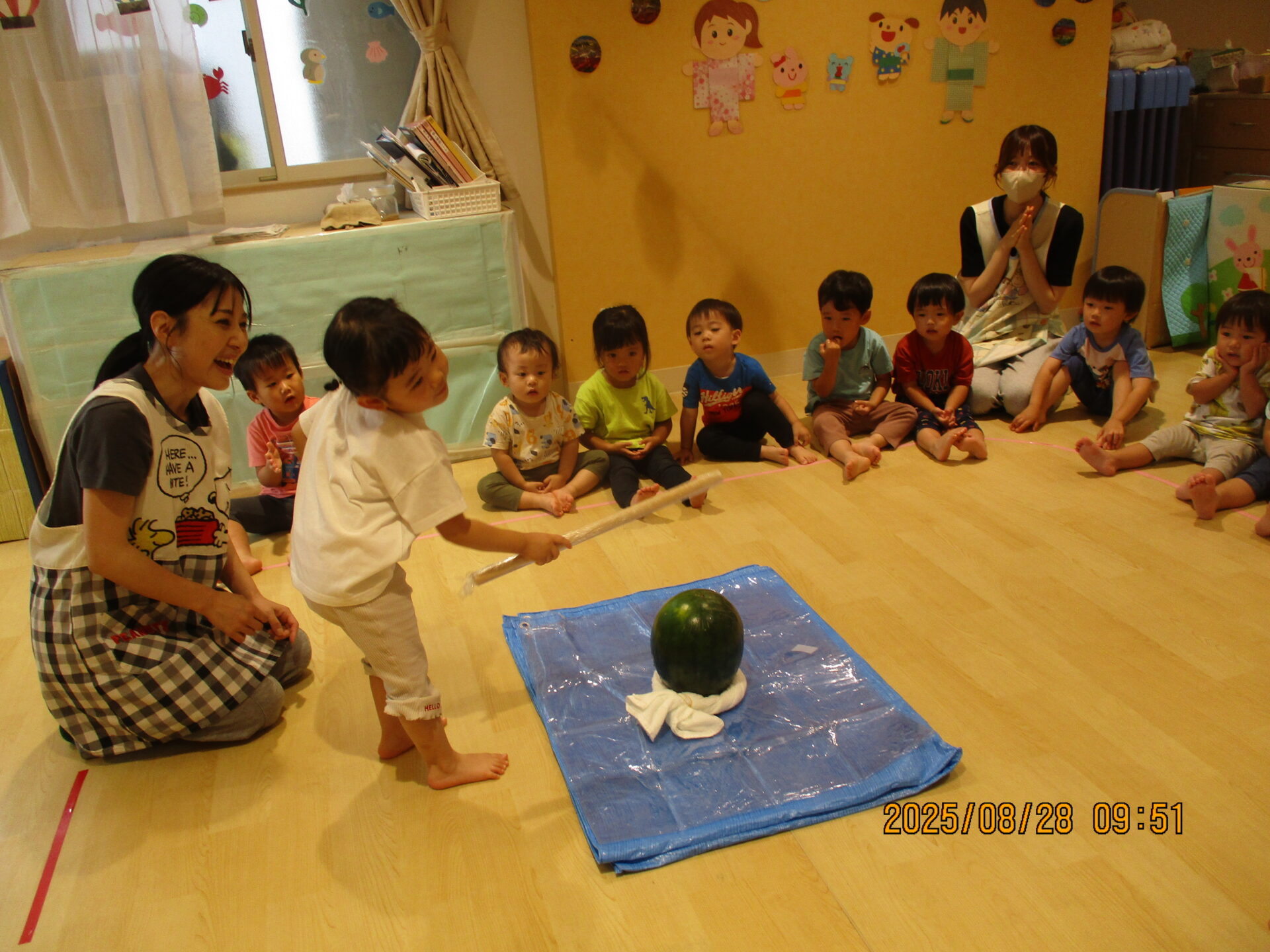前日の夏まつりに続いて、この日はすいか割りをしました🍉