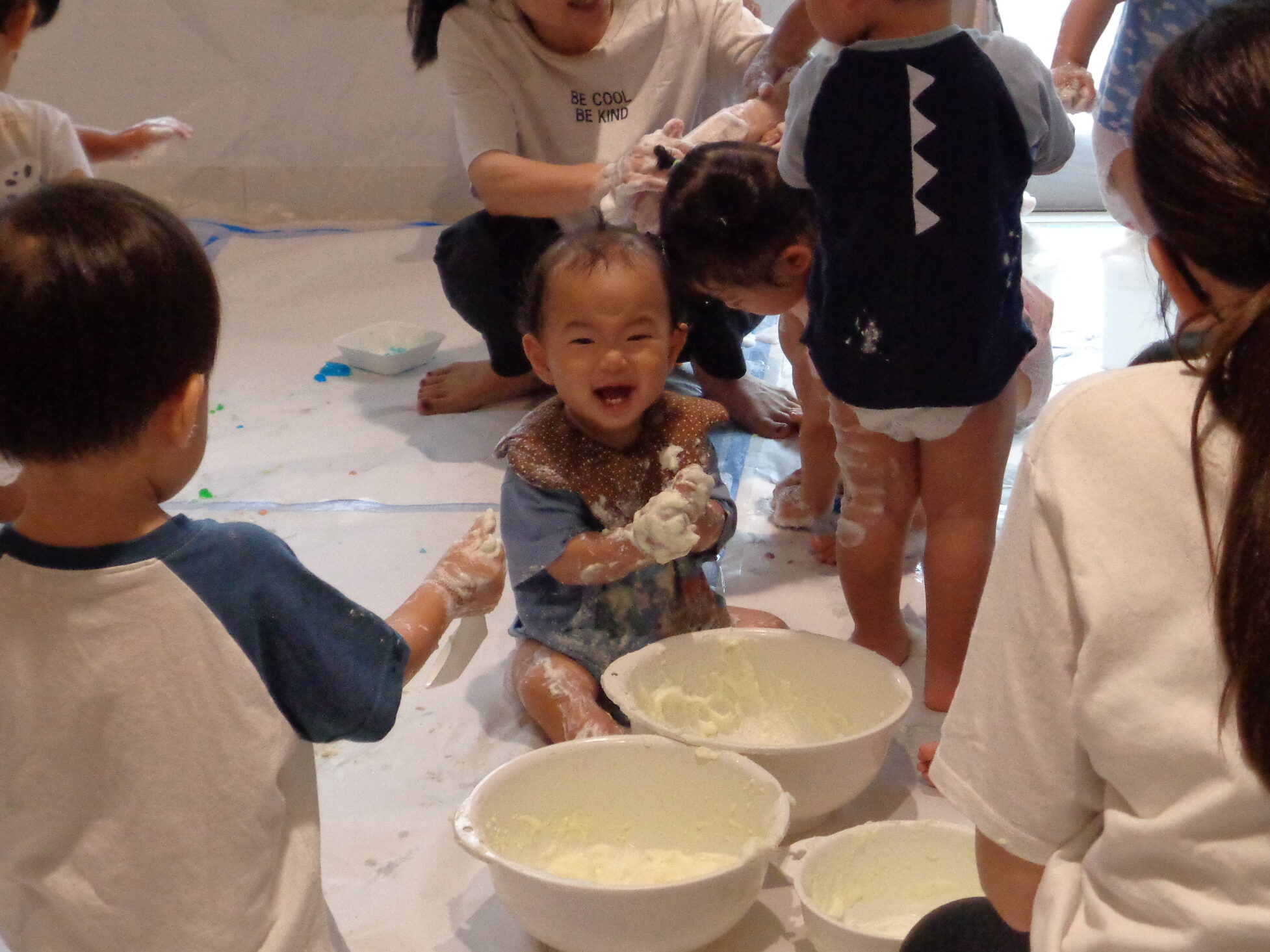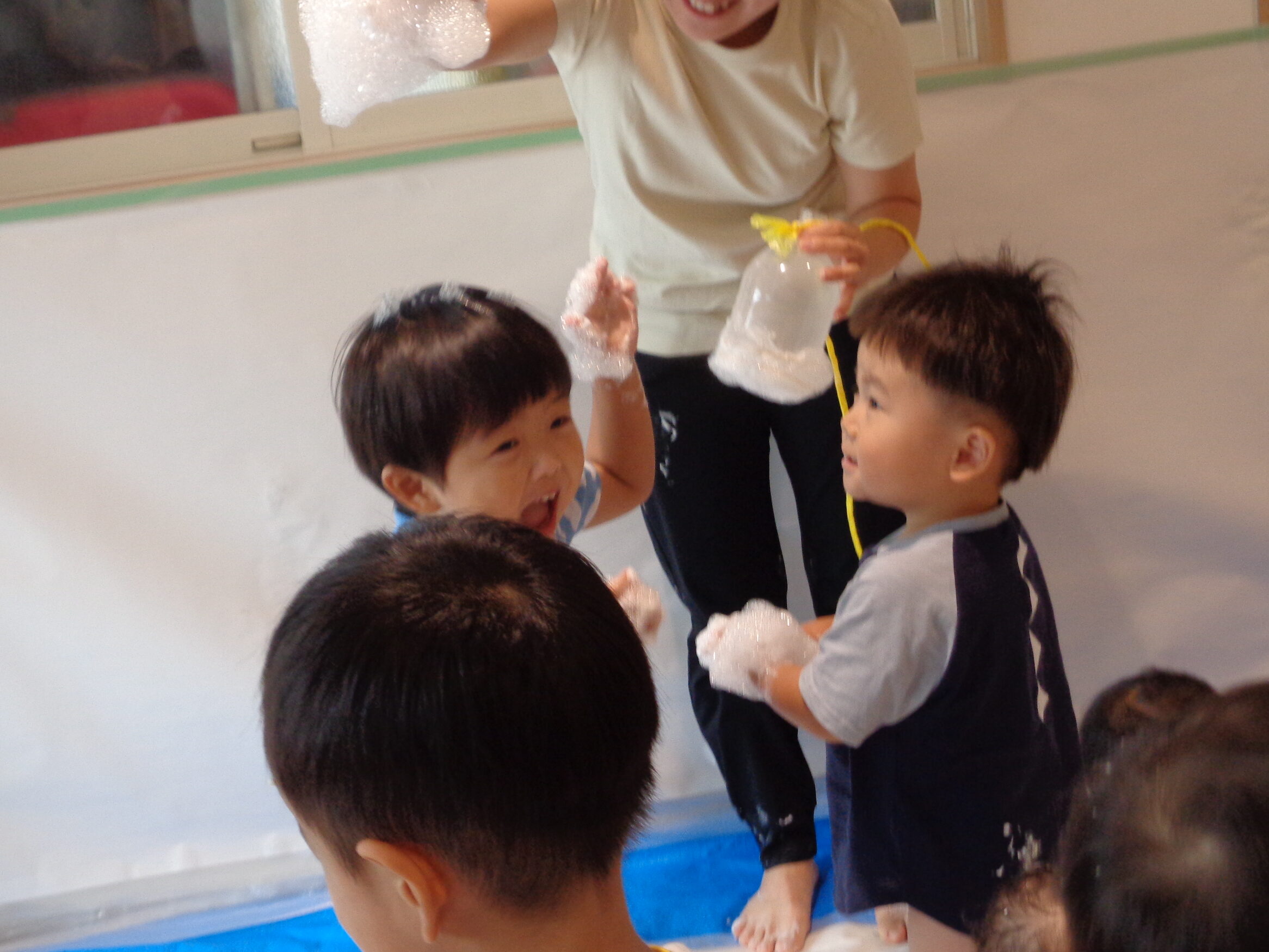 最初は泡の感触に慎重だった友だちも、周りの友だちが楽しむ姿に刺激を受け、ドキドキのハードルを乗り越えて遊び始め、どんどん笑顔に変わっていく姿に嬉しく感じました😊