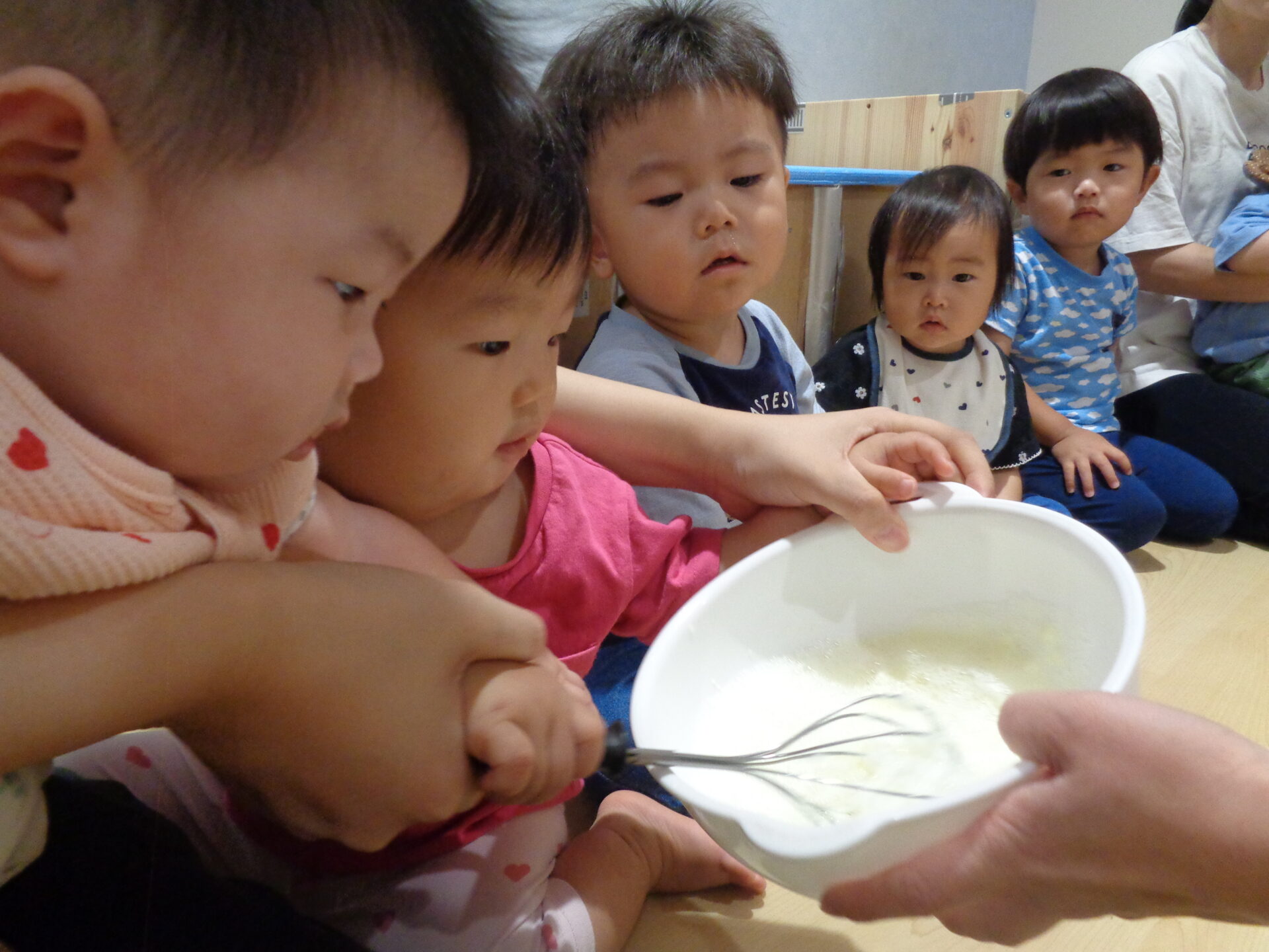 次は、みんなで順に泡立て器で混ぜて泡づくりをしました。