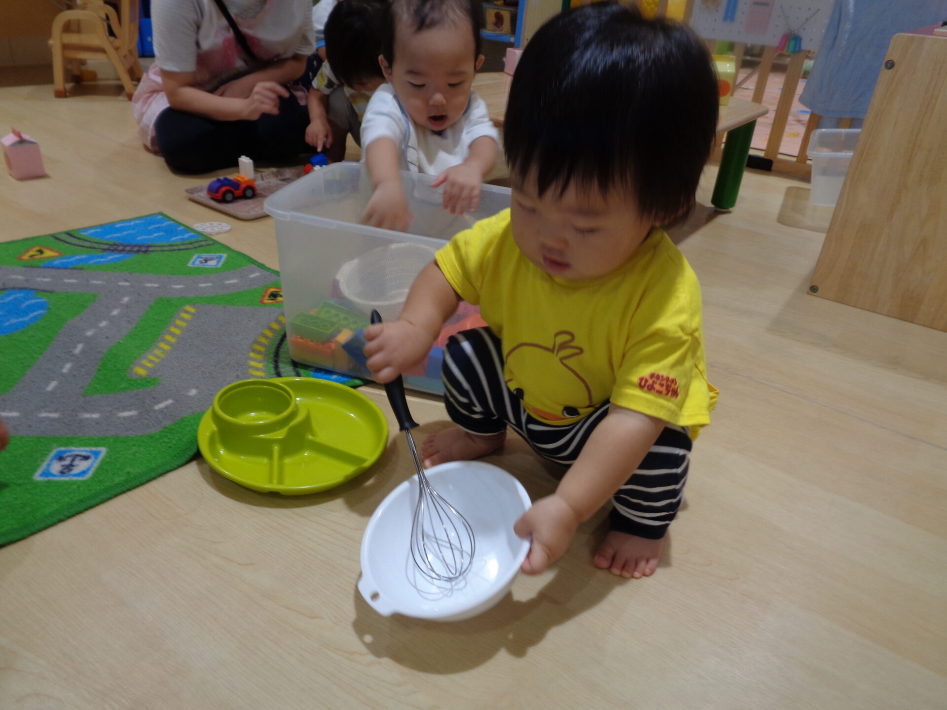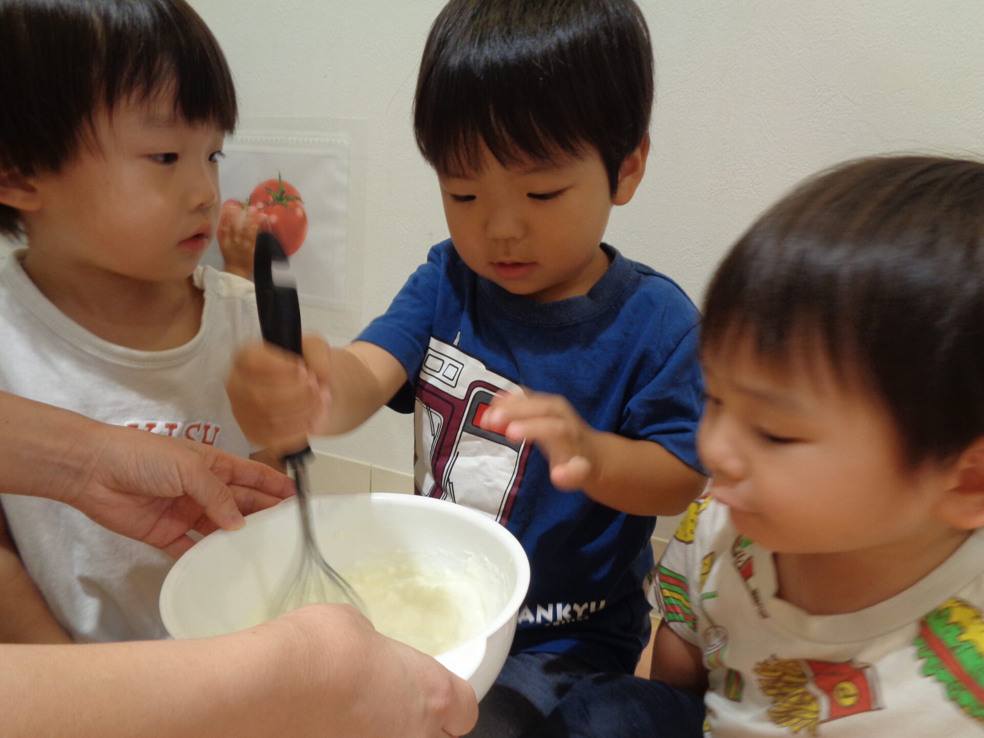 その日の夕方、ままごとコーナーに泡立て器を出しておくと、泡遊びの活動を思い出すように「まぜまぜ♪」とごっこ遊びを楽しむお友だちもいました🌟