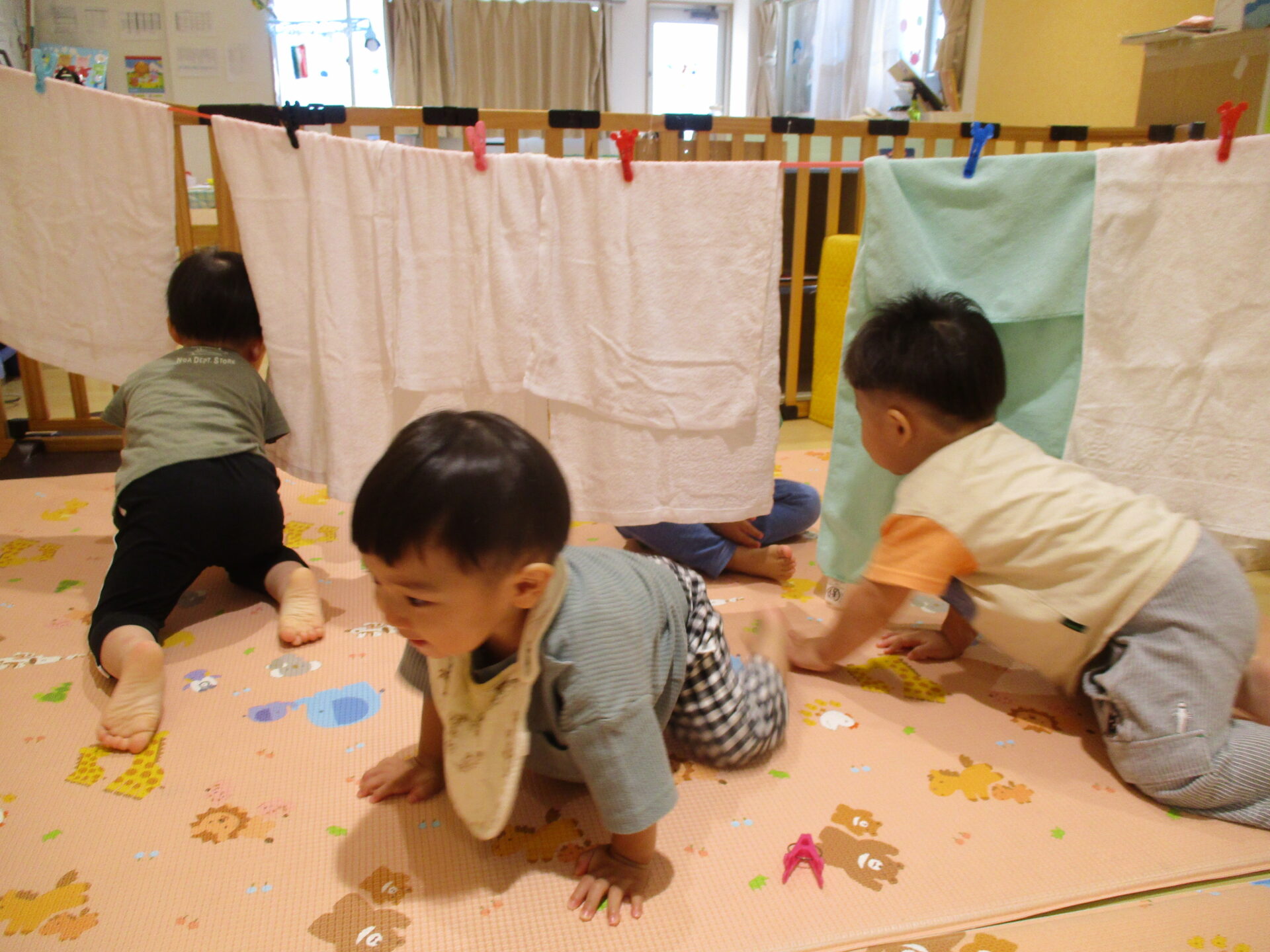その後は、干したタオルをカーテンにして下をくぐりました。