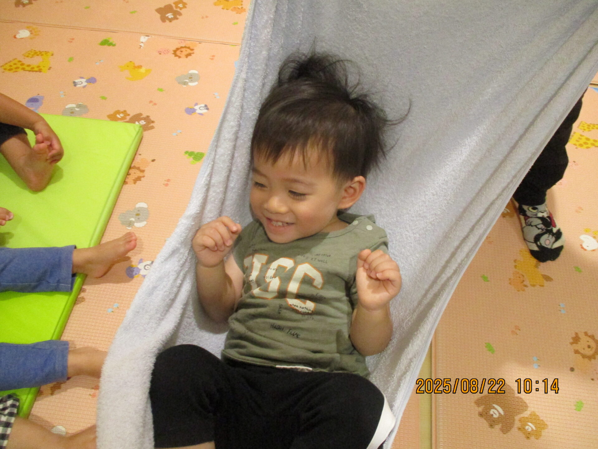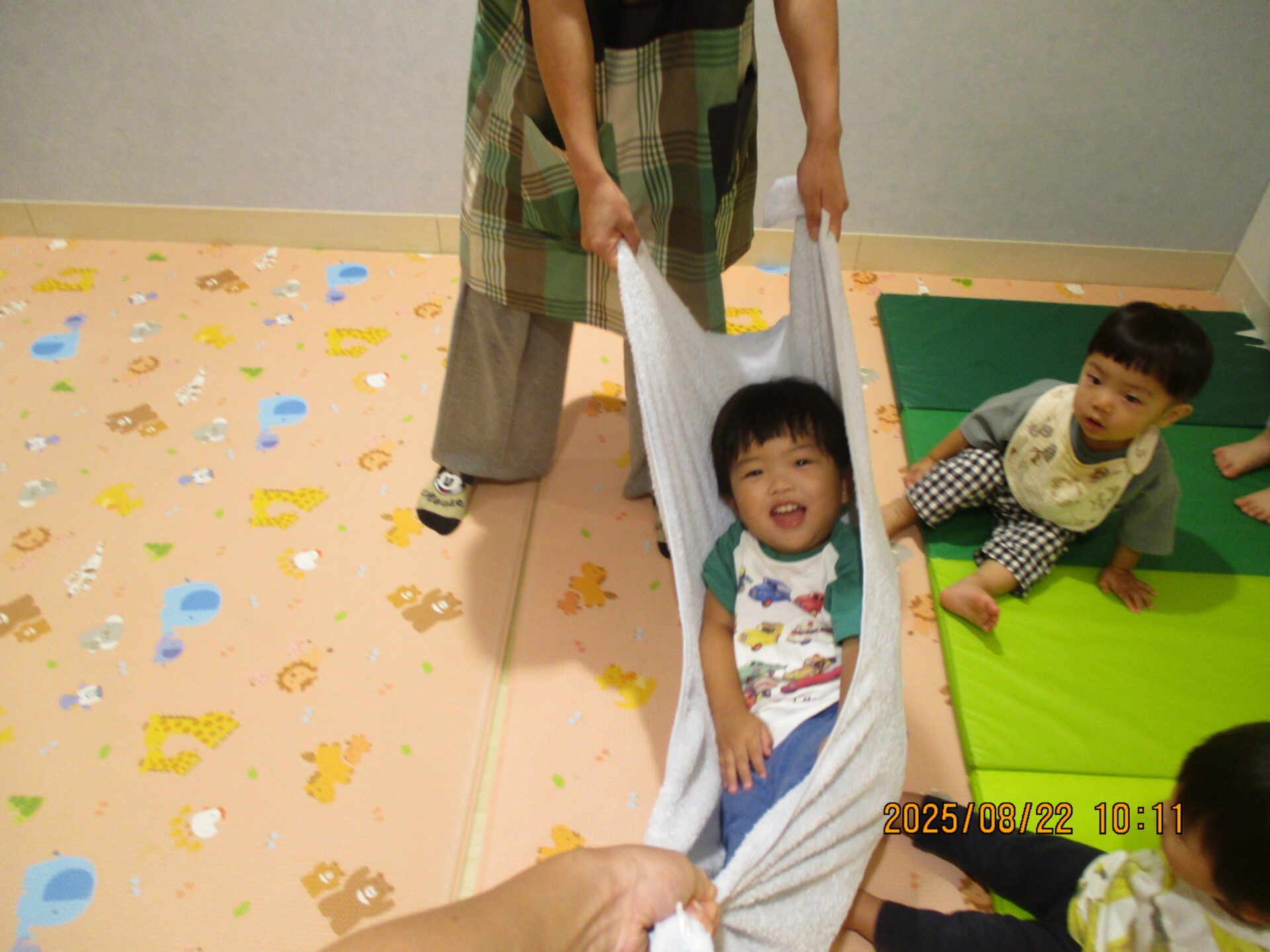 今度はバスタオルを使い、ひとりずつハンモックをしました。