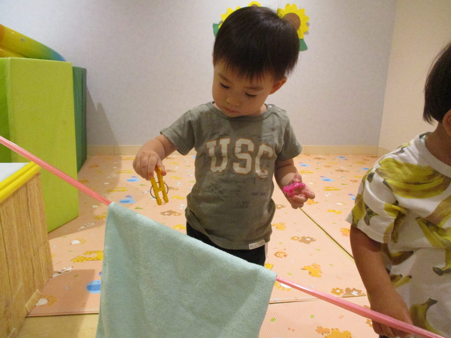お部屋のおもちゃにも洗濯ばさみを使うものを置いているので、だいぶ上手に挟めるようになりました。