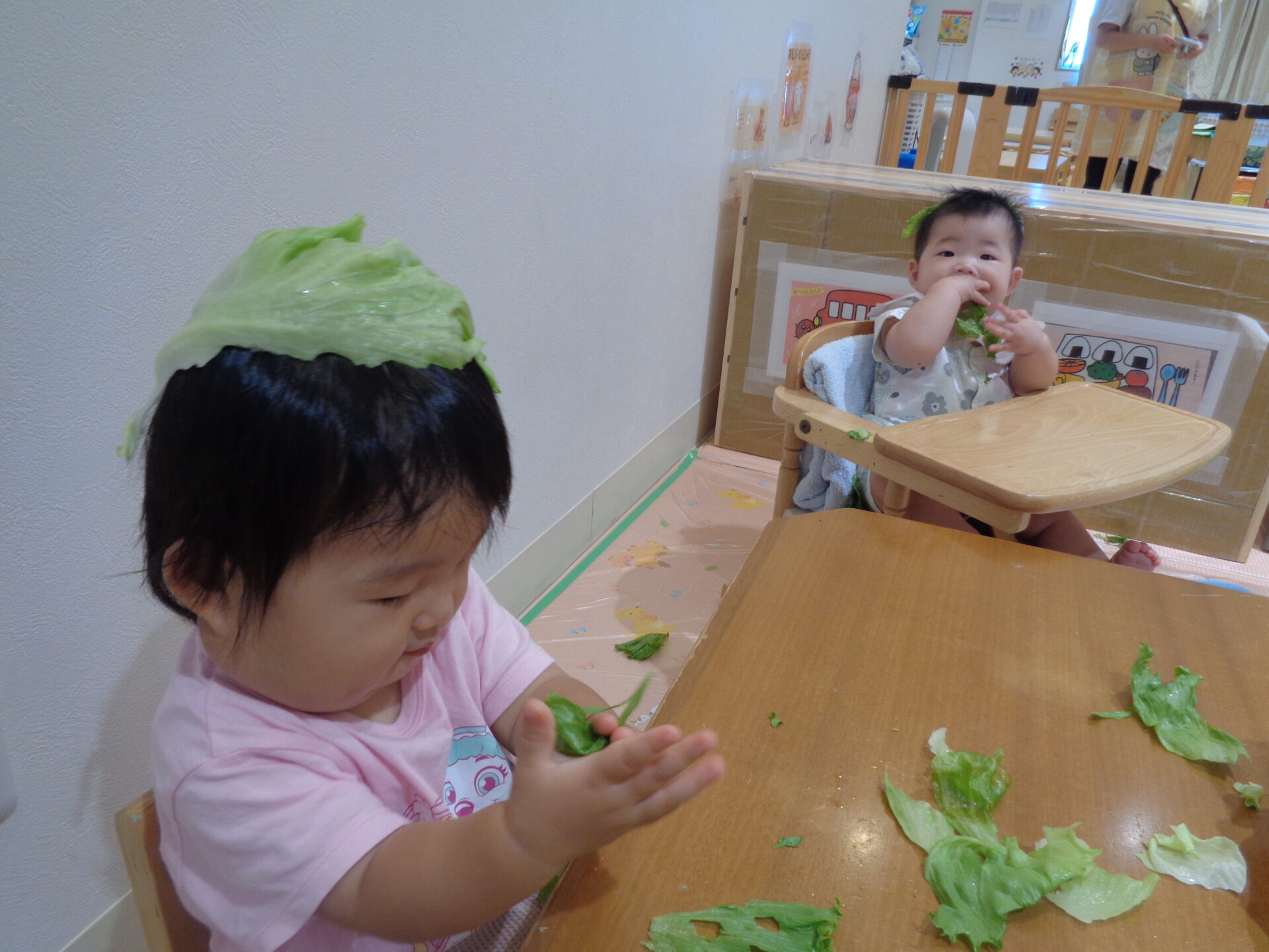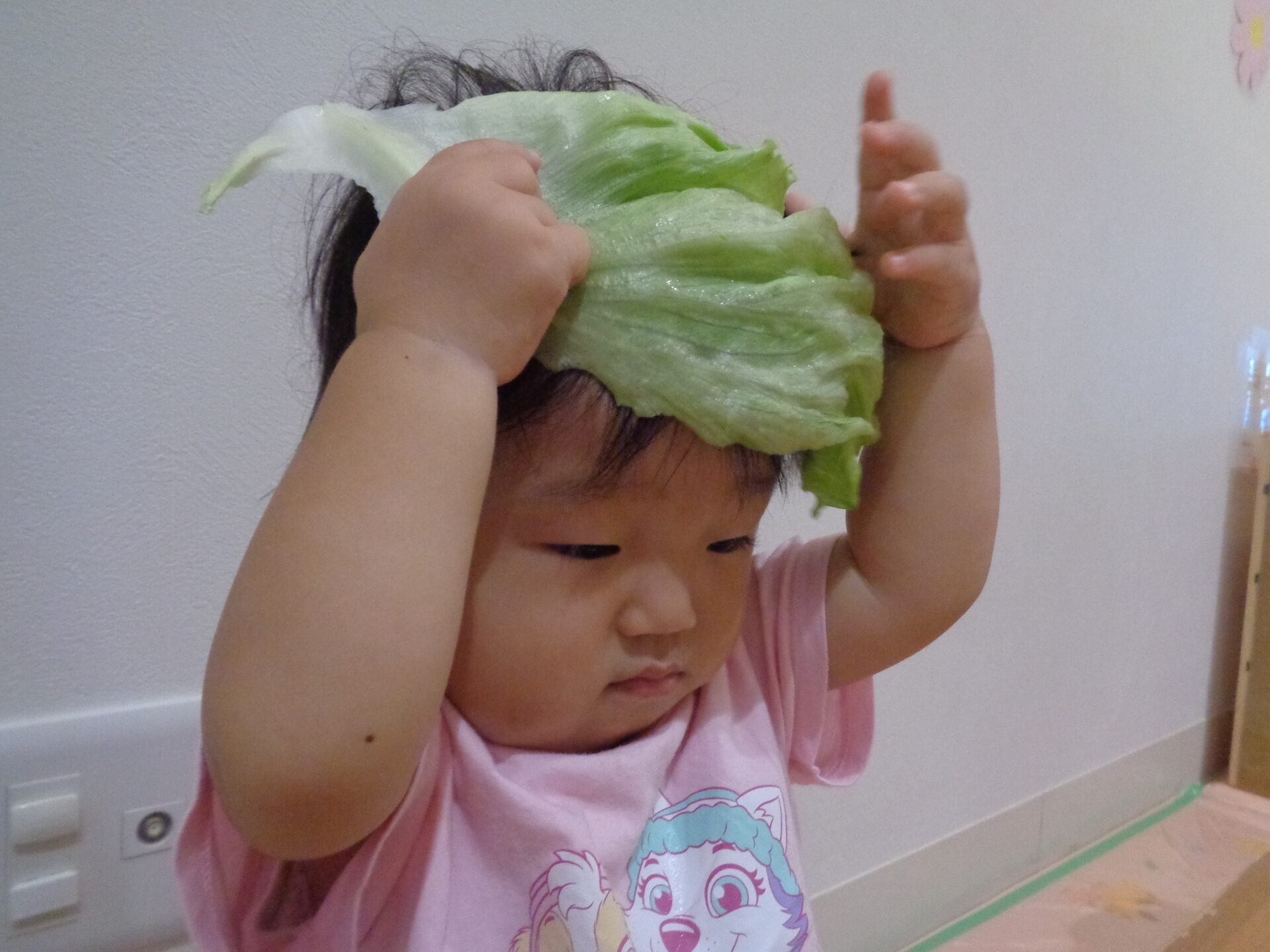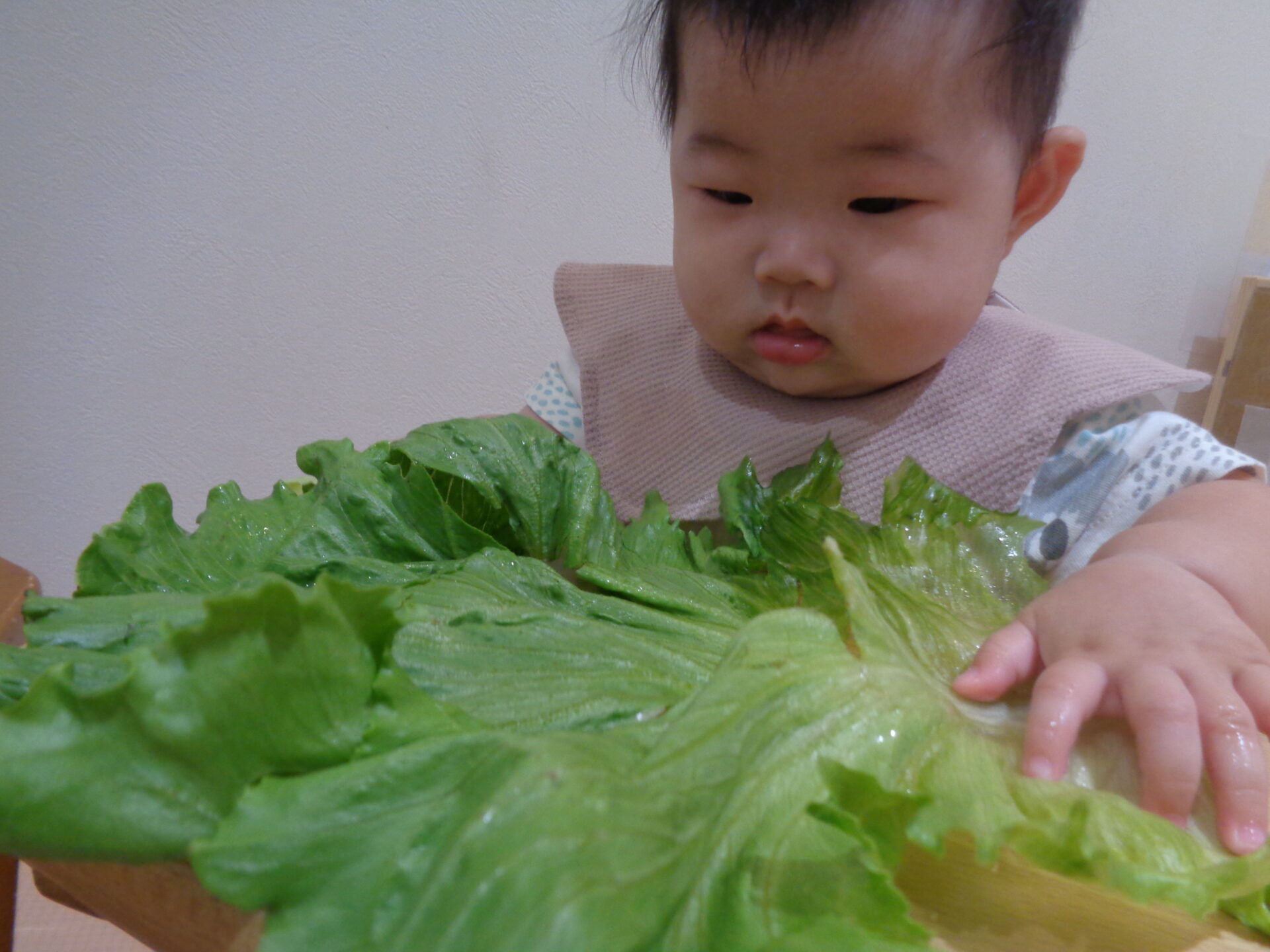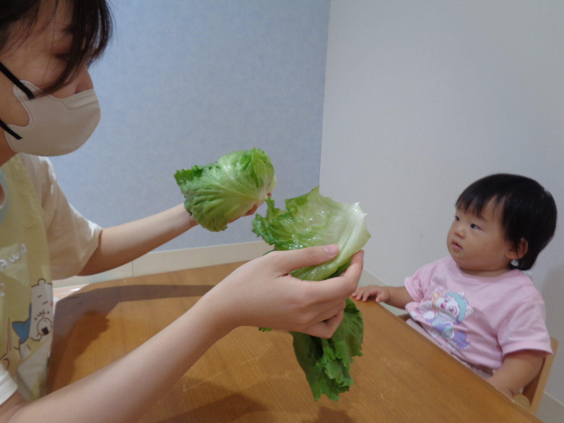 保育士が「こっちのほうが乗せやすいよ」と大きいレタスを渡して