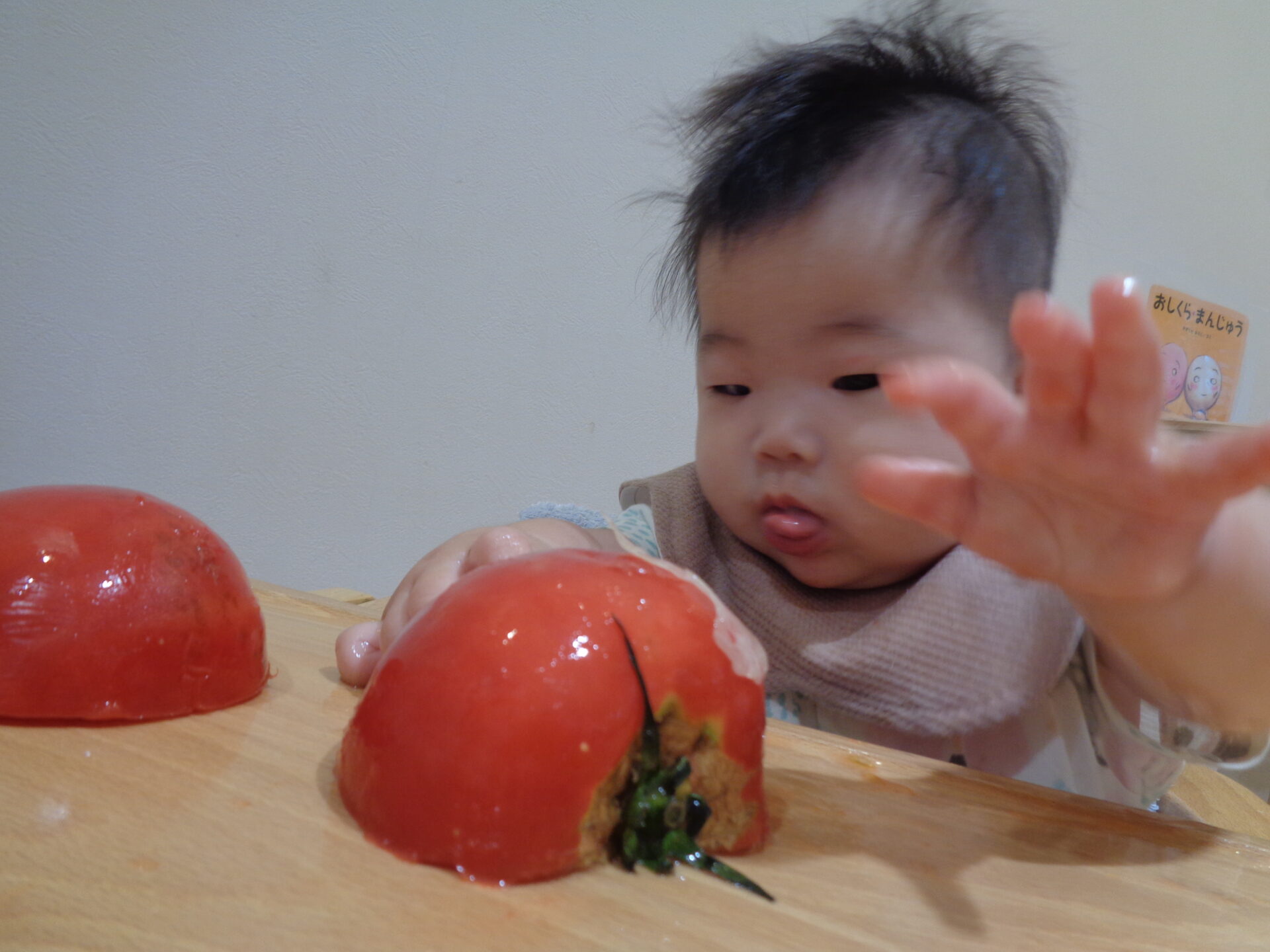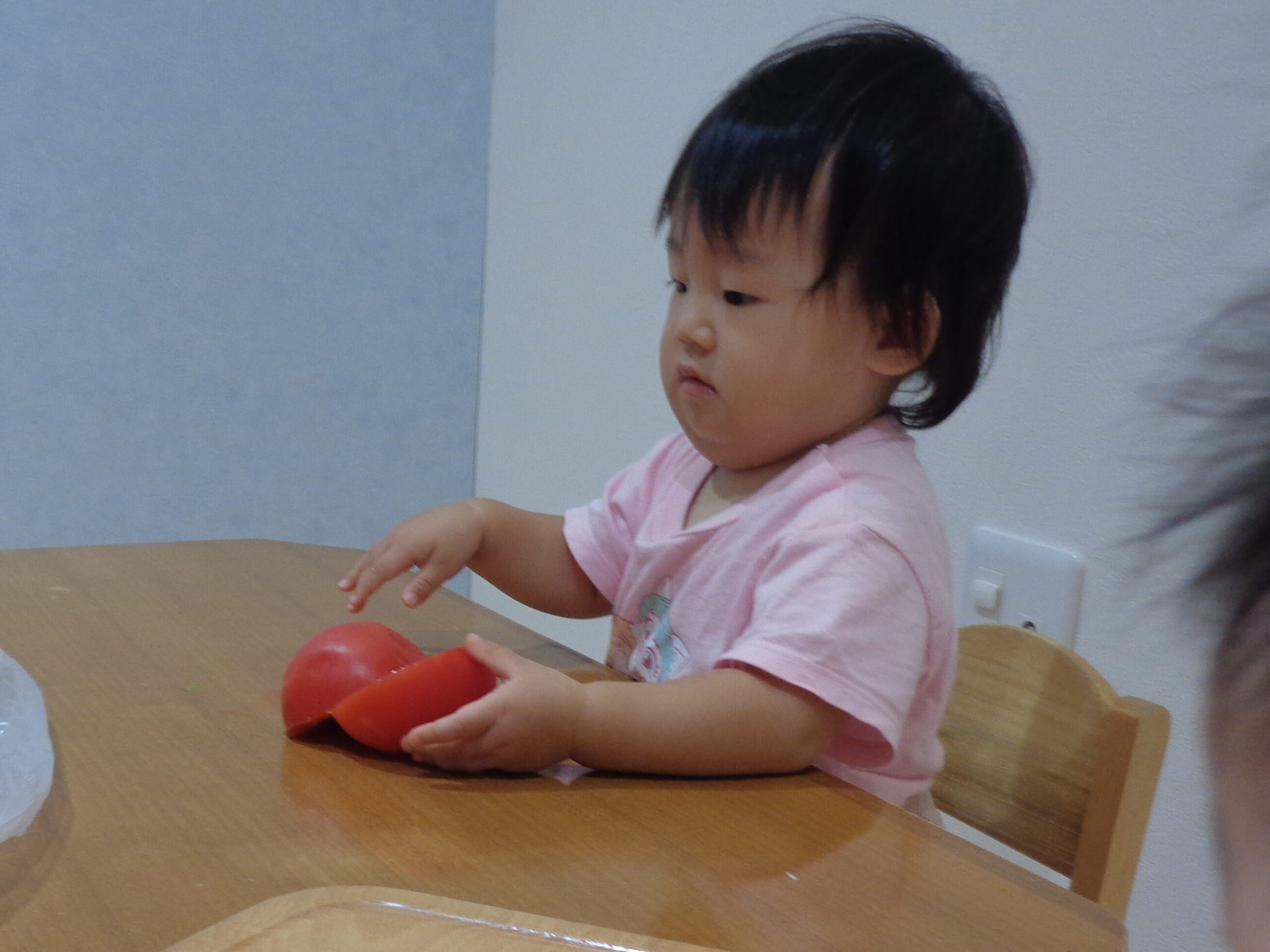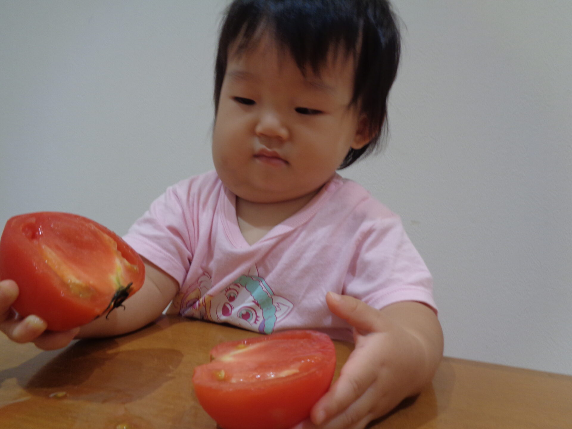 一方こちらのお友だちはトマトが切られたことが衝撃だったのか